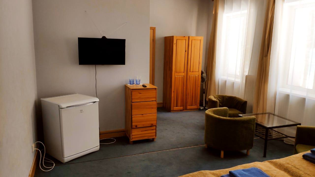 Уютный номер с отдельной ванной комнатой и туалетом. Номер оборудован всем необходимым: 4 кровати, кресла, холодильник, чайник, прикроватная тумба, шкаф, стол, телевизор с цифровым телевидением.