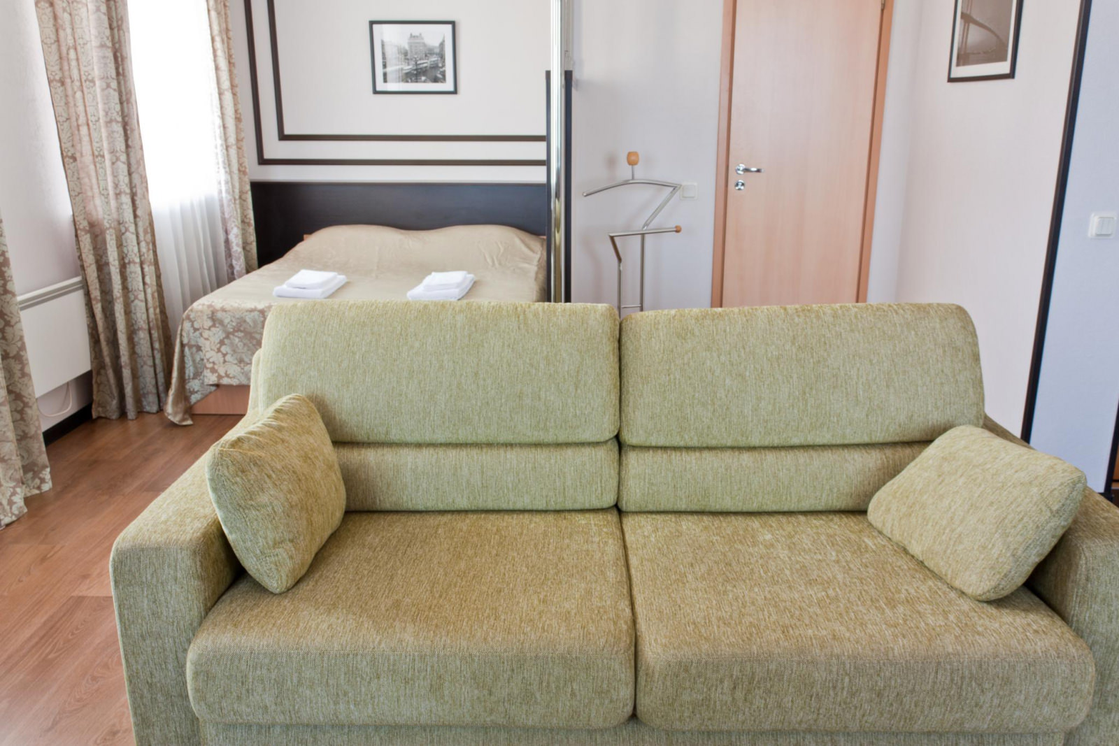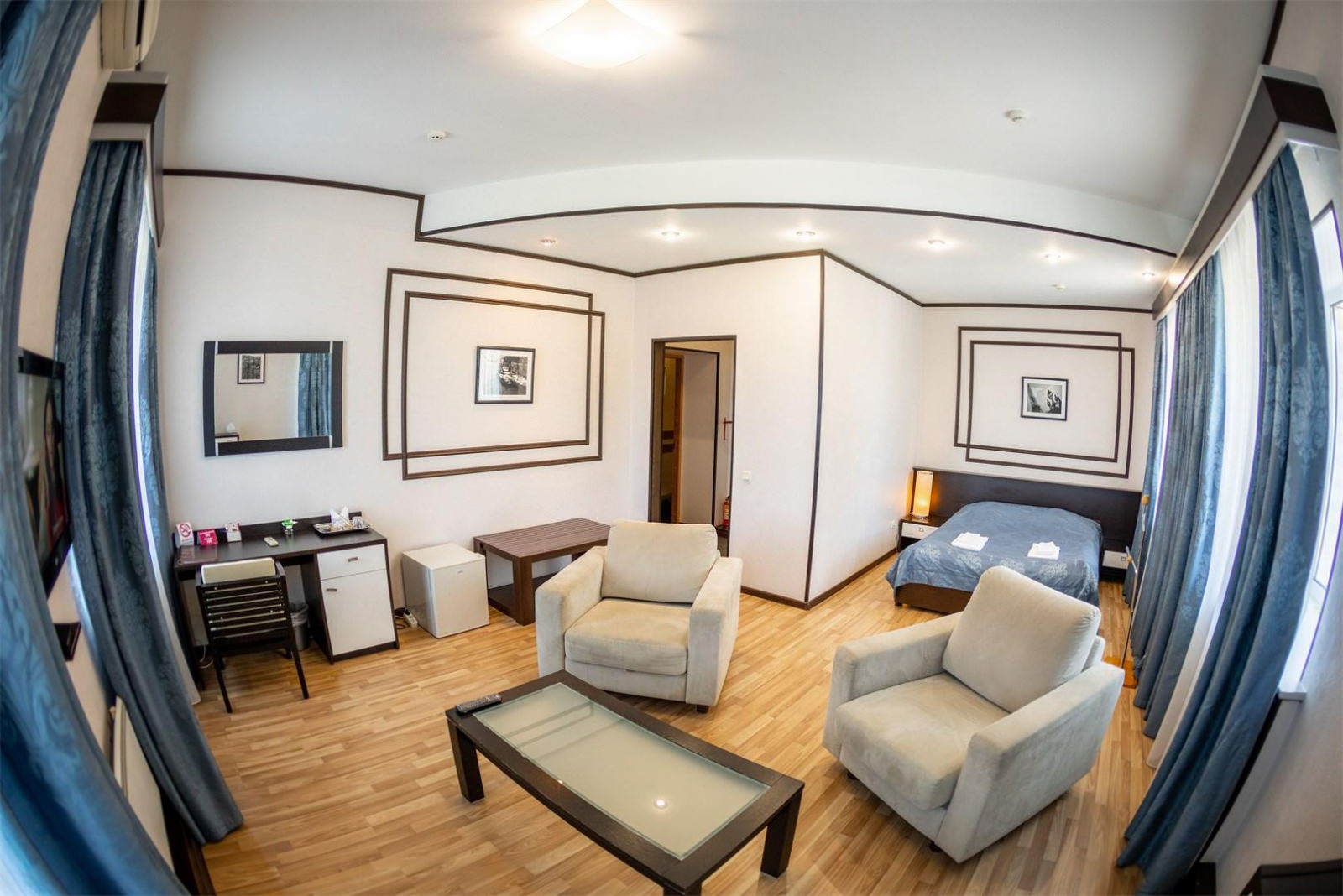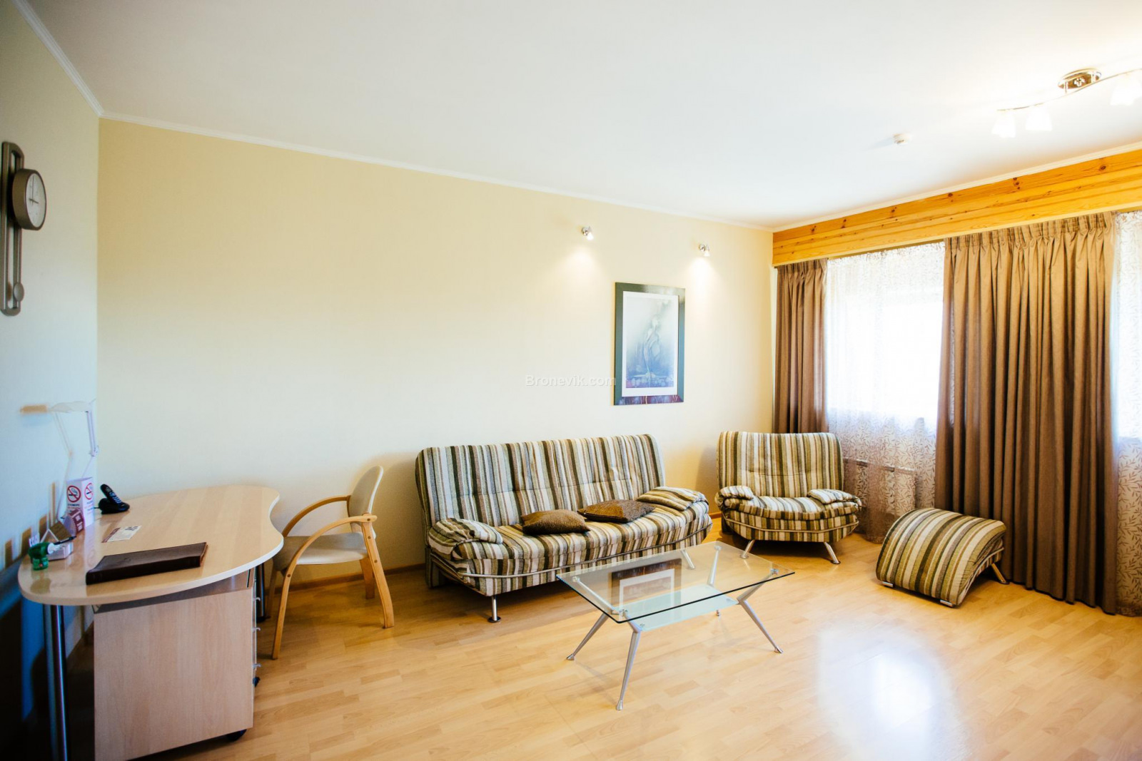 Расположение 3 этаж I линии Отеля. Комфортабельно оснащенный интерьер номера идеально подходит для деловых людей. Оснащение номера: две 1,5-спальные кровати, в гостиной двуспальный диван, телефон,DVD, рабочий стол, высокоскоростной Интернет (Wi-Fi), телевизор (спутниковое телевидение), кондиционер, индивидуальная система отопления, ванная комната (ванна, душ), фен.