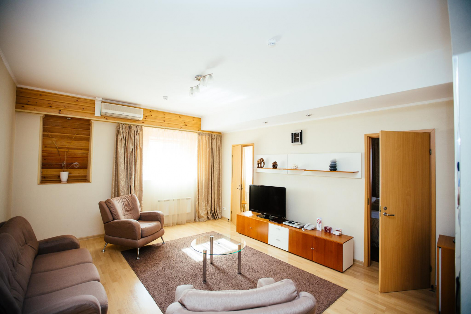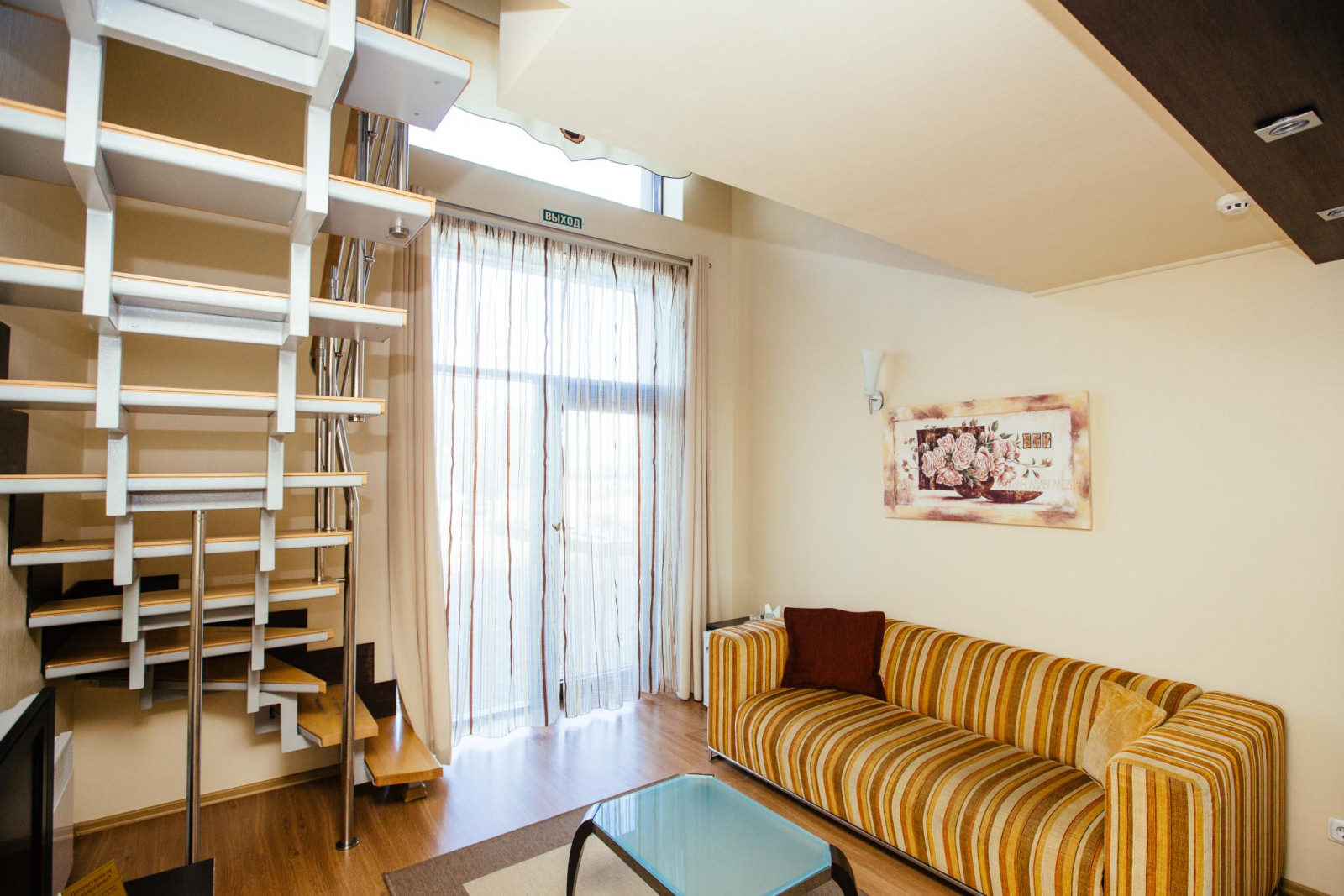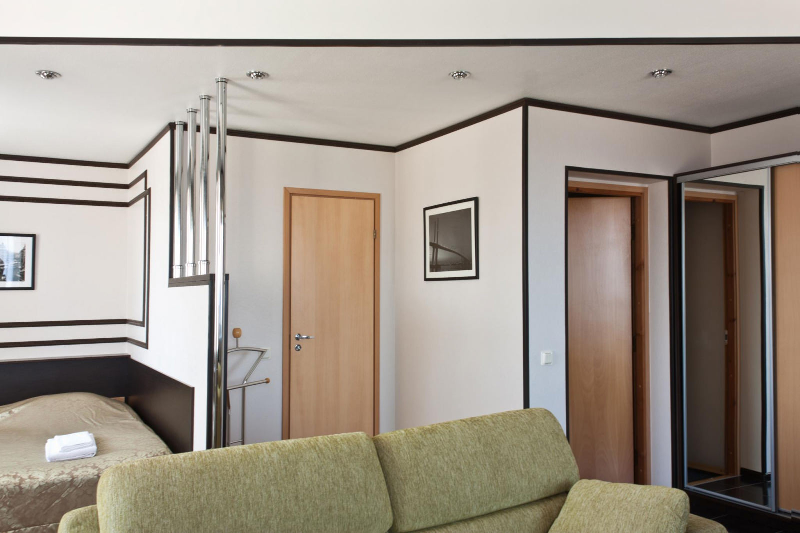 Расположение 3 этаж I линии Отеля. Комфортабельно оснащенный интерьер номера идеально подходит для деловых людей. Оснащение номера: две 1,5-спальные кровати, в гостиной двуспальный диван, телефон,DVD, рабочий стол, высокоскоростной Интернет (Wi-Fi), телевизор (спутниковое телевидение), кондиционер, индивидуальная система отопления, ванная комната (ванна, душ), фен.