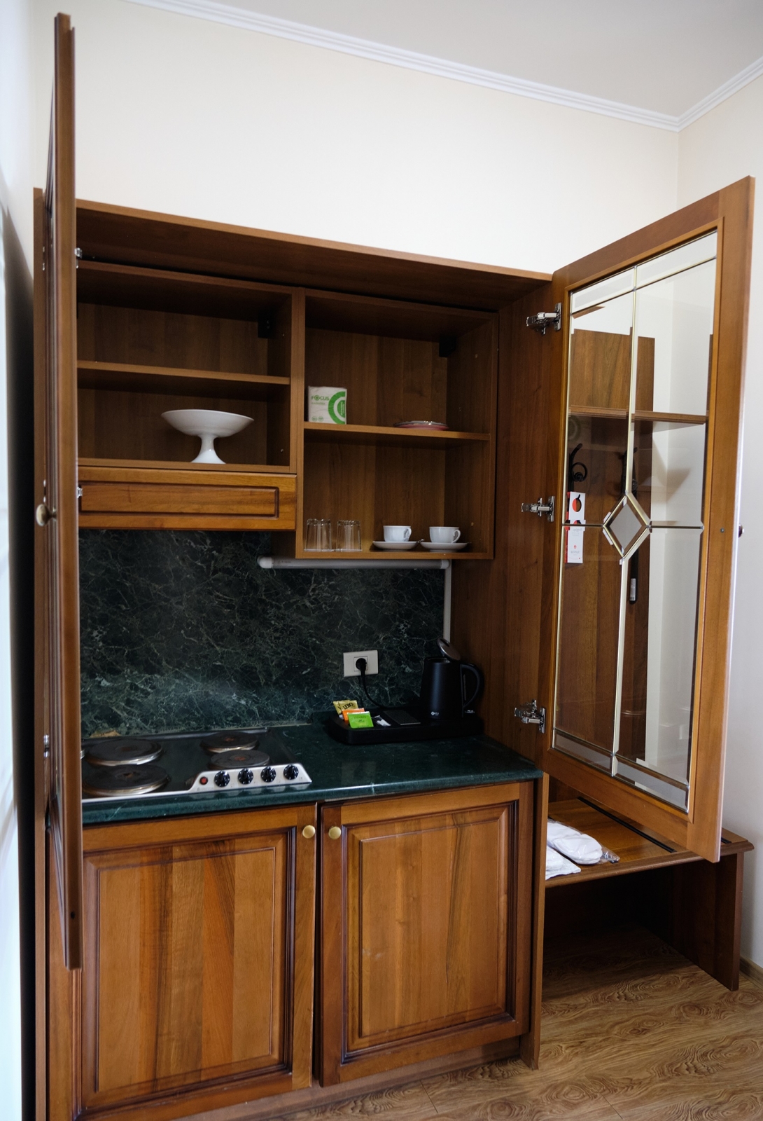 Площадь номера - 60 кв.м. 2 осн. места. 2 доп. места. Мебель: диван, зеркало, кресла, кровать двуспальная/ две полутороспальные кровати, прикроватные тумбочки, столик туалетный, тумба под телевизор, шкаф. Мини-кухня. Оборудование: набор посуды, сейф, телевизор ЖК (2), телефон, чайный набор посуды, электрочайник. Санузел: биде, с ванной, тапочки, туалетные принадлежности, фен, халат. Сервис: Wi-Fi бесплатно, смена полотенец (по требованию), смена постельного белья, уборка номера, услуги внутренней телефонной связи.