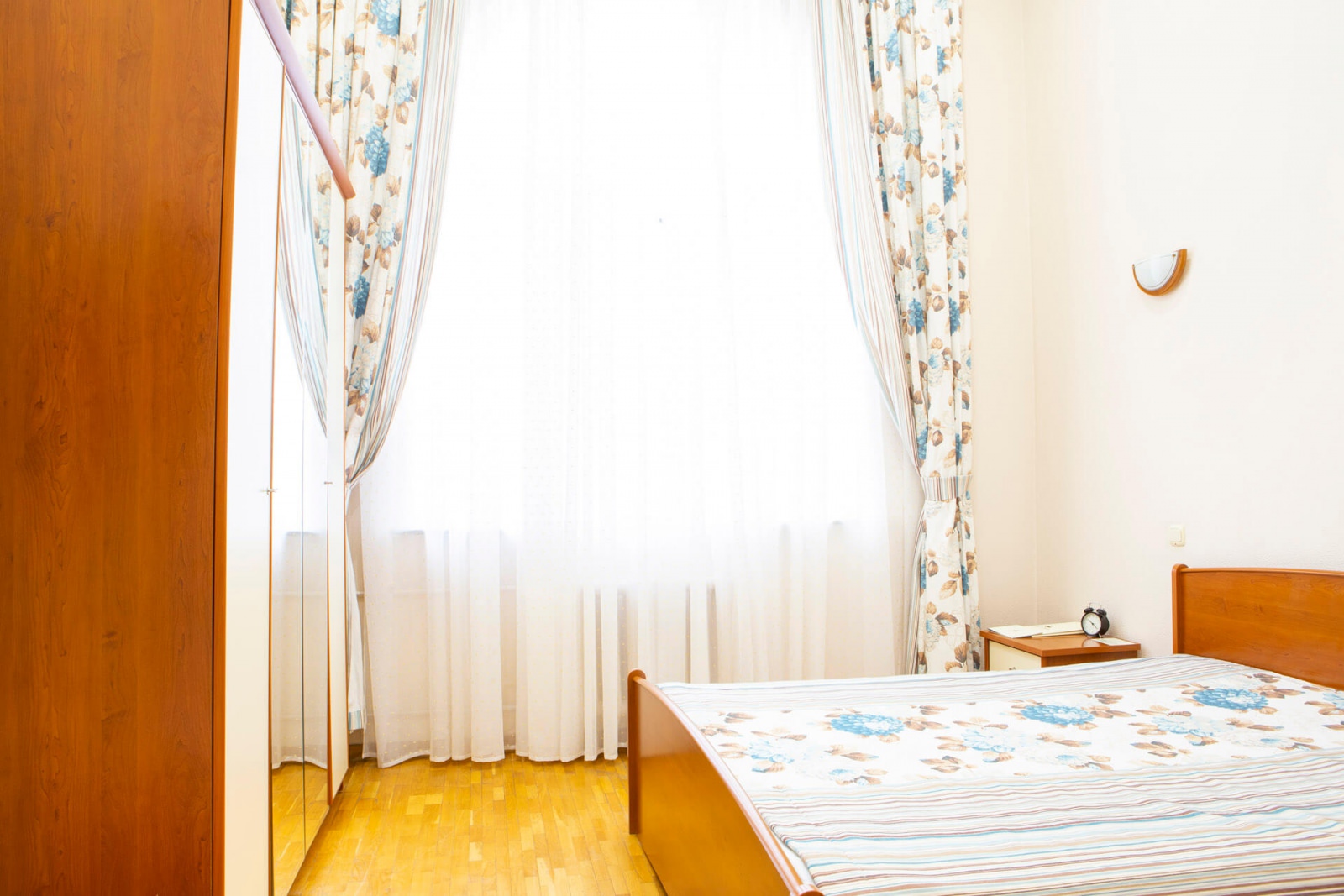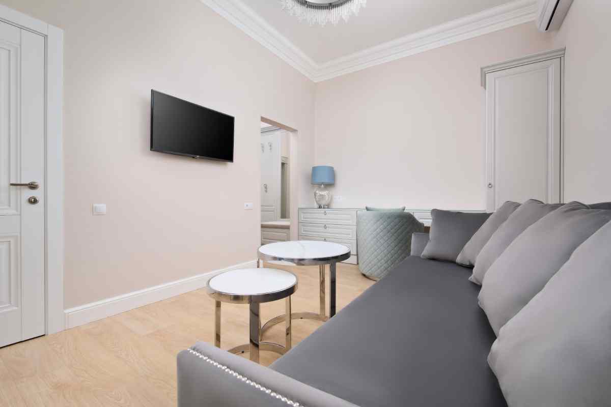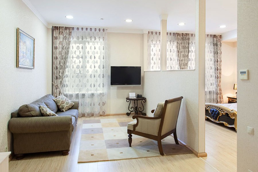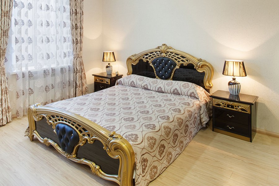 Первая комната является спальней. Ночлег осуществляется на большой двуспальной кровати в изысканном стиле, рядом установлены прикроватные тумбочки со светильниками. Вторая комната — гостиная. Здесь гости будут проводит совместный досуг на мягкой мебели (диване и креслах), смотреть телевизор. Интерьер комнат классический, а дополняет его элегантность красивая мебель и декор.