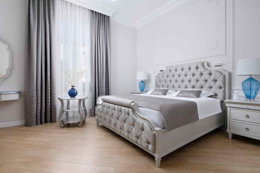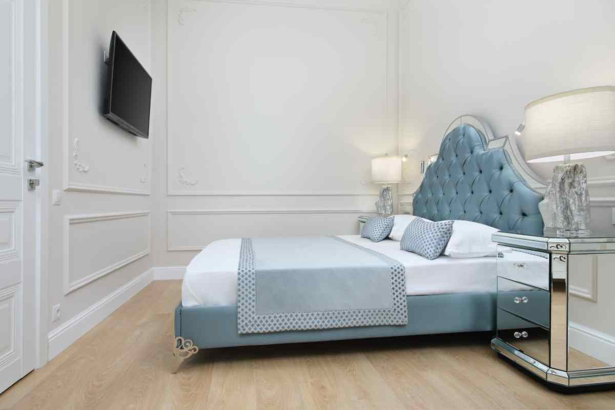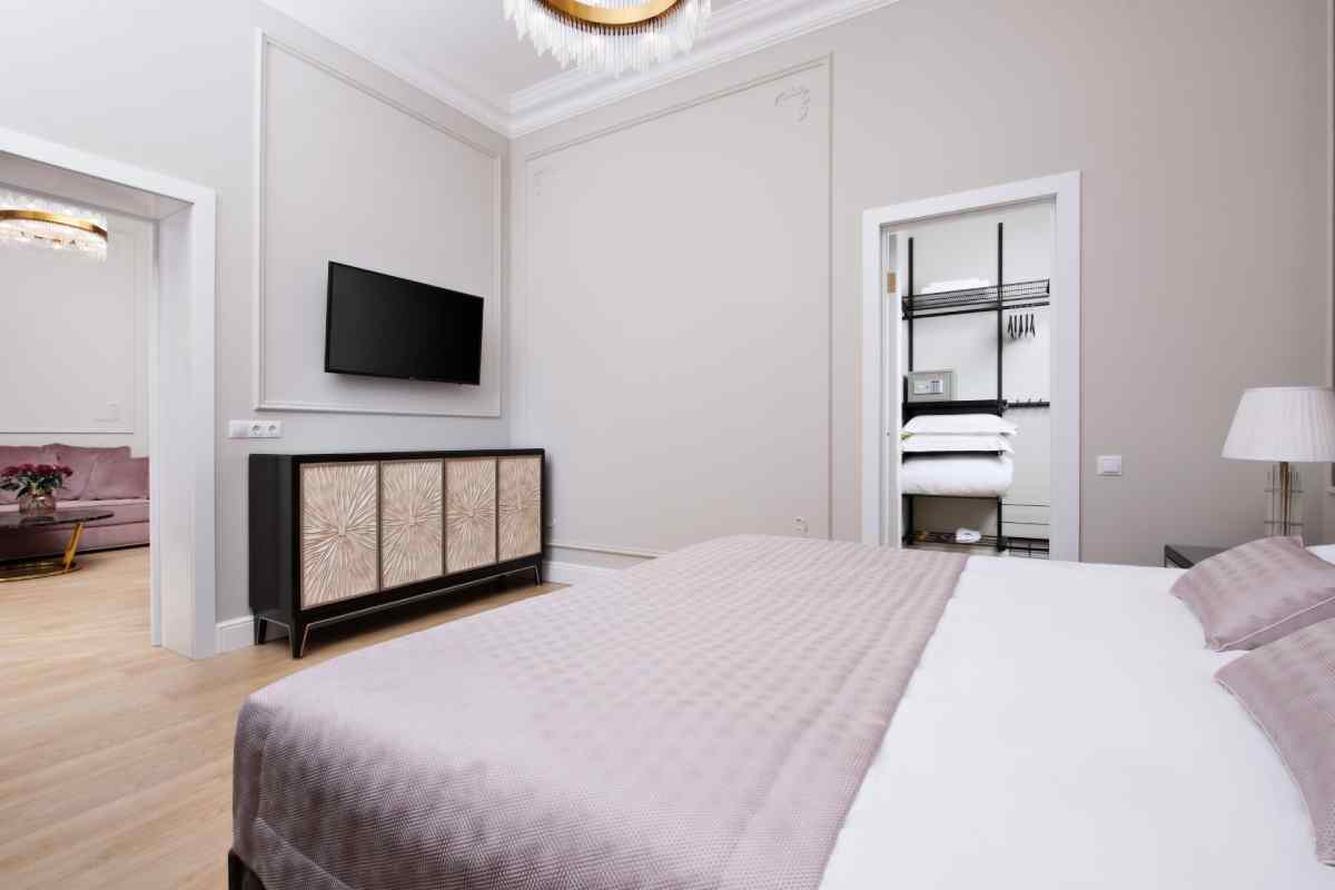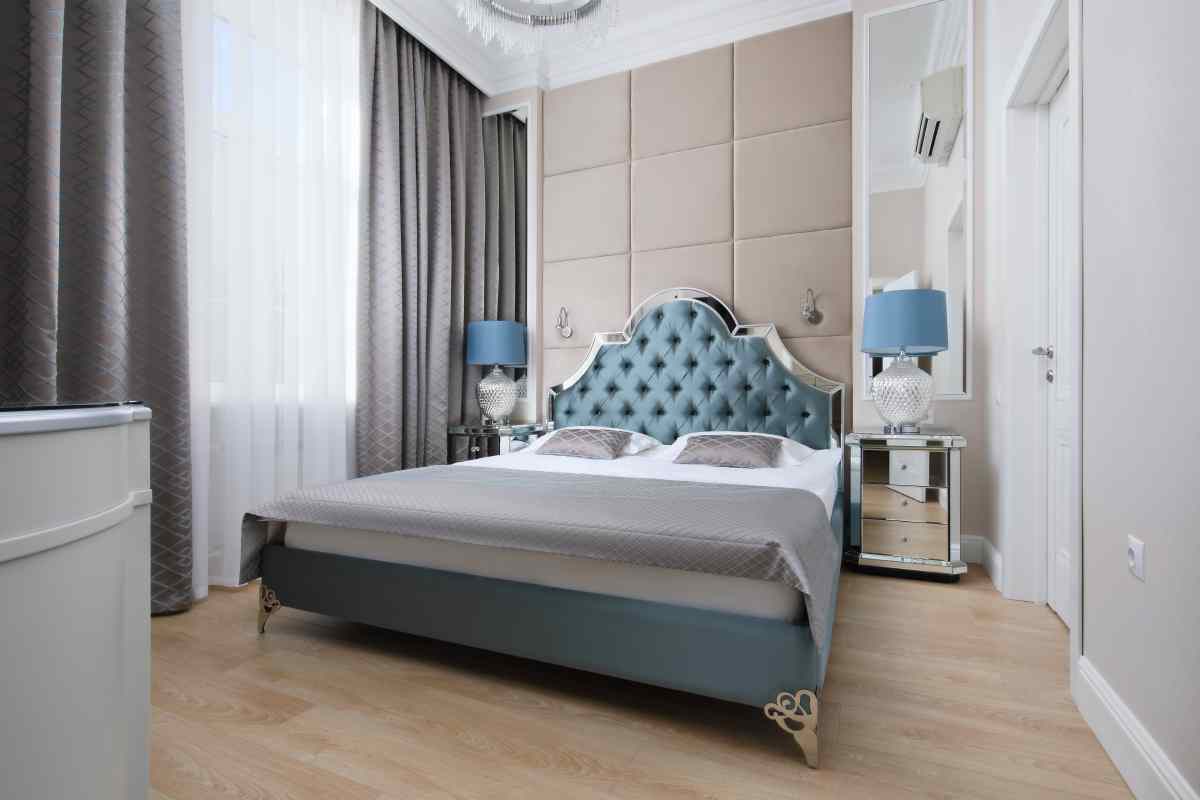 Первая комната является спальней. Ночлег осуществляется на большой двуспальной кровати в изысканном стиле, рядом установлены прикроватные тумбочки со светильниками. Вторая комната — гостиная. Здесь гости будут проводит совместный досуг на мягкой мебели (диване и креслах), смотреть телевизор. Интерьер комнат классический, а дополняет его элегантность красивая мебель и декор.