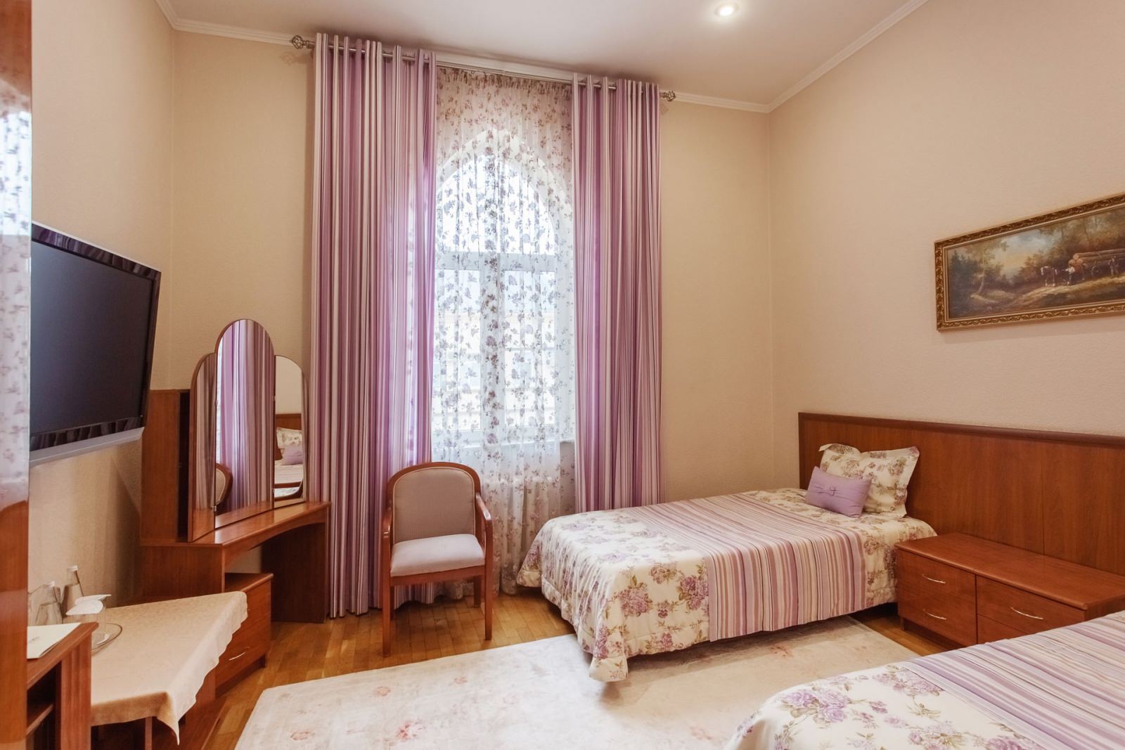Однокомнатный номер с двуспальной кроватью, либо с двумя полутороспальными.