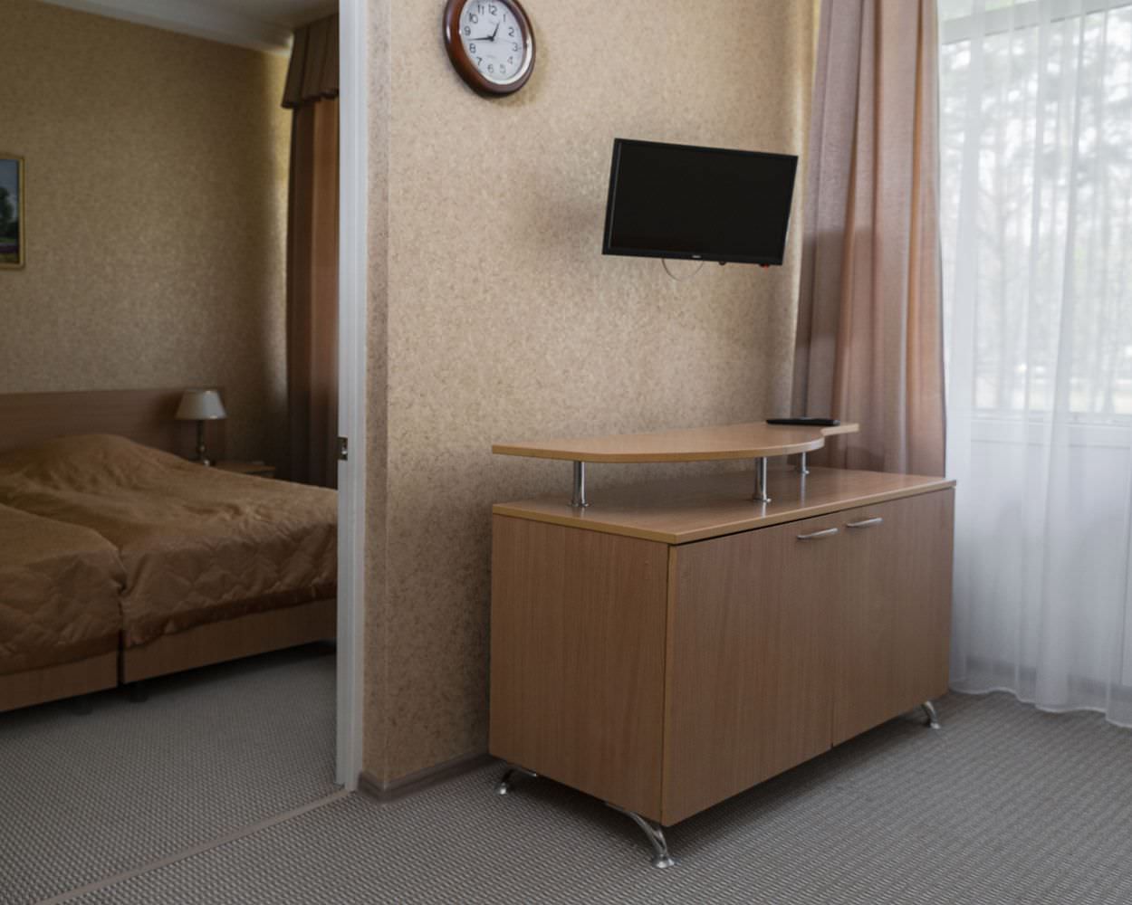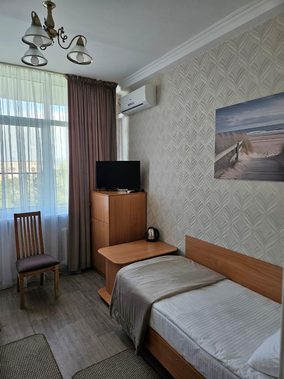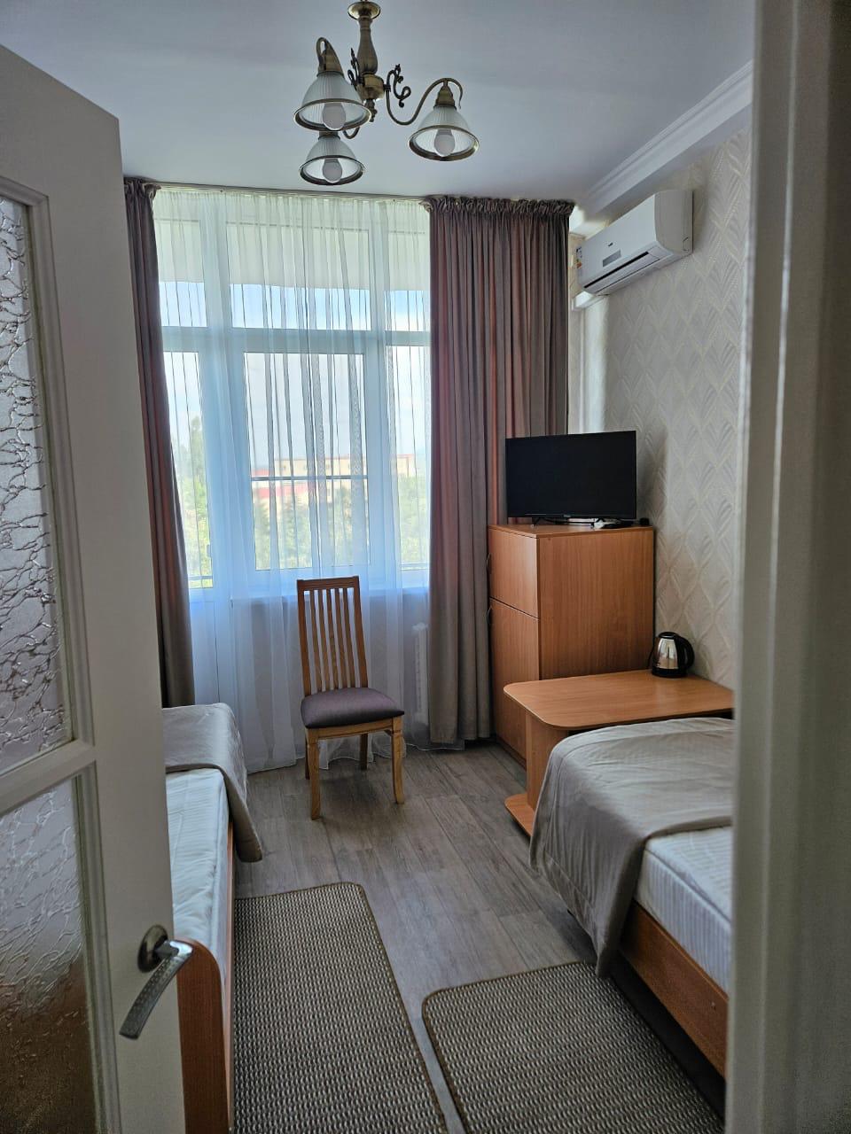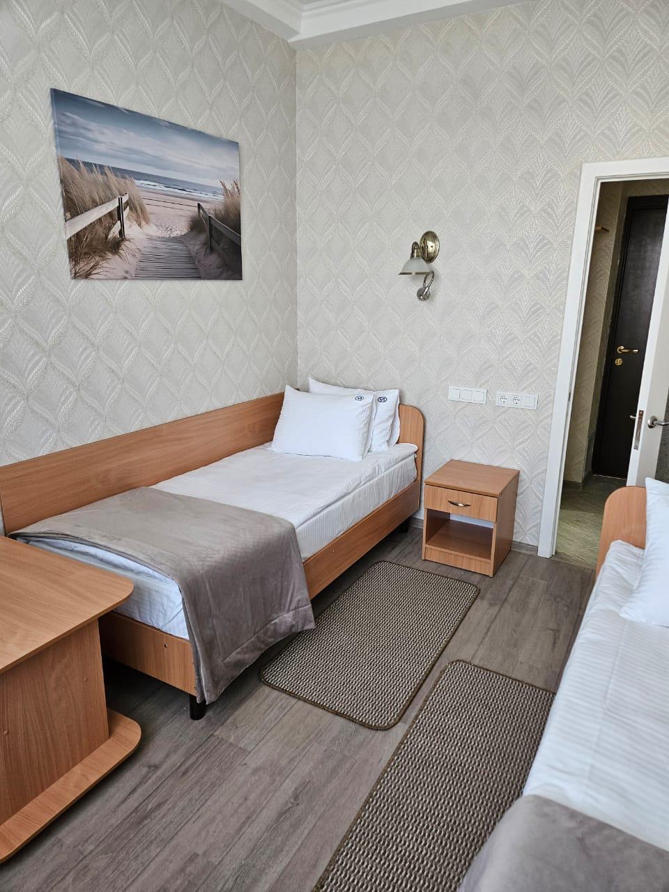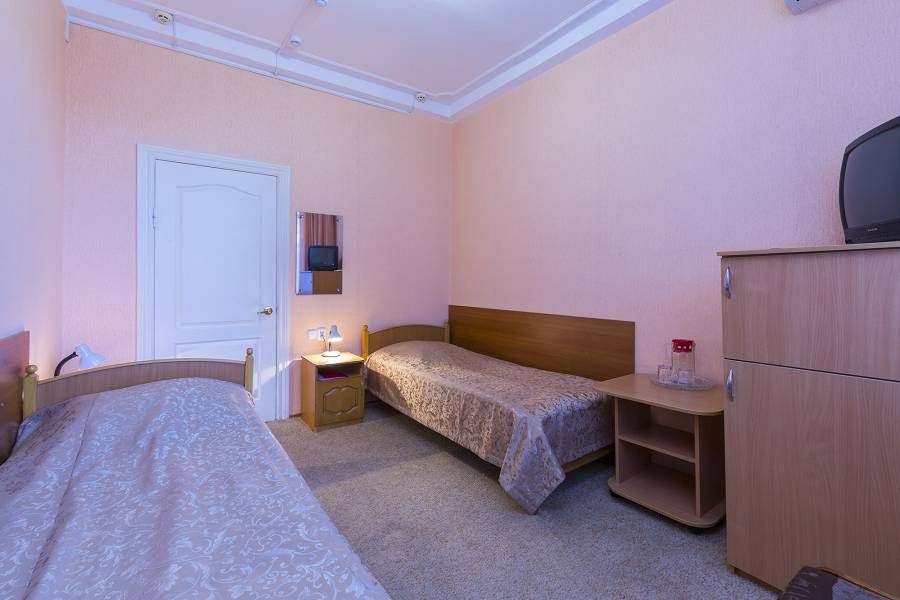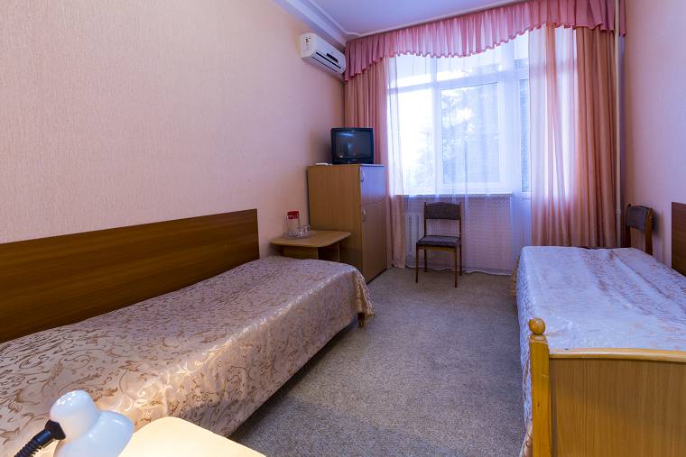 Площадь номера - 24 кв.м. 2 осн. места. 3 доп. места. Балкон. Мебель: диван раскладной, зеркало, кровати односпальные /одна двуспальная кровать, прикроватные тумбочки, стол, столик журнальный, стул, шкаф-купе. Оборудование: гладильная доска, кондиционер, сейф (- только в номерах 1 корпуса), телевизор, телефон, утюг, холодильник. Санузел: с ванной, фен. Сервис: смена полотенец (1 раз в 5 дней), смена постельного белья (1 раз в 5 дней), уборка номера (1 раз в день).