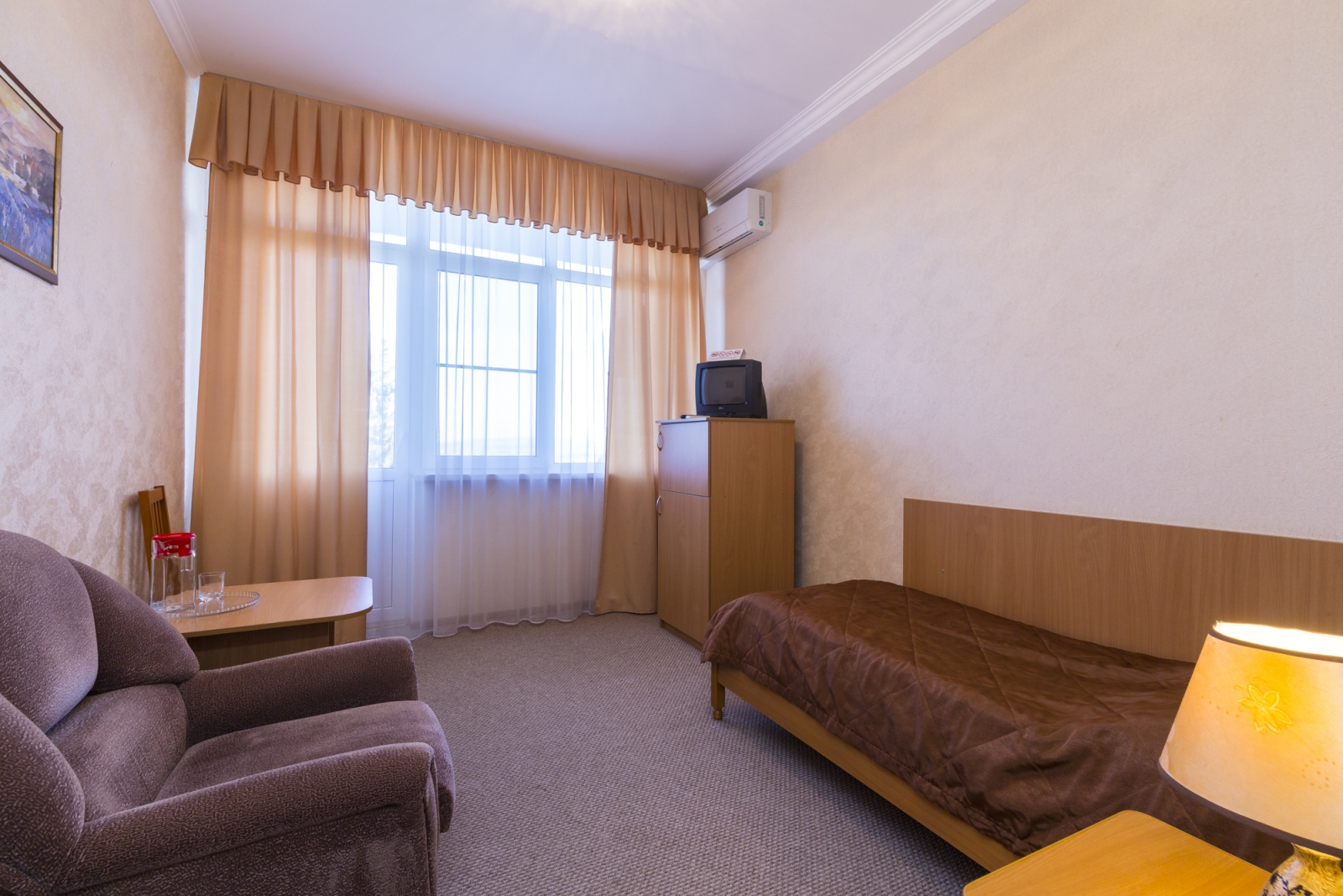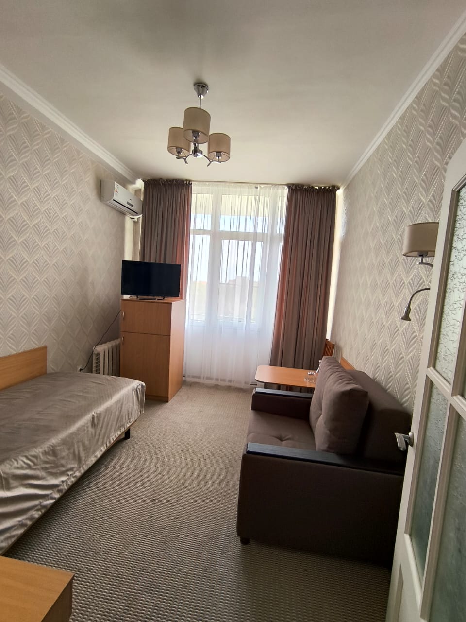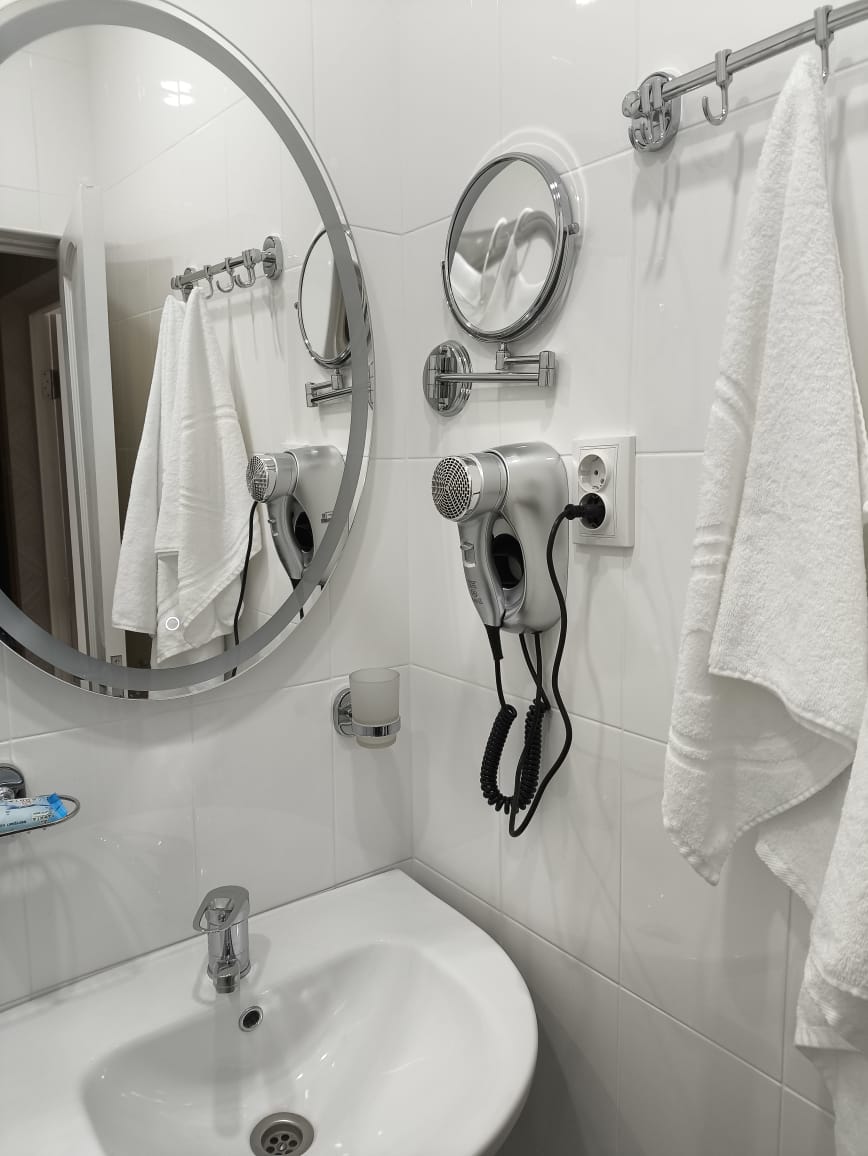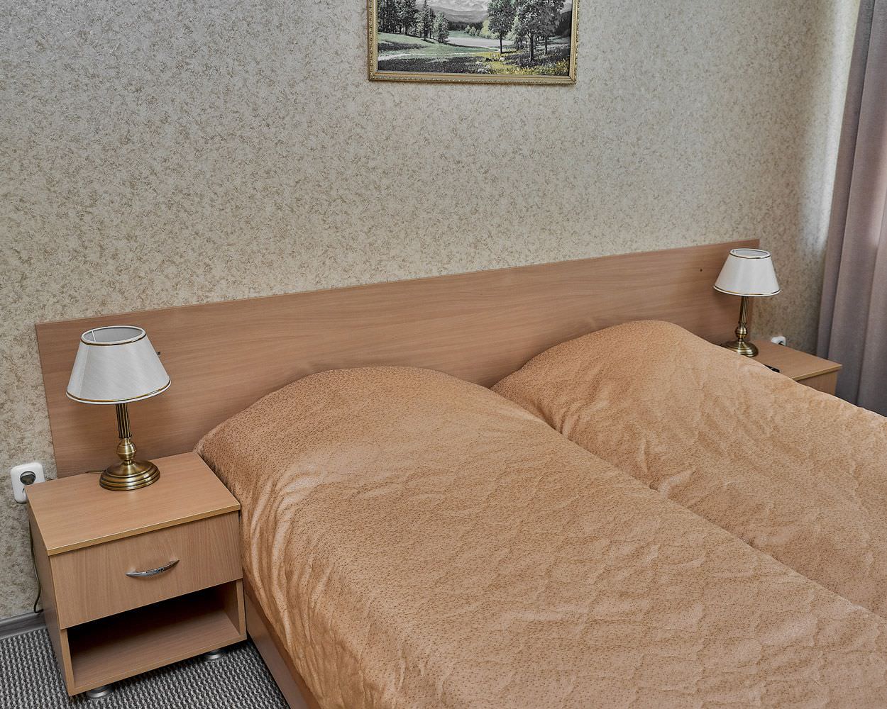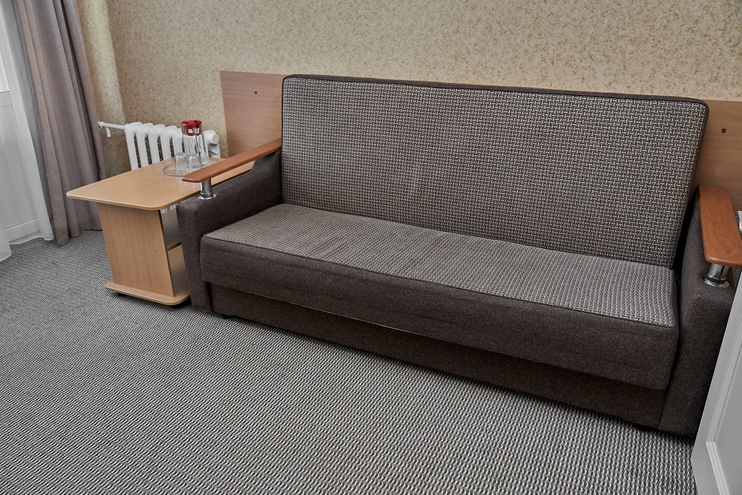 Площадь номера - 24 кв.м. 2 осн. места. 3 доп. места. Балкон. Мебель: диван раскладной, зеркало, кровати односпальные /одна двуспальная кровать, прикроватные тумбочки, стол, столик журнальный, стул, шкаф-купе. Оборудование: гладильная доска, кондиционер, сейф (- только в номерах 1 корпуса), телевизор, телефон, утюг, холодильник. Санузел: с ванной, фен. Сервис: смена полотенец (1 раз в 5 дней), смена постельного белья (1 раз в 5 дней), уборка номера (1 раз в день).