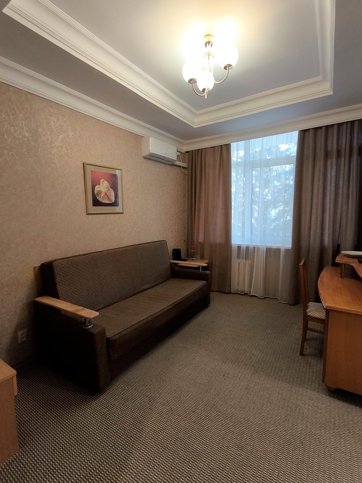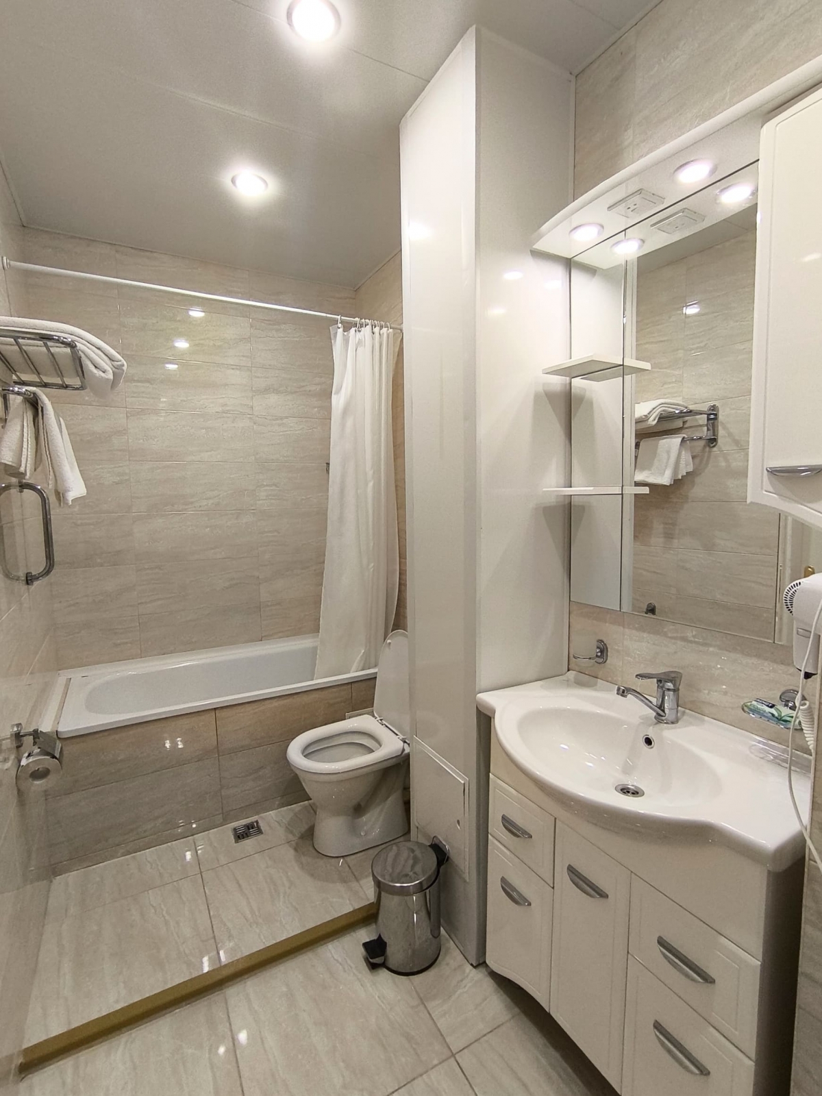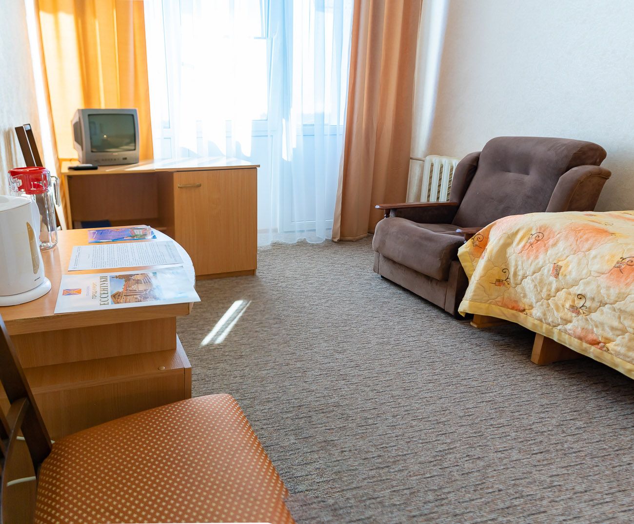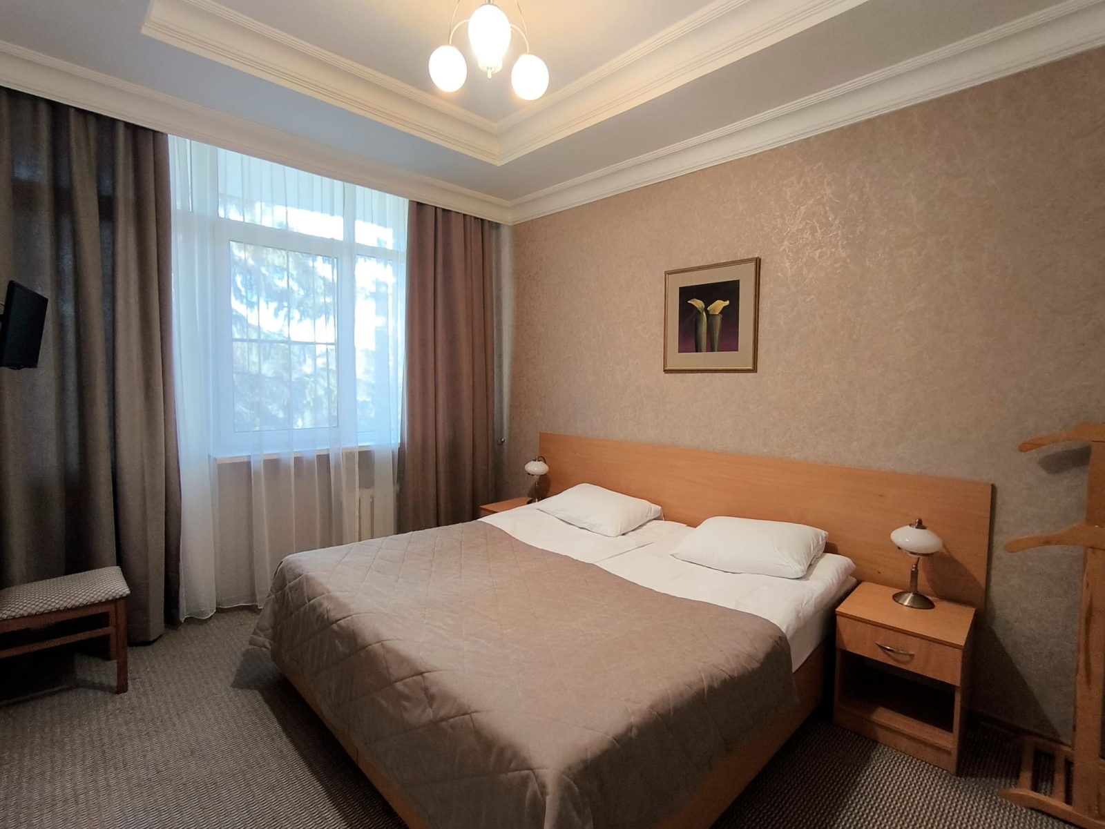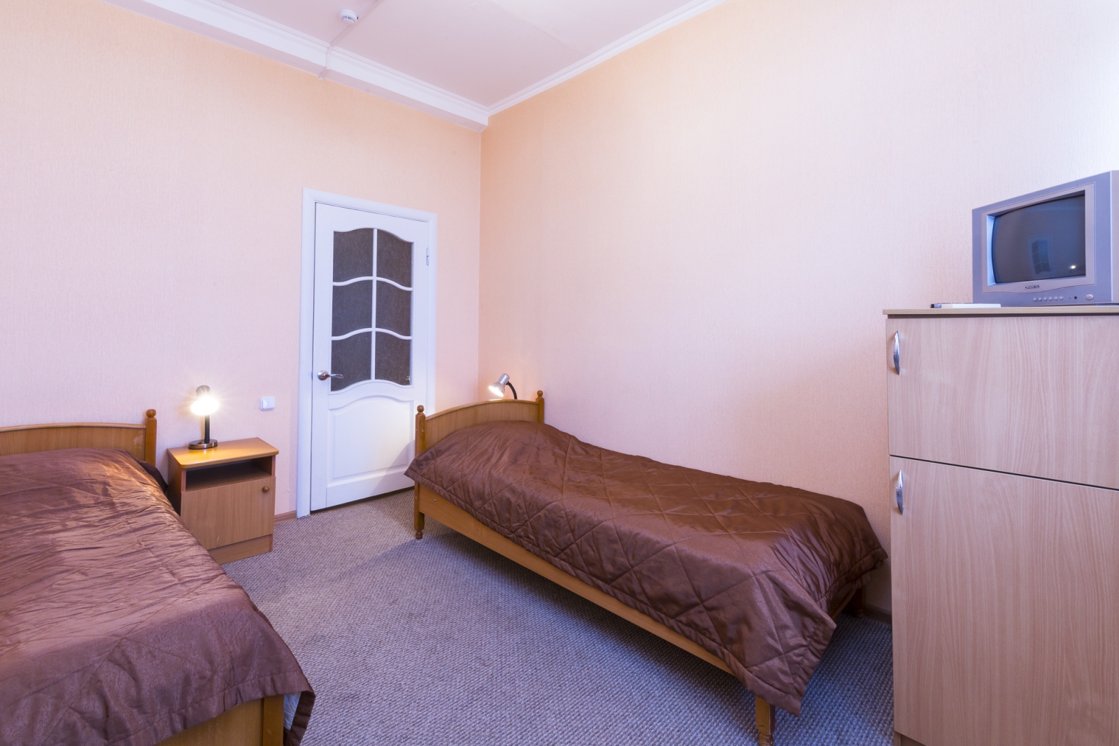 Площадь номера - 24 кв.м. 2 осн. места. 3 доп. места. Балкон. Мебель: диван раскладной, зеркало, кровати односпальные /одна двуспальная кровать, прикроватные тумбочки, стол, столик журнальный, стул, шкаф-купе. Оборудование: гладильная доска, кондиционер, сейф (- только в номерах 1 корпуса), телевизор, телефон, утюг, холодильник. Санузел: с ванной, фен. Сервис: смена полотенец (1 раз в 5 дней), смена постельного белья (1 раз в 5 дней), уборка номера (1 раз в день).