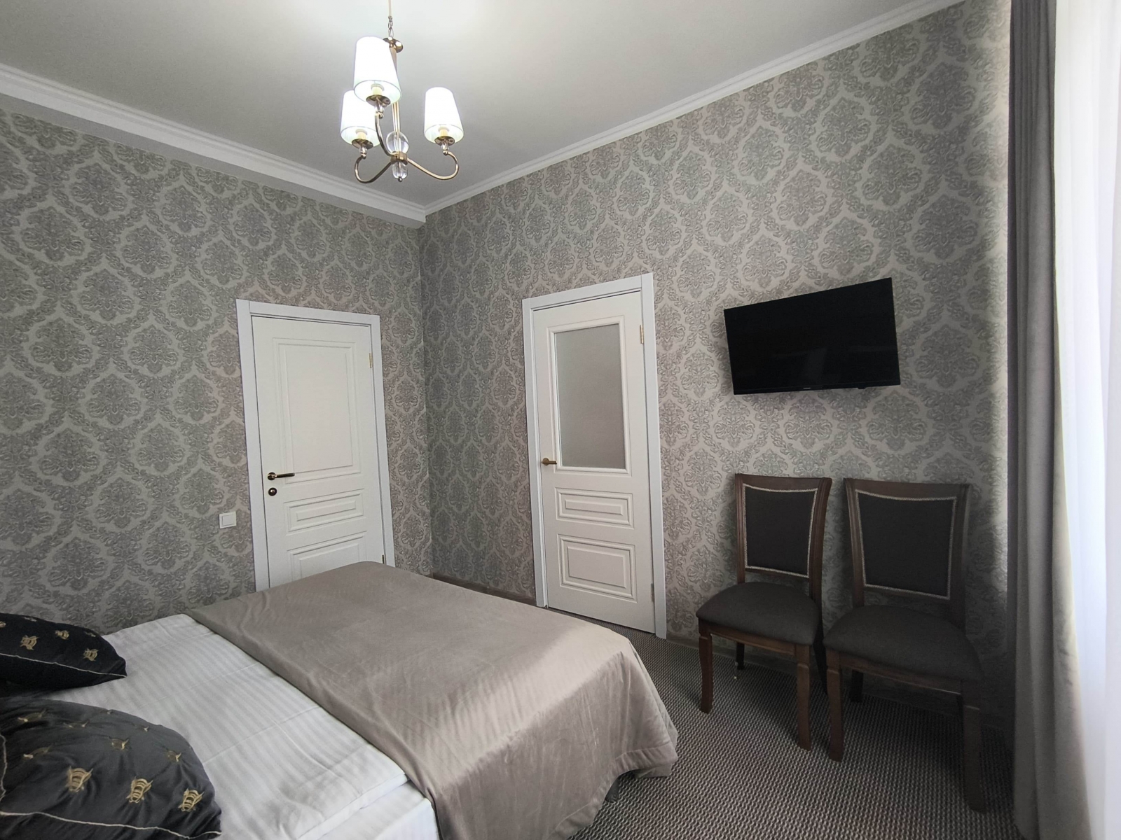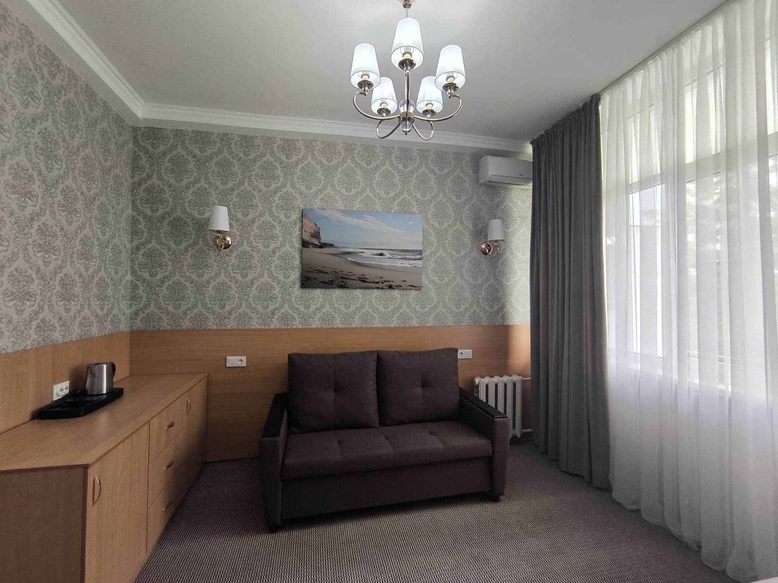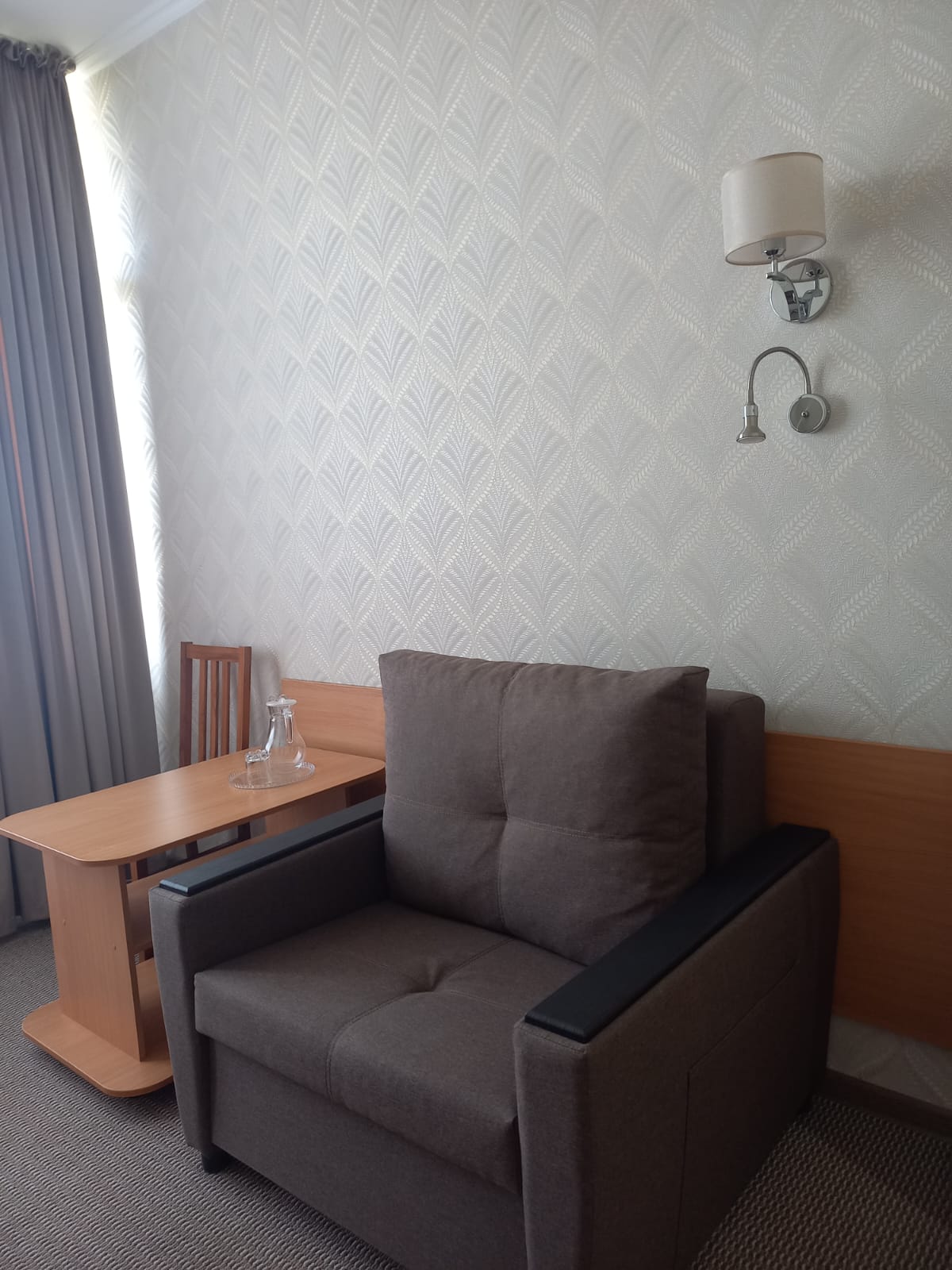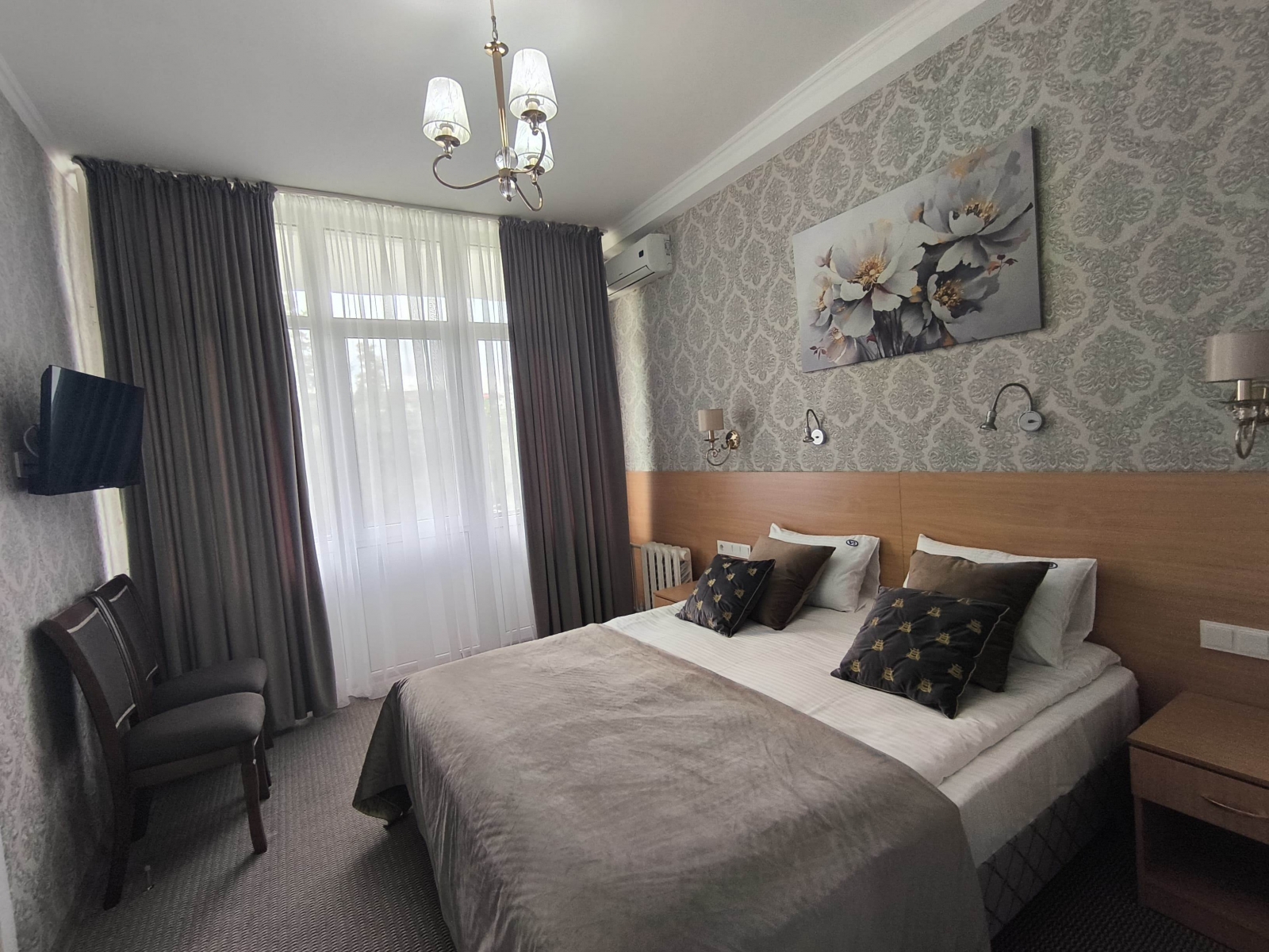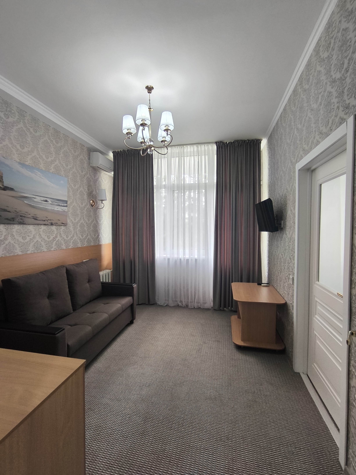 Площадь номера - 24 кв.м. 2 осн. места. 3 доп. места. Балкон. Мебель: диван раскладной, зеркало, кровати односпальные /одна двуспальная кровать, прикроватные тумбочки, стол, столик журнальный, стул, шкаф-купе. Оборудование: гладильная доска, кондиционер, сейф (- только в номерах 1 корпуса), телевизор, телефон, утюг, холодильник. Санузел: с ванной, фен. Сервис: смена полотенец (1 раз в 5 дней), смена постельного белья (1 раз в 5 дней), уборка номера (1 раз в день).