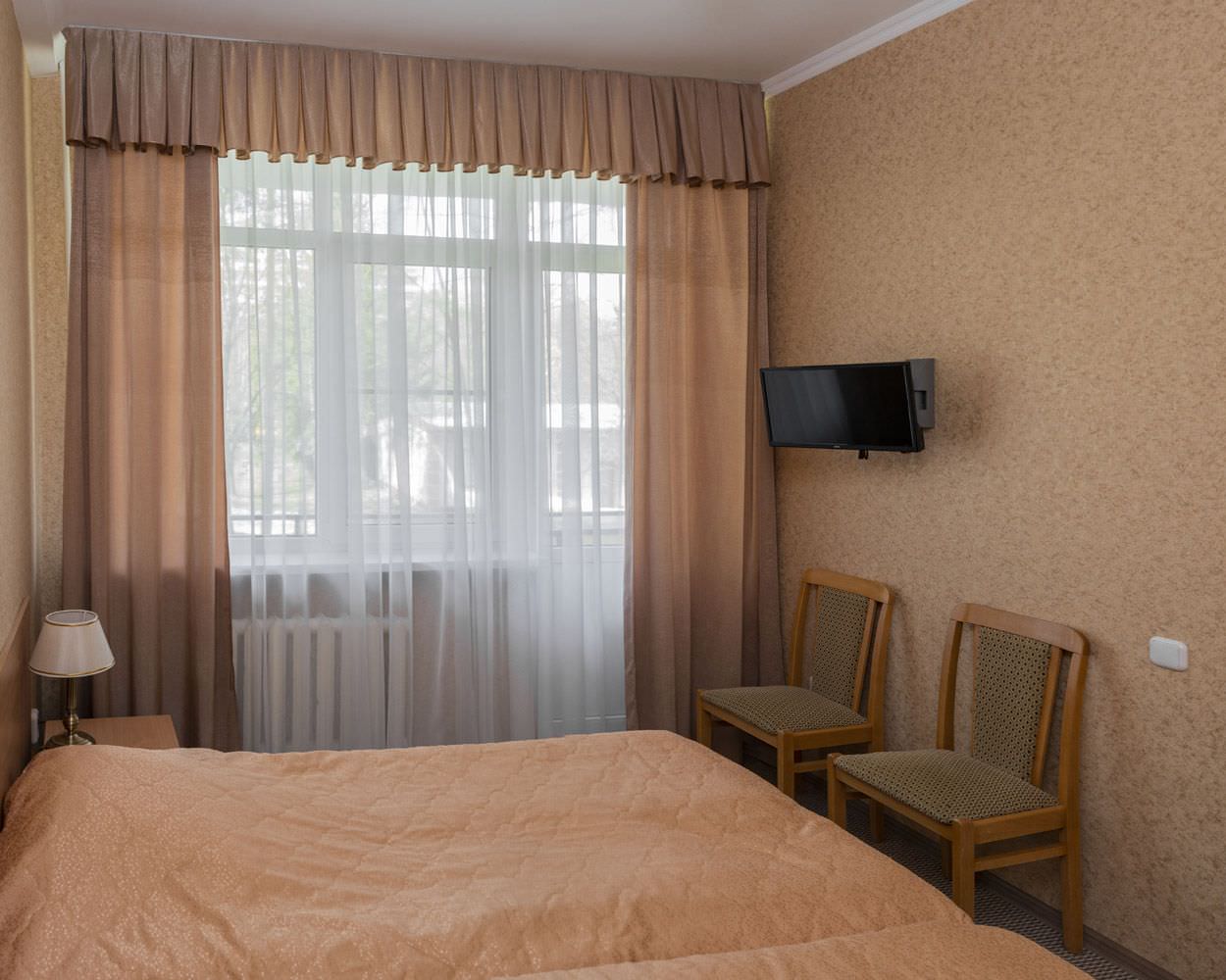 В пансионате имеется четыре жилых корпуса, лечебный корпус с отделением "Мать и дитя", водолечебница и две столовые. Жилые здания соединены между собой переходом и находятся недалеко от лечебного корпуса, водолечебницы и питьевой галереи. Номерной фонд пансионата вмещает 1470 человек. Здесь имеются номера категории Эконом, Стандарт, Люкс и Апартаменты. В жилых зданиях находятся детские комнаты, процедурный кабинет и лаборатория, массажный кабинет и зал ЛФК, бары и клуб. Все номера обставлены хорошей мебелью и оборудованы бытовой техникой. В номерах Люкс и Апартаменты есть кондиционеры.