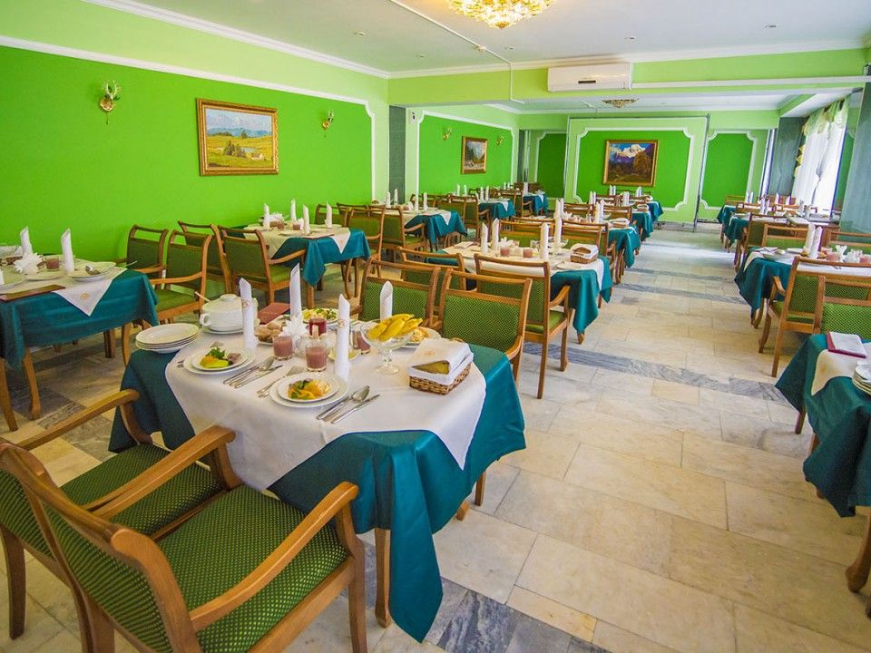 Гостям предлагаются вегетарианские, постные, национальные и праздничные блюда. Для гостей, проживающих в номерах "Люкс", предлагается отдельное меню. Контроль за качеством пищи осуществляют диетврач и диетическая сестра. На территории пансионата есть уютное кафе, где гости могут перекусить и прекрасно отдохнуть. Гостям предлагают различные закуски, салаты, напитки.