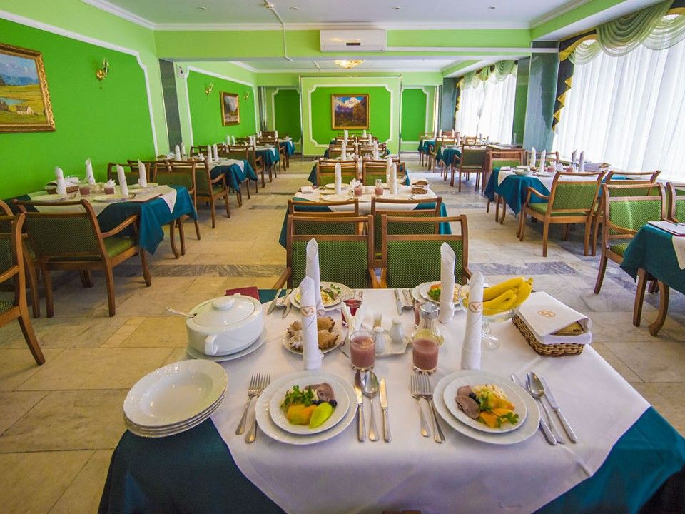 Для питания гостей в пансионате имеются две диетические столовые с обеденными залами, кафе и бары. В обеденных залах для гостей организовано четырех разовое питание по заказному меню, а дети питаются пять раз в день. Отдыхающим предлагается разнообразное меню: вегетарианские, постные и национальные блюда. Для гостей, проживающих в номерах "Люкс", предлагается отдельное меню. Для туристов, проживающих в корпусе No3, питание проходит в обеденном зале "Люкс". На территории пансионата есть уютное кафе, где гости могут перекусить и прекрасно отдохнуть. Гостям предлагают различные закуски, салаты, напитки. Летом в меню кафе есть гриль блюда. Вечером в кафе можно послушать музыку и потанцевать. В барах пансионата имеются различные алкогольные и безалкогольные коктейли и напитки, прохладительные напитки, кофе и чай, а также легкие закуски и десерты. Здесь можно хорошо провести время с семьей или с друзьями и знакомыми.