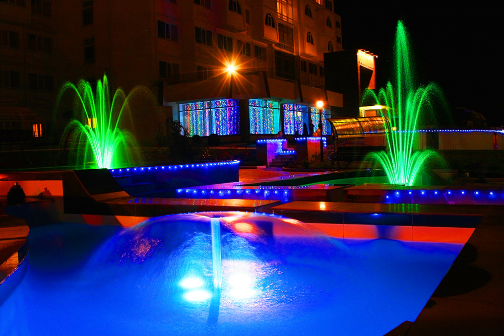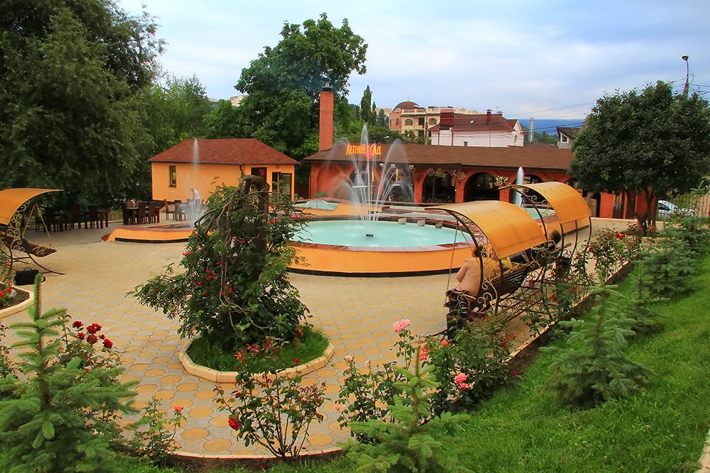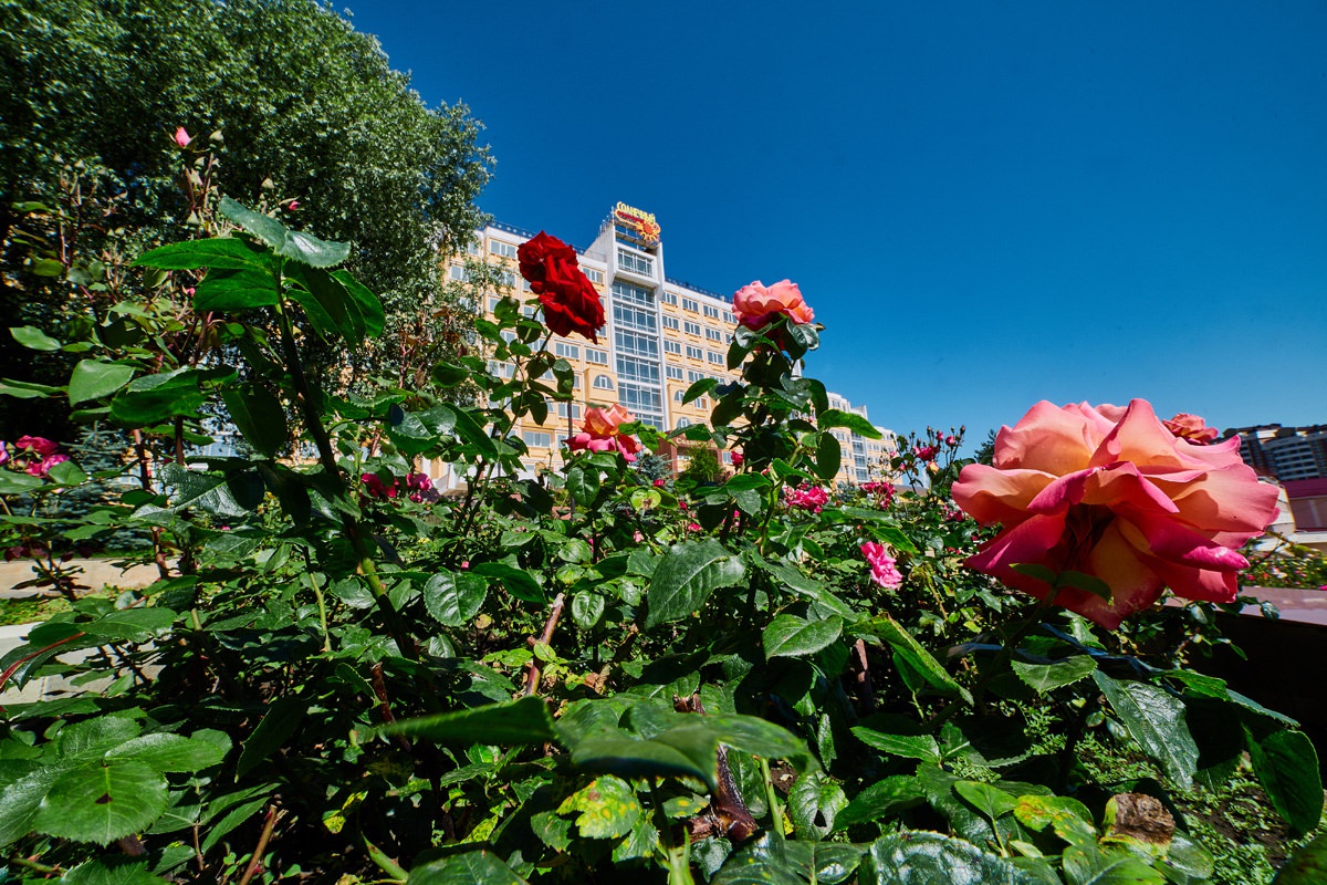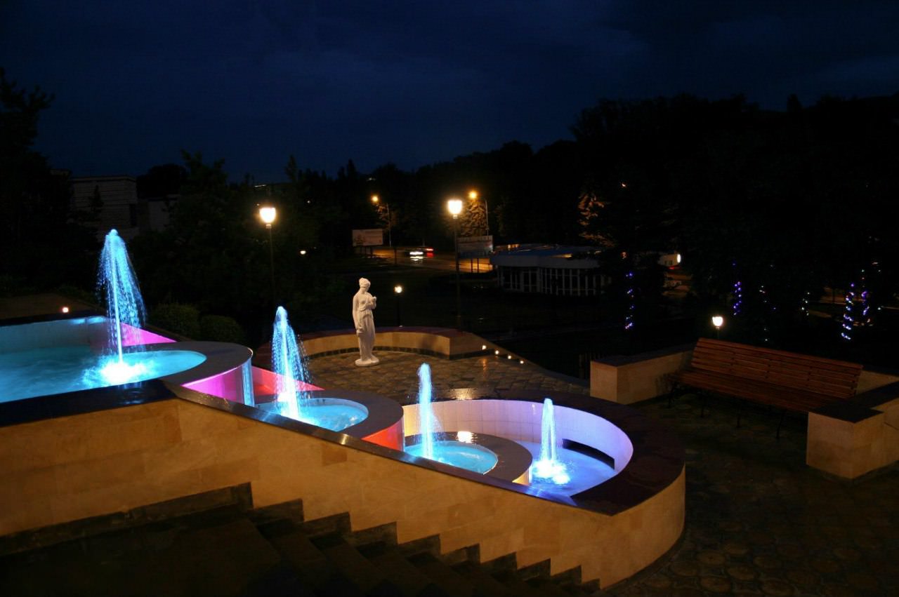 Сам санаторий состоит из четырех корпусов, окруженных ухоженными аллеями с тысячами розовых кустов, террасами, каскадами поющих фонтанов и прекрасно обустроенной территорией, вход на которую доступен только его гостям. Ночью все это великолепие освещается множеством разноцветных огней, из-за чего санаторий — первое, что бросается в глаза, при въезде в город.