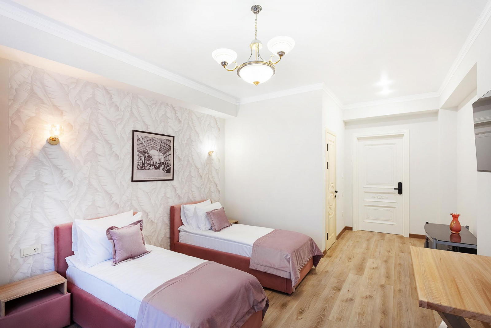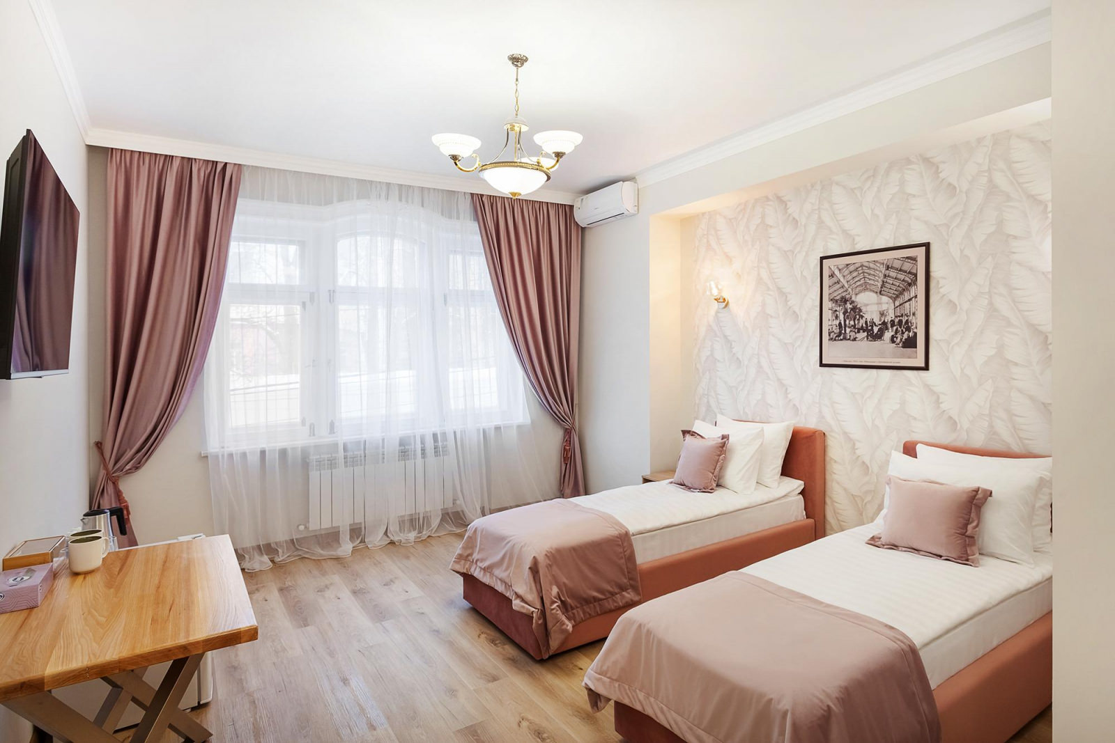 Уютный двухместный номер Джуниор, расположен на втором этаже отеля, и выполнен в розовых тонах. В номере установлены две комфортные односпальные кровати с ортопедическими матрасами, которые обеспечат качественный сон и отдых, по запросу кровати можно соединить. Интерьер номера дополняет мягкое освещение и стильные элементы декора, придающие пространству особый шарм. Ванная комната оснащена всеми необходимыми банными принадлежностями и современной сантехникой. Для удобства гостей предусмотрена фен, набор полотенец и тапочки. В номере установлен современный телевизор с доступом к широкому выбору каналов, а высокоскоростной Wi-Fi позволит оставаться на связи и быть в курсе последних новостей.