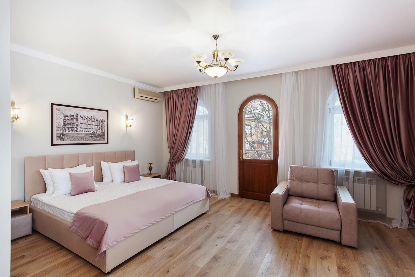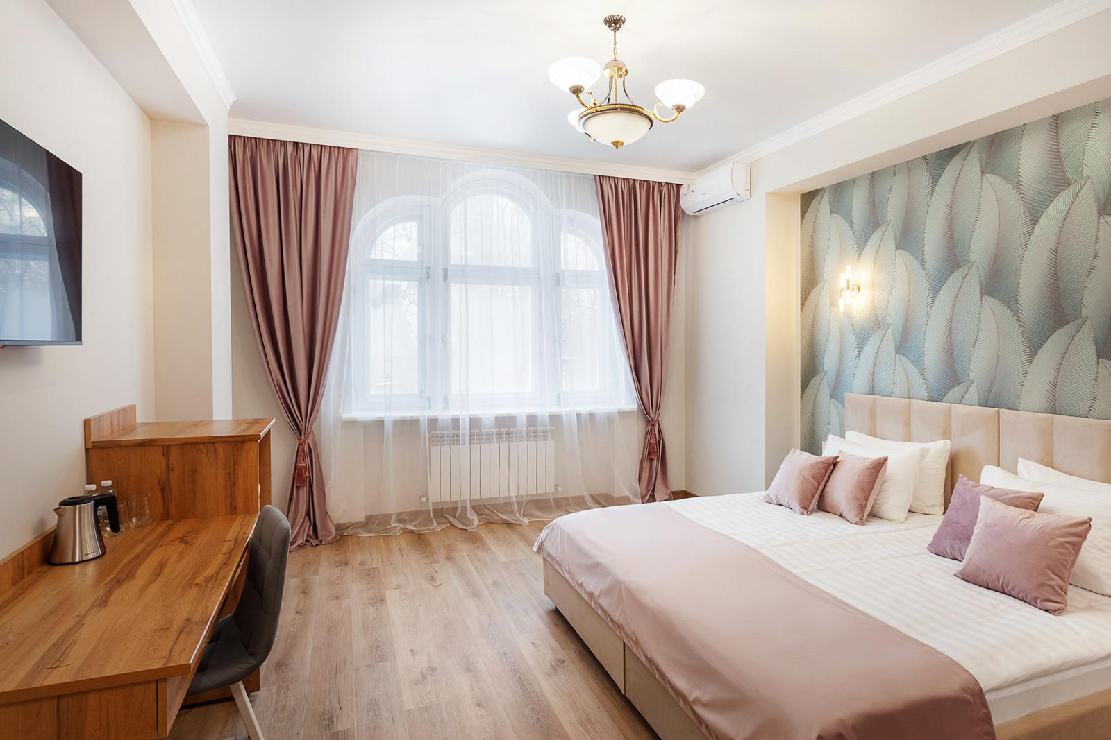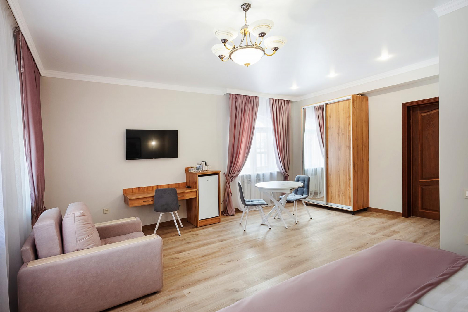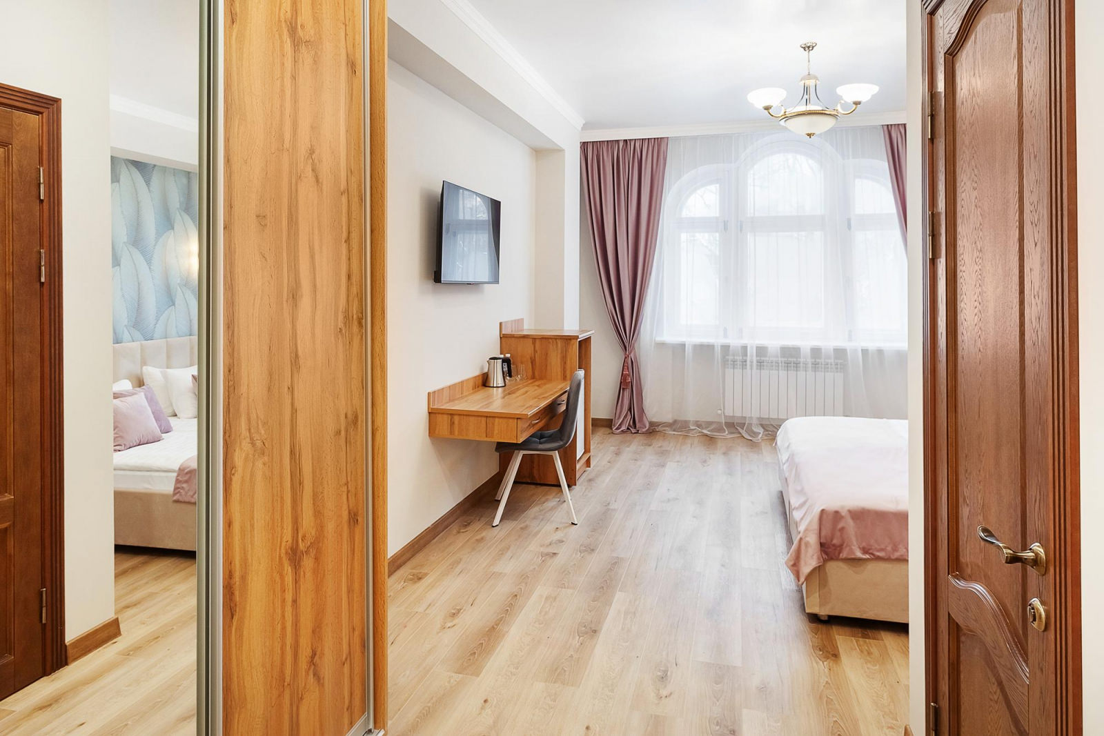 Двухкомнатные апартаменты с балконом расположены на 3 этаже отеля, оформлены в светлых и нежно-розовых тонах, создают атмосферу романтики и комфорта, а также придают номеру легкость и воздушность. Вся мебель в апартаментах выполнена из светлого дерева, подчеркивая нежность интерьера. Номер включает в себя уютную спальню и оборудованную кухню. Кухня укомплектована всем необходимым для приготовления еды - холодильником, плитой, микроволновой печью и посудой. Спальня оборудована удобной кроватью, прикроватными тумбочками, смарт-ТВ, туалетным столиком и мягким пуфом. А ее интерьер дополняет мягкое освещение и стильные элементы декора. Также спальня имеет выход на свой балкон, где вы сможете насладиться утренним кофе или вечерним закатом, отдыхая после насыщенного дня.