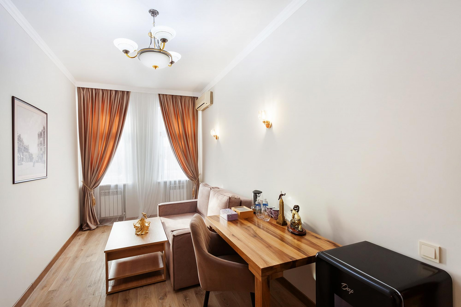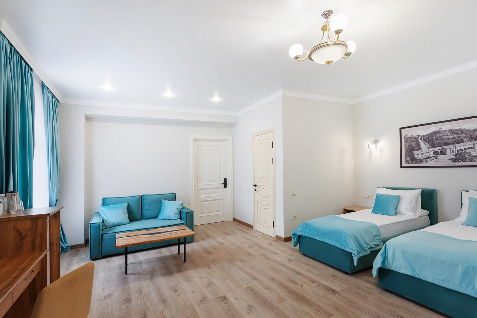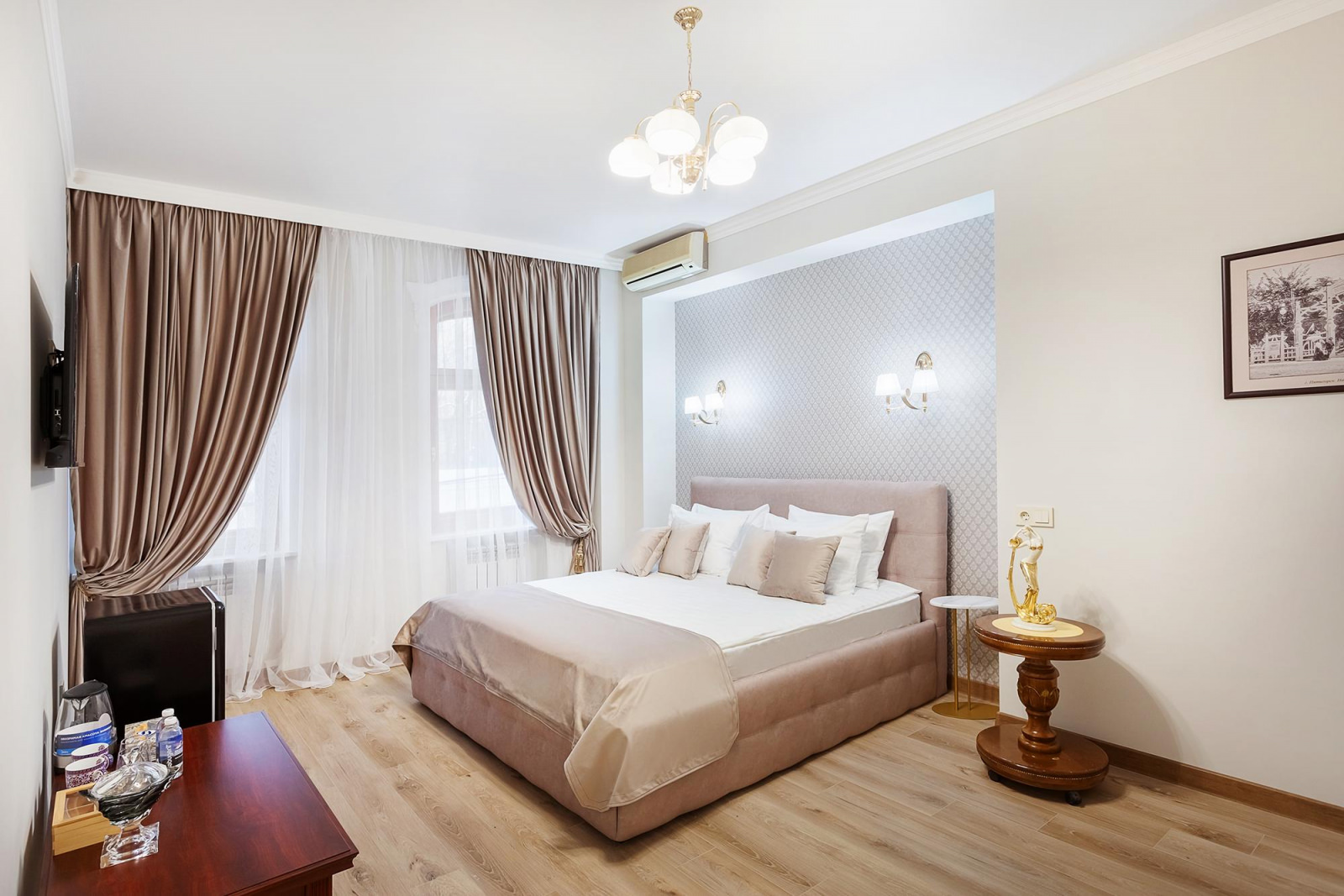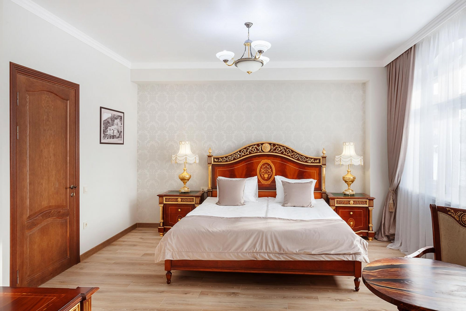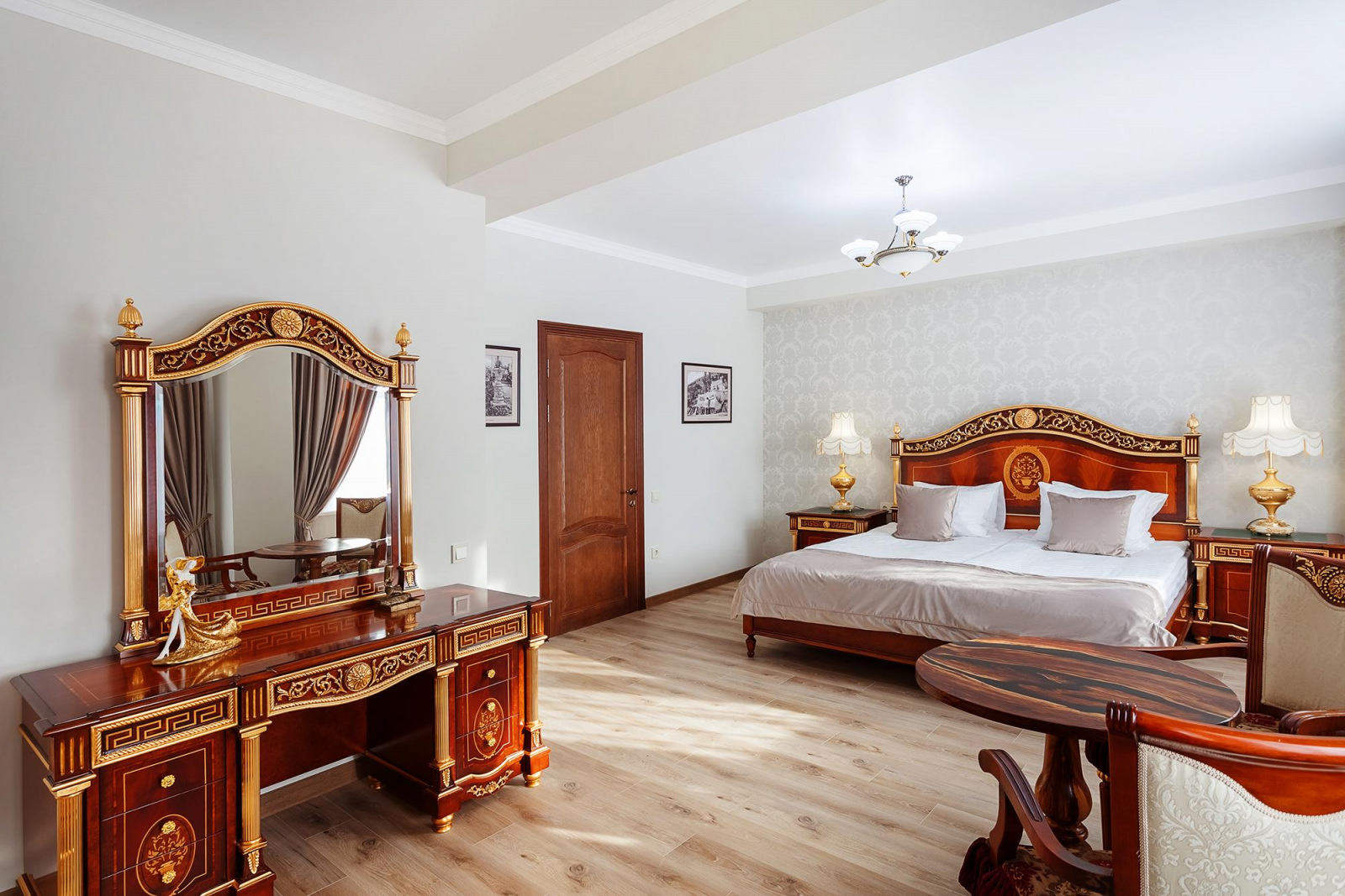 Двухкомнатный люкс расположенный на 3 этаже отеля - это изысканный и комфортабельный выбор для тех, кто ценит уют и стиль. Внутреннее оформление номера выполнено в светлых тонах, а атмосферу уюта создает классическая деревянная мебель. Центром номера является большая и красивая кровать king size с высоким изголовьем, которая обеспечит вам комфортный сон и отдых после насыщенного дня. Рядом с кроватью находится элегантный туалетный столик с зеркалом, где вы сможете привести себя в порядок и насладиться уединением. Дополняет интерьер номера изящный столик c креслами, которые идеально подходят для романтического ужина или деловых переговоров. Благодаря большим окнам, номер всегда наполнен естественным светом, создавая ощущение простора и воздушности.