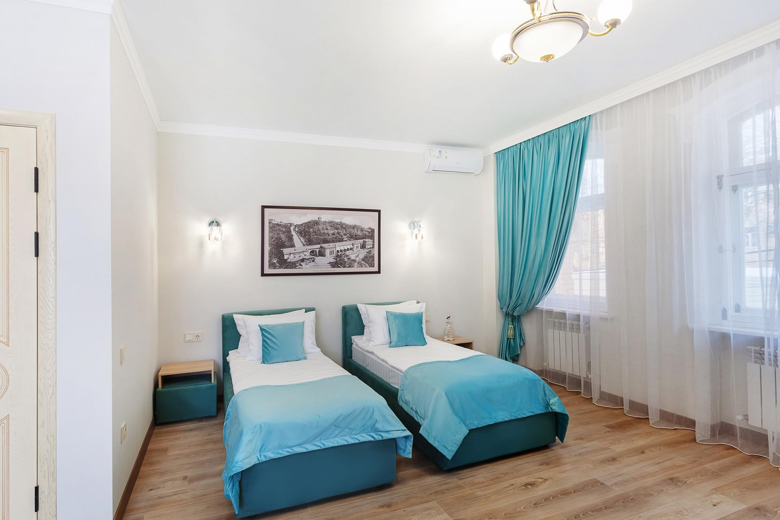 Стильный трехместный номер расположен на втором этаже отеля. Интерьер номера выполнен в мягких бирюзовых оттенках. Это идеальное сочетание стиля, комфорта и функциональности. Номер создан для тех, кто ценит уют и современный дизайн, и предлагает все необходимые условия для приятного и незабываемого отдыха. В номере установлены две комфортные односпальные кровати с ортопедическими матрасами, которые обеспечат качественный сон и отдых, по запросу кровати можно соединить. Также имеется вместительный шкаф для одежды, диван и рабочий стол со стулом. Кондиционер обеспечит вам комфортную температуру, а смарт-ТВ не даст заскучать. Ванная комната оснащена современной душевой кабиной, умывальником, зеркалом и туалетными принадлежностями.
