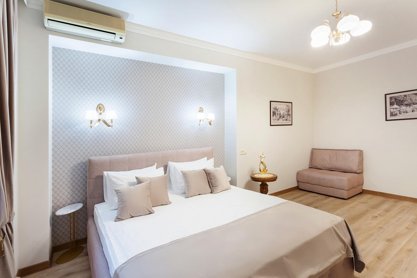 Уютный двухкомнатный люкс расположен на 2 этаже отеля. Интерьер выполнен в спокойных пепельно-кофейных тонах, что создает атмосферу уюта и расслабления. В уютной спальне установлена большая двуспальная кровать с ортопедическим матрасом и гипоаллергенными подушками. Гостиная оборудована мягким диваном, где гости могут насладиться чашкой ароматного кофе или чая. Люкс оснащен всеми необходимыми удобствами для приятного пребывания гостей, включая смарт-ТВ, кондиционер, сейф, Wi-Fi и набор для приготовления кофе и чая. Ванная комната оснащена просторной душевой кабиной и всеми необходимыми принадлежностями.