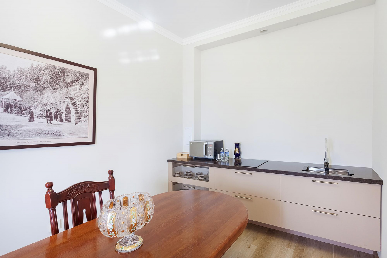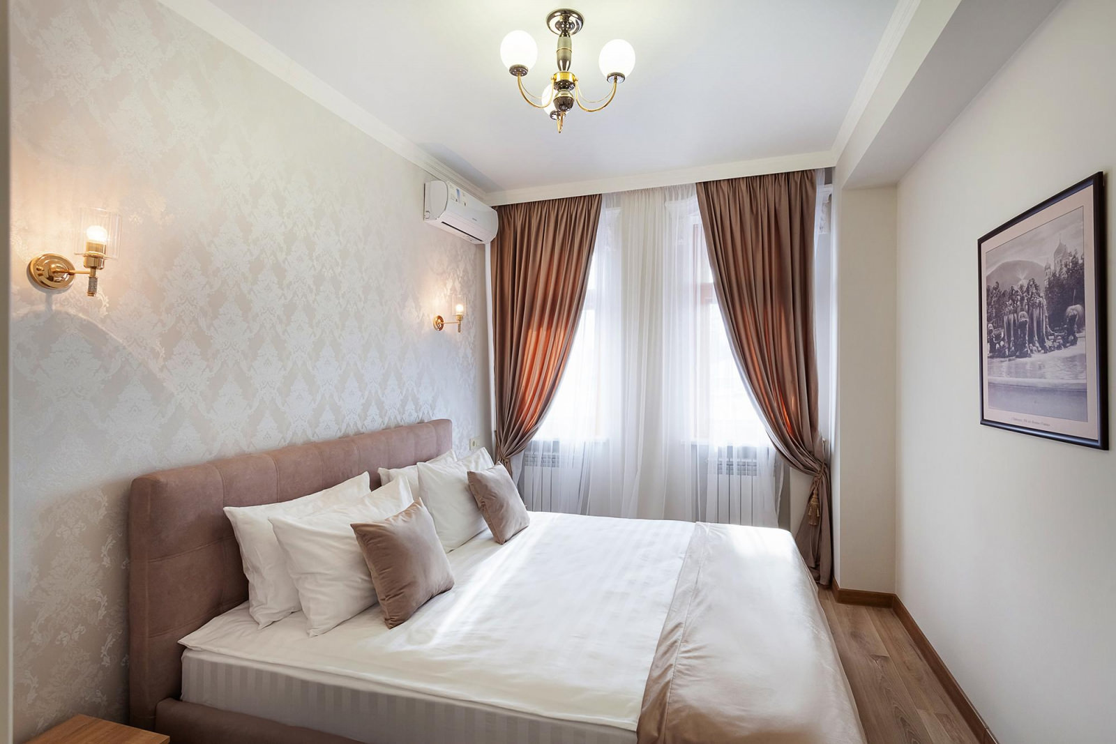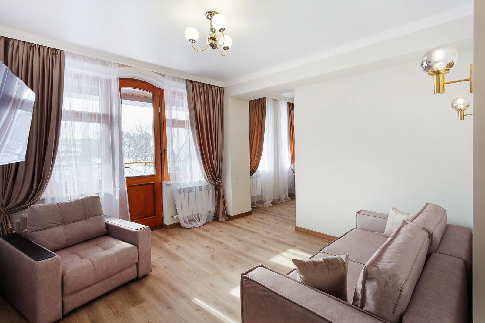 Апартаменты располагаются на 2 этаже бутик-отеля, оформлены в оттенках мокко. Эта строгая и одновременно теплая цветовая гамма создает ощущение роскоши и уюта в помещении. Ее оценят, как гости предпочитающие классический стиль интерьера, так и почитатели современного дизайна. Номер включает в себя просторную гостиную, уютную спальню и оборудованную кухню. В вашем распоряжении будут все необходимые удобства для комфортного проживания. Кухня укомплектована всем необходимым для приготовления еды - холодильником, плитой, микроволновой печью и посудой. Спальня оборудована удобной кроватью, прикроватными тумбочками, а ее интерьер дополняет мягкое освещение и стильные элементы декора. Гостиная оснащена мягким диваном, креслом, смарт-ТВ и имеет выход на свой большой балкон.