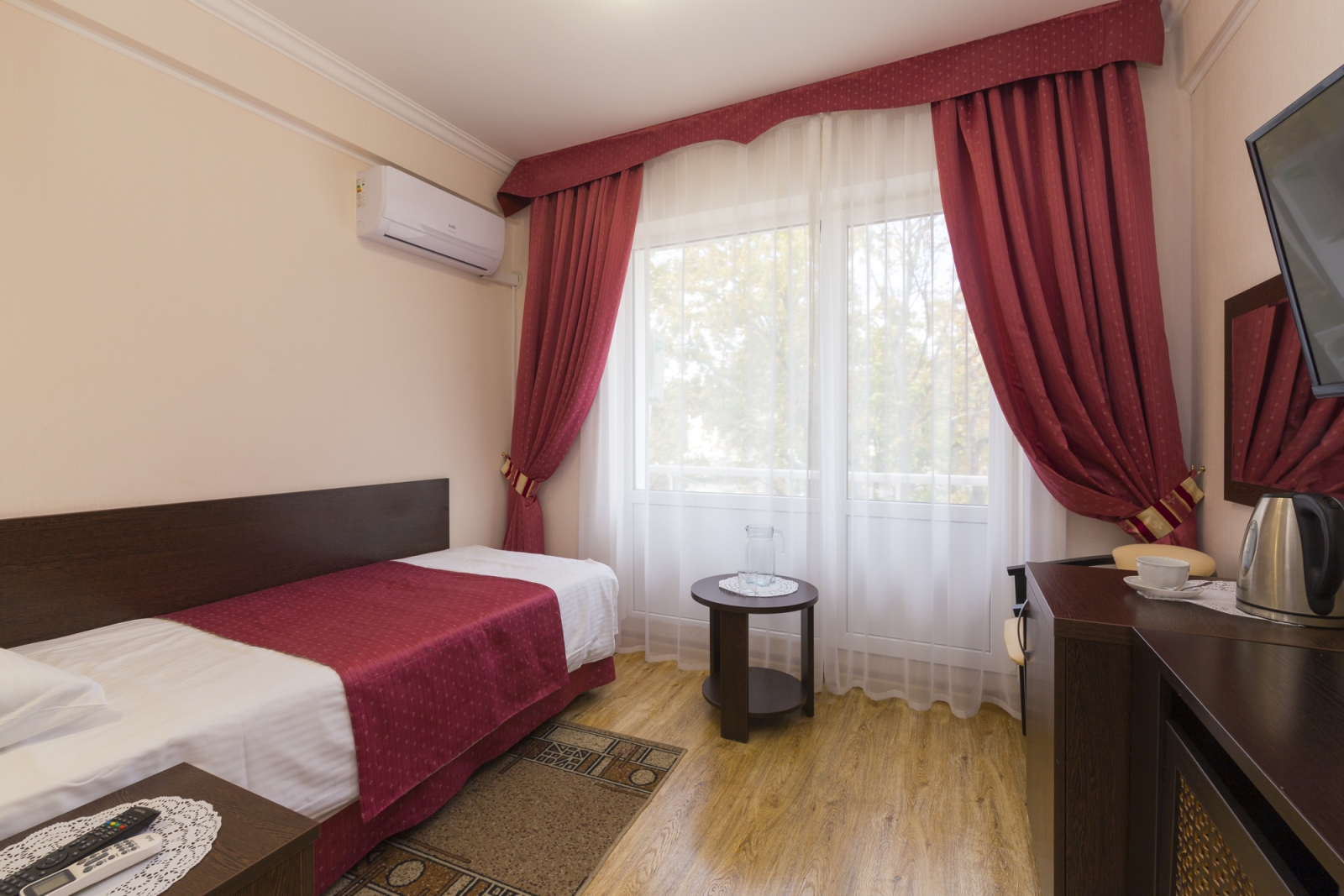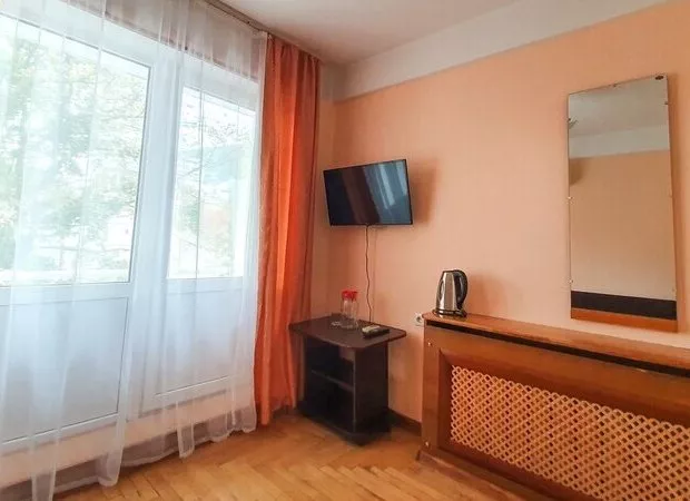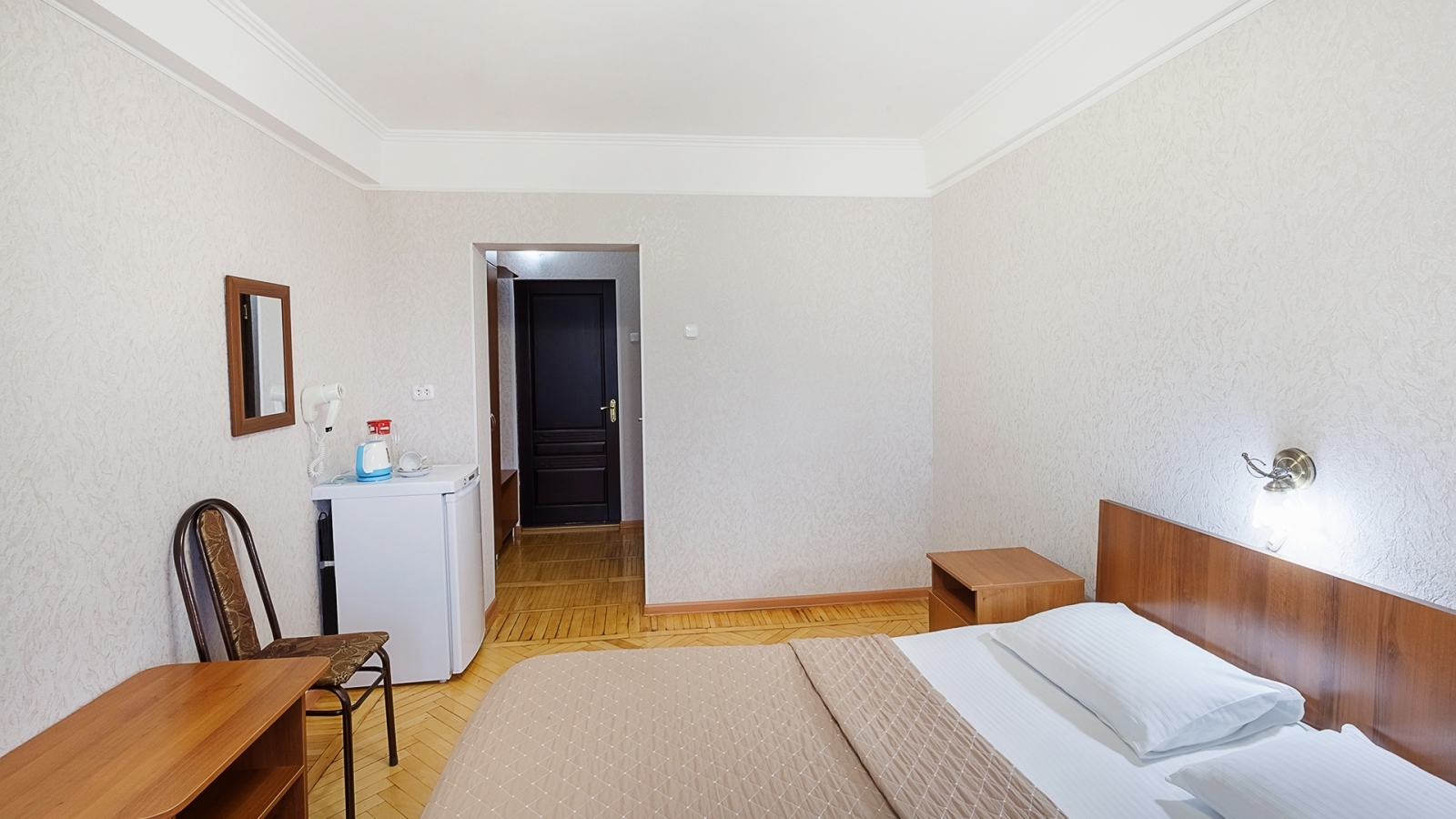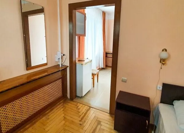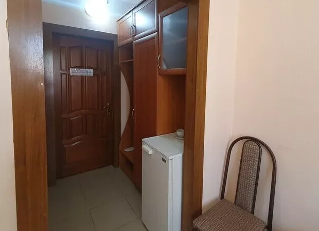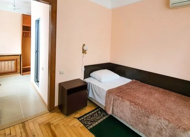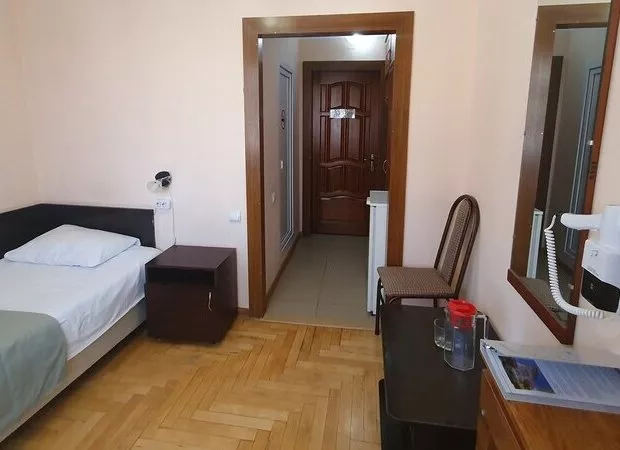 Площадь номера - 17 кв.м. 1 осн. место. 1 доп. место. Мебель: вешалка, зеркало, кровать односпальная, прикроватная тумбочка, стол, стул, шкаф. Оборудование: кондиционер, телевизор, холодильник, чайный набор посуды, электрочайник. Санузел: с душем, туалетные принадлежности, фен. Сервис: Wi-Fi бесплатно, смена полотенец, смена постельного белья, уборка номера.