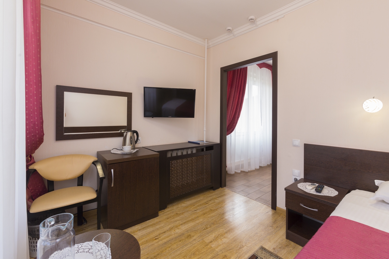 1 осн. место. 1 доп. место. Балкон. Мебель: зеркало, кровать односпальная, прикроватная тумбочка, столик журнальный, стул, шкаф. Оборудование: телевизор, холодильник. Санузел. Сервис: Wi-Fi бесплатно, смена полотенец, смена постельного белья, уборка номера.