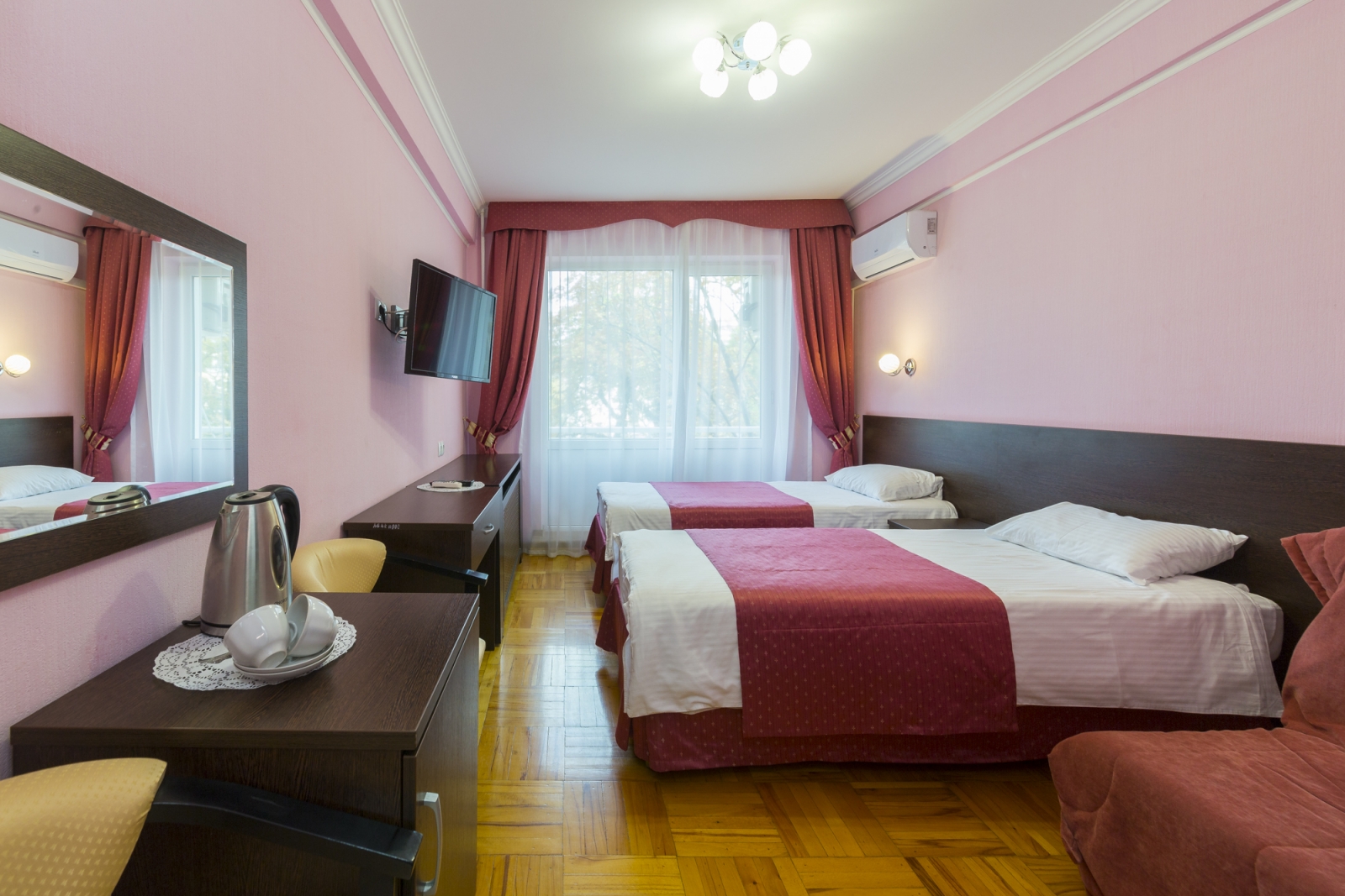 2 осн. места. 1 доп. место. Балкон. Мебель: вешалка, диван, зеркало, кровати односпальные /одна двуспальная кровать, прикроватная тумбочка, стол, столик журнальный, стул, тумба, шкаф. Оборудование: кондиционер, телевизор, холодильник, чайный набор посуды, электрочайник. Санузел: с ванной, с душем, фен. Сервис: Wi-Fi бесплатно, смена полотенец, смена постельного белья, уборка номера.