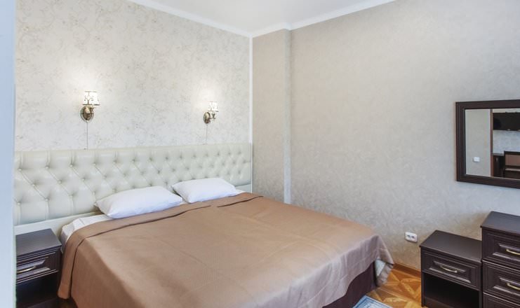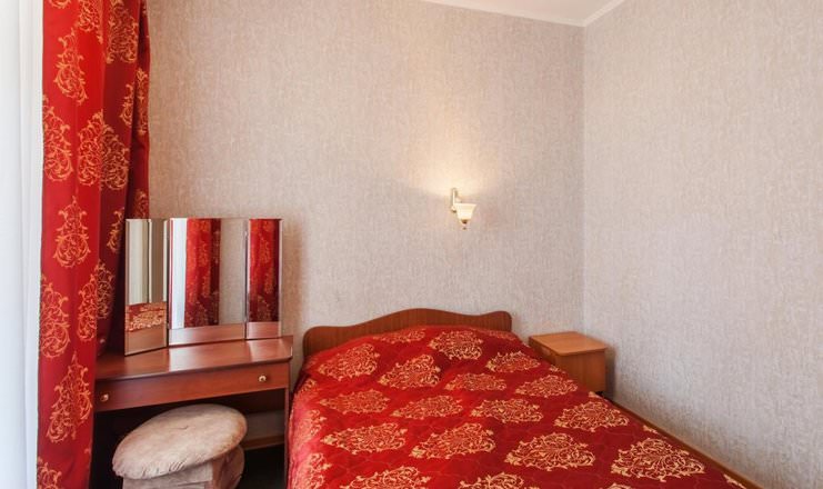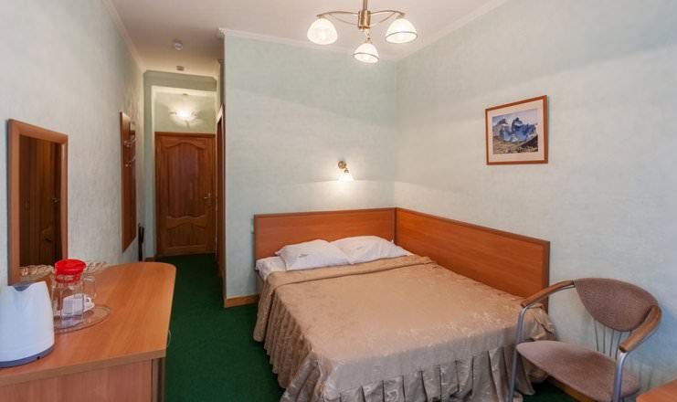 Одноместный номер с двуспальной кроватью. Также имеются стулья, тумба, столик и зеркало.