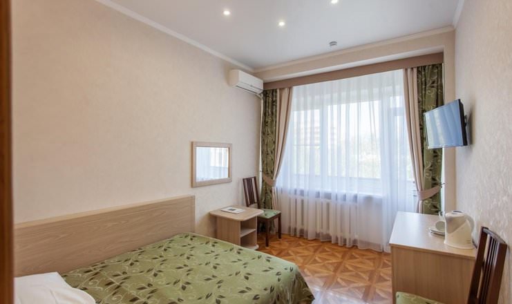 Двухместный номер состоит из одной комнаты. В оснащении имеются телевизор, холодильник, чайник и набор посуды.