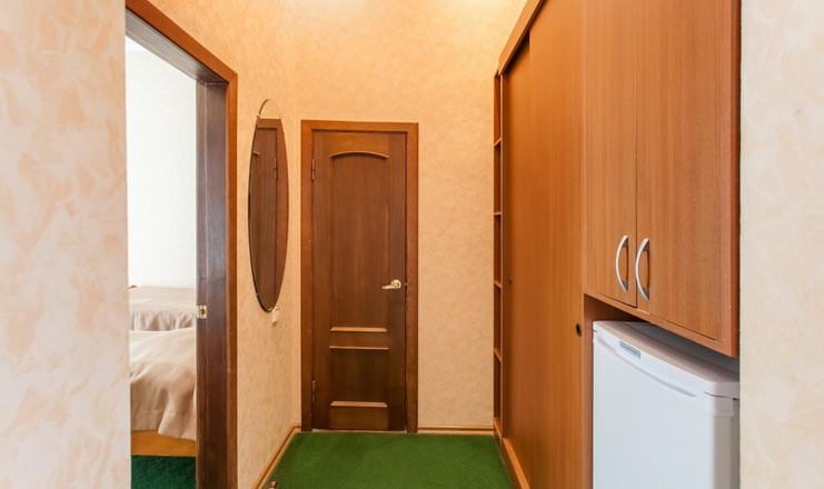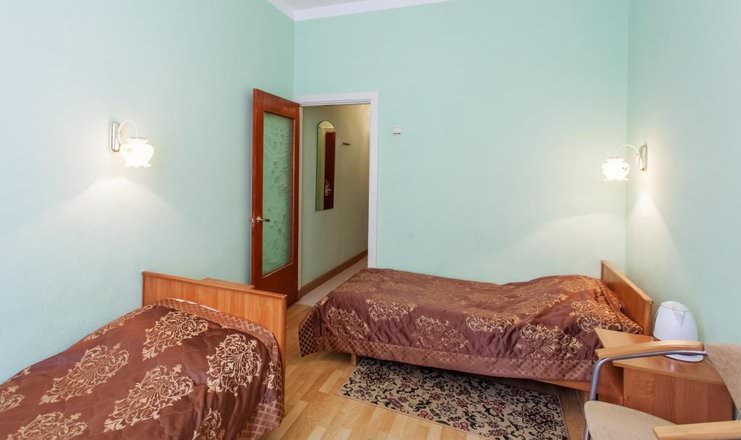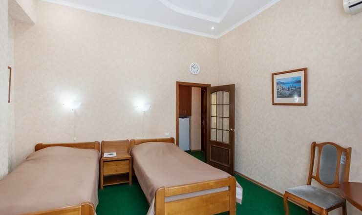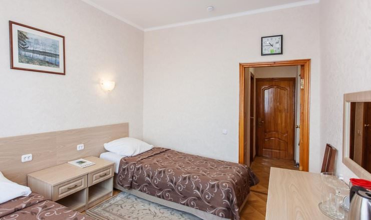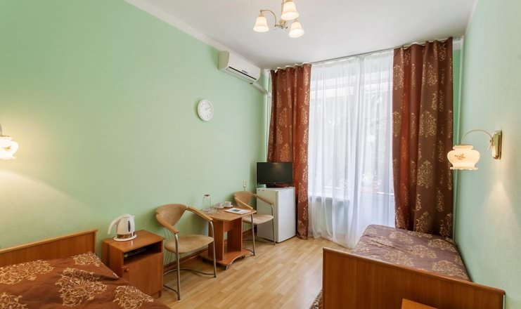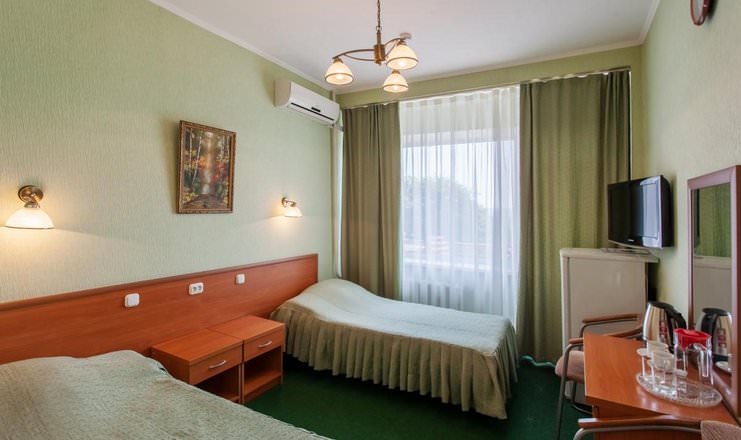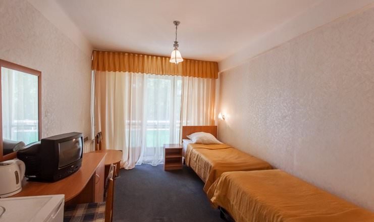 Двое постояльцев смогут разместить в номере второй категории в первом корпусе. Гости смогут расположиться на двух односпальных кроватях. В вашем пользовании будут телевизор, холодильник, чайный набор и электрочайник.