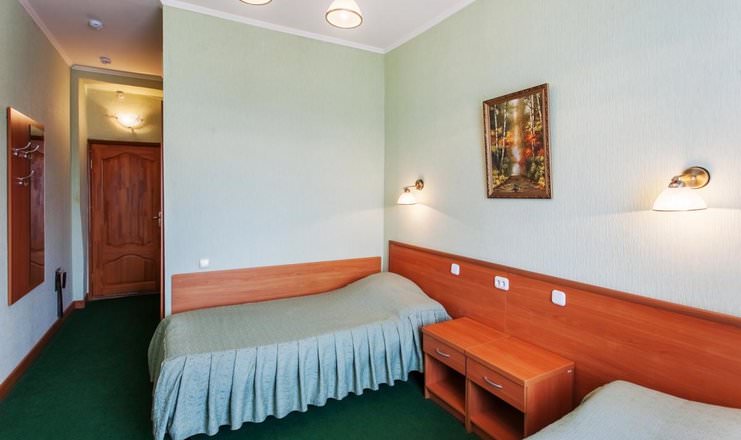 Номер для двоих с односпальными кроватями расположен в первом корпусе. Его площадь составляет 12-15 кв.м.