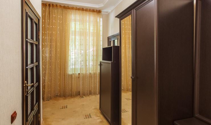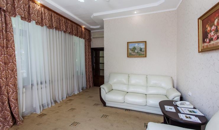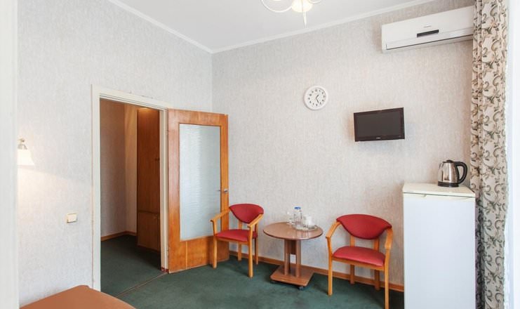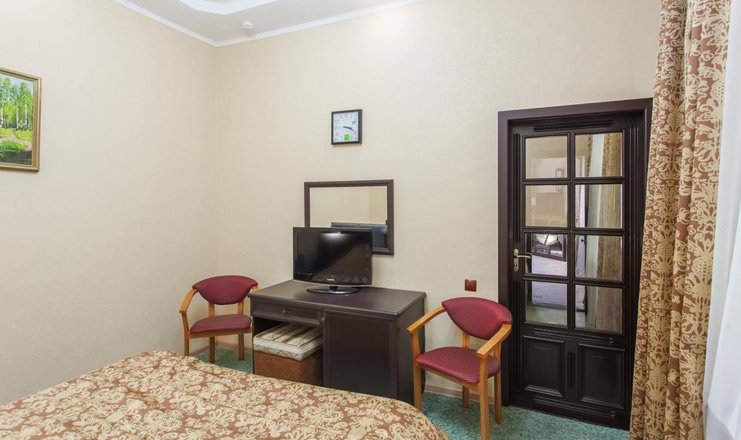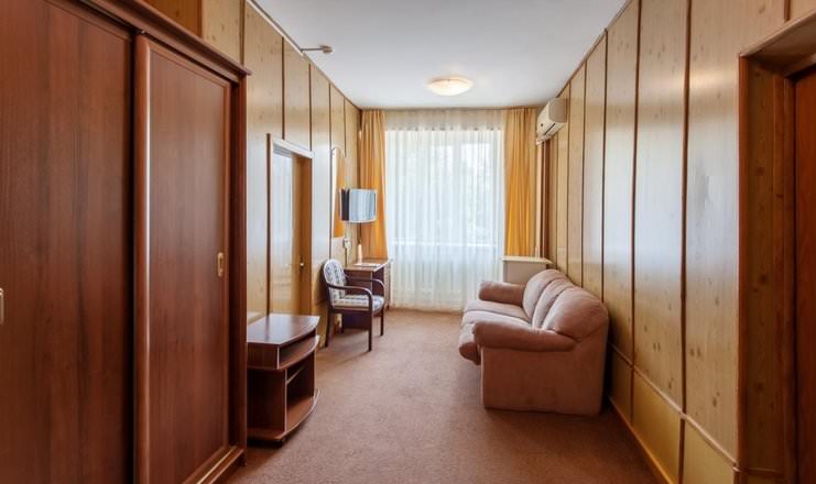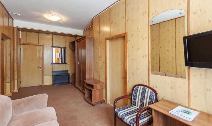 Двухместные номера расположены в четвертом корпусе. Из мебели имеются шкаф, тумбы, стулья и диван.