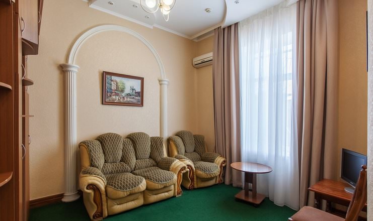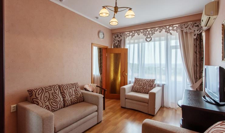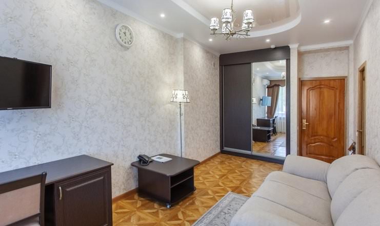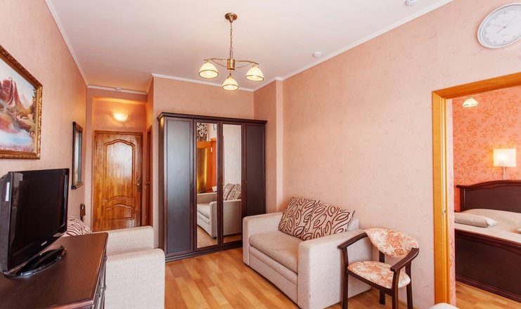 Просторный двухкомнатный номер выполнен в светлых тонах интерьера. Здесь имеются удобные двуспальная кровать и диван.