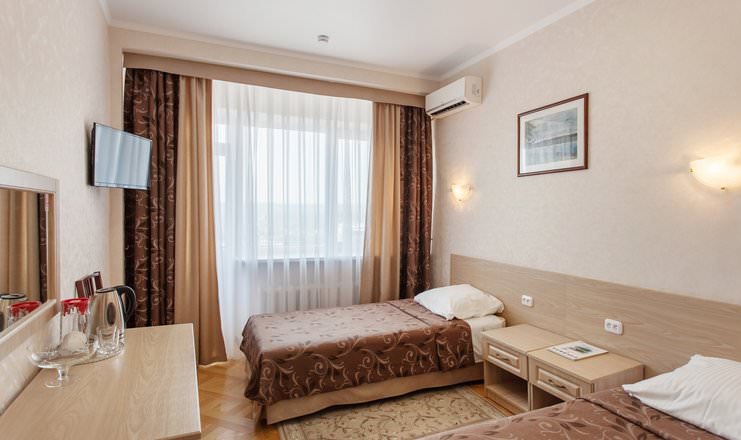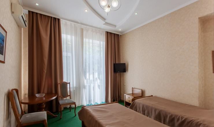 В номере имеются зеркало, прикроватные тумбочки, журнальный стол и шкаф. Гости смогут пользоваться двумя односпальными кроватями в четвертом корпусе. В оснащение входят телевизор и кондиционер.
