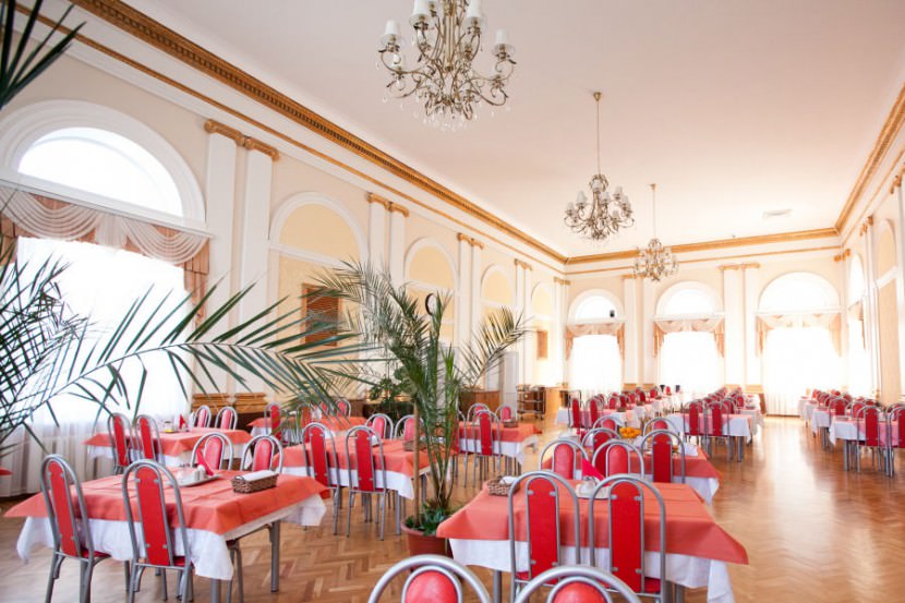 Для питания гостей в санатории есть столовая. Это уютное помещение, которое оформлено в классическом стиле.