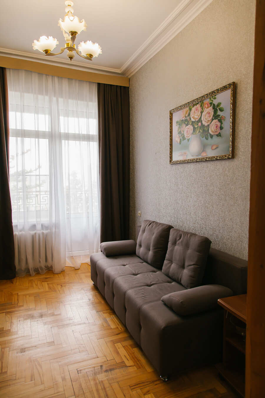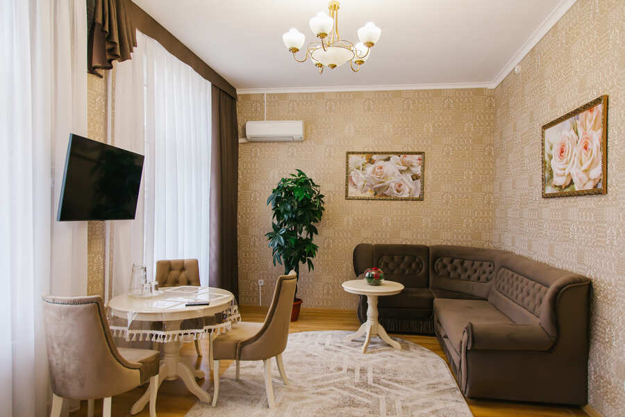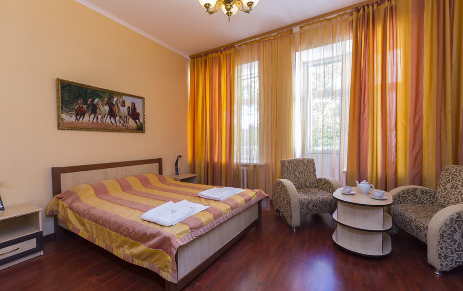 Апартаменты состоят из одной жилой комнаты и прихожей. Она хорошо оборудована. Здесь имеется двуспальная кровать, две тумбочки, мягкая мебель и другая мебель. Все мебель красивая, темно-коричневого цвета. В прихожей имеется встроенный платяной шкаф. В номере имеется настенный ж/к телевизор, сейф и другая техника. Также для гостей предоставляется комплект посуды и швейный набор. Интерьер дополняют шторы, красивый, яркий текстиль, картины, торшер и светильники.