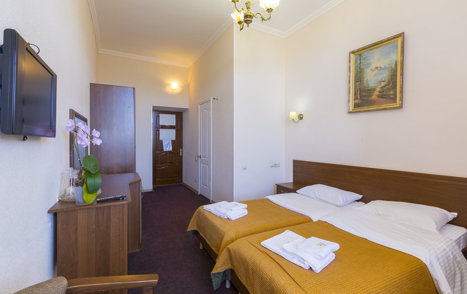 Это комфортные, светлые номера площадью 30 кв.м, которые подходят для проживания двух туристов. Апартаменты состоят из одной жилой комнаты и прихожей. Они хорошо оборудованы. Здесь стоит две отдельные кровати, две прикроватные тумбочки, комод и другая мебель. Все мебель красивая, тёмного цвета. Интерьер оформлен в бежевых тонах.