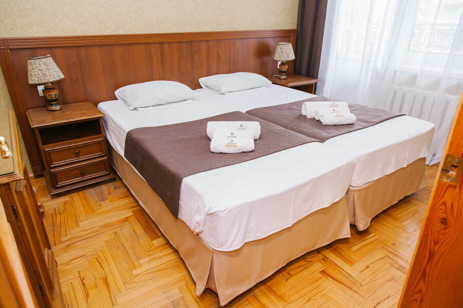 Комфортные номера площадью 15 кв.м, которые подходят для проживания двух туристов. Комнаты хорошо оборудованы. Здесь имеется две кровати, две тумбочки, шкаф и другая мебель.