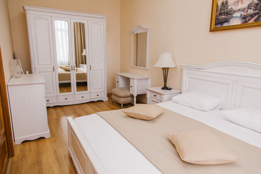 Шикарные, светлые номера площадью 56 кв.м, в них могут проживать от двух до пяти туристов. В апартаментах имеется две спальни, гостиная и прихожая. Они хорошо оборудованы. В каждой спальне стоит по одной двуспальной кровати, тумбочки и шкаф-купе. В гостиной имеется стенка и мягкая мебель. В прихожей имеется встроенный платяной шкаф. В номере имеется настенный ж/к телевизор, DVD, сейф и другая техника. Также для гостей предоставляется комплект посуды и швейный набор.