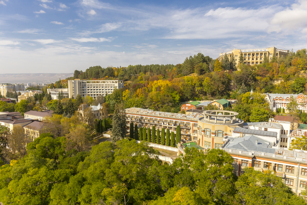 Самолетом до аэропорта г. Минеральные Воды, далее на маршрутном такси №11 до остановки «ПАТП», далее на маршрутном такси №107 до остановки «Площадь Ленина», далее пройти пешком 860 м санатория.