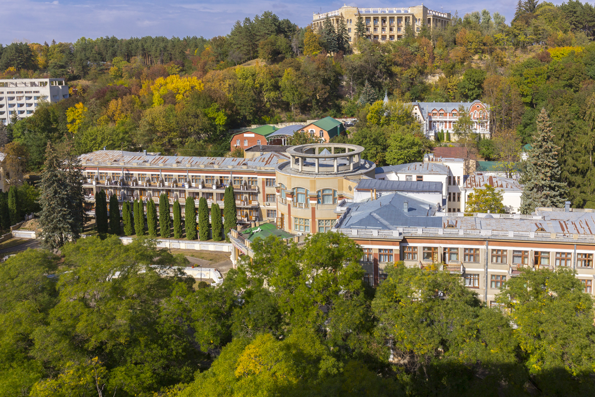 Пансионат расположен в центре курортного парка, недалеко от минерального источника. В ста метрах от пансионата находится бювет с питьевой водой. Пансионат занимает большую территорию. В парке растут вечнозеленые растения и хвойные деревья, имеются прекрасные аллеи и скамейки для отдыха. Пансионат представлен двумя корпусами: главным и лечебным корпусом.