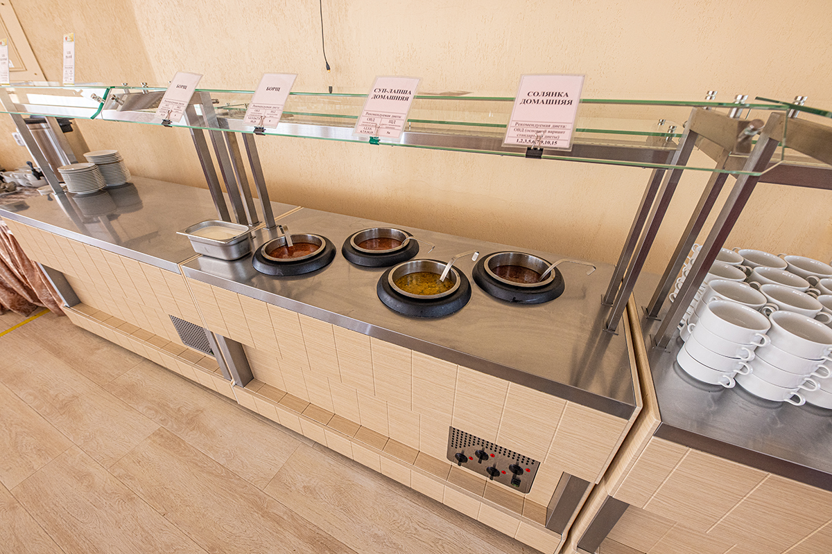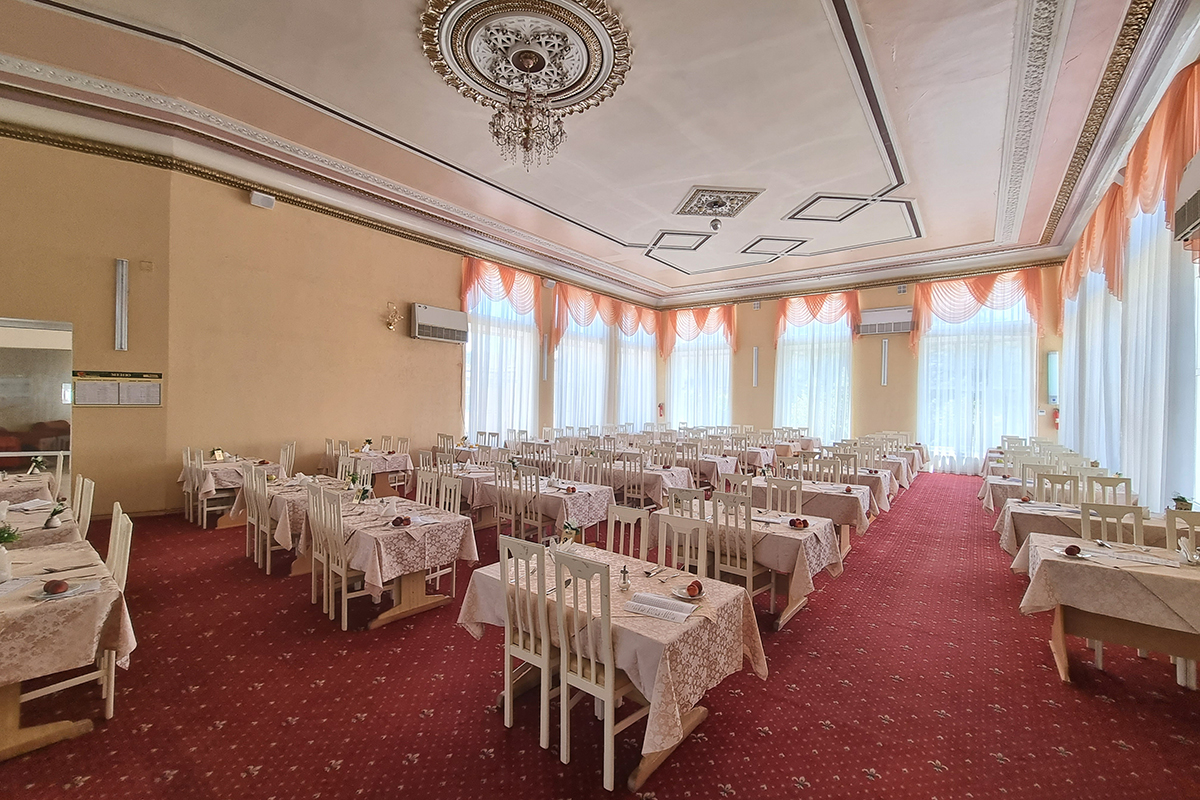 Пунктов питания в санатория два: столовая и обеденный зал. Зал столовой — это просторное кондиционированное помещение с высокими потолками и большими окнами для питания постояльцев всех категорий номеров. Обеденный зал является отдельной от столовой площадкой. Тут питаются проживающие в номерах категории «Люкс».