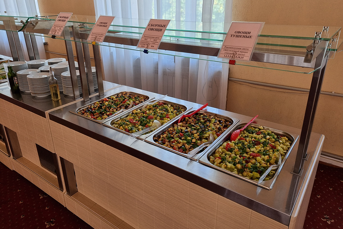 Питание в санатории — это вкусные и полезные блюда. Представлен широкий выбор горячих и холодных блюд, закусок, гарниров, супов, салатов и напитков. Гости могут выбирать по заказному меню блюда из основного раздела и диетического. Последнее меню разработано профессиональными диетологами для комплексного лечения.
