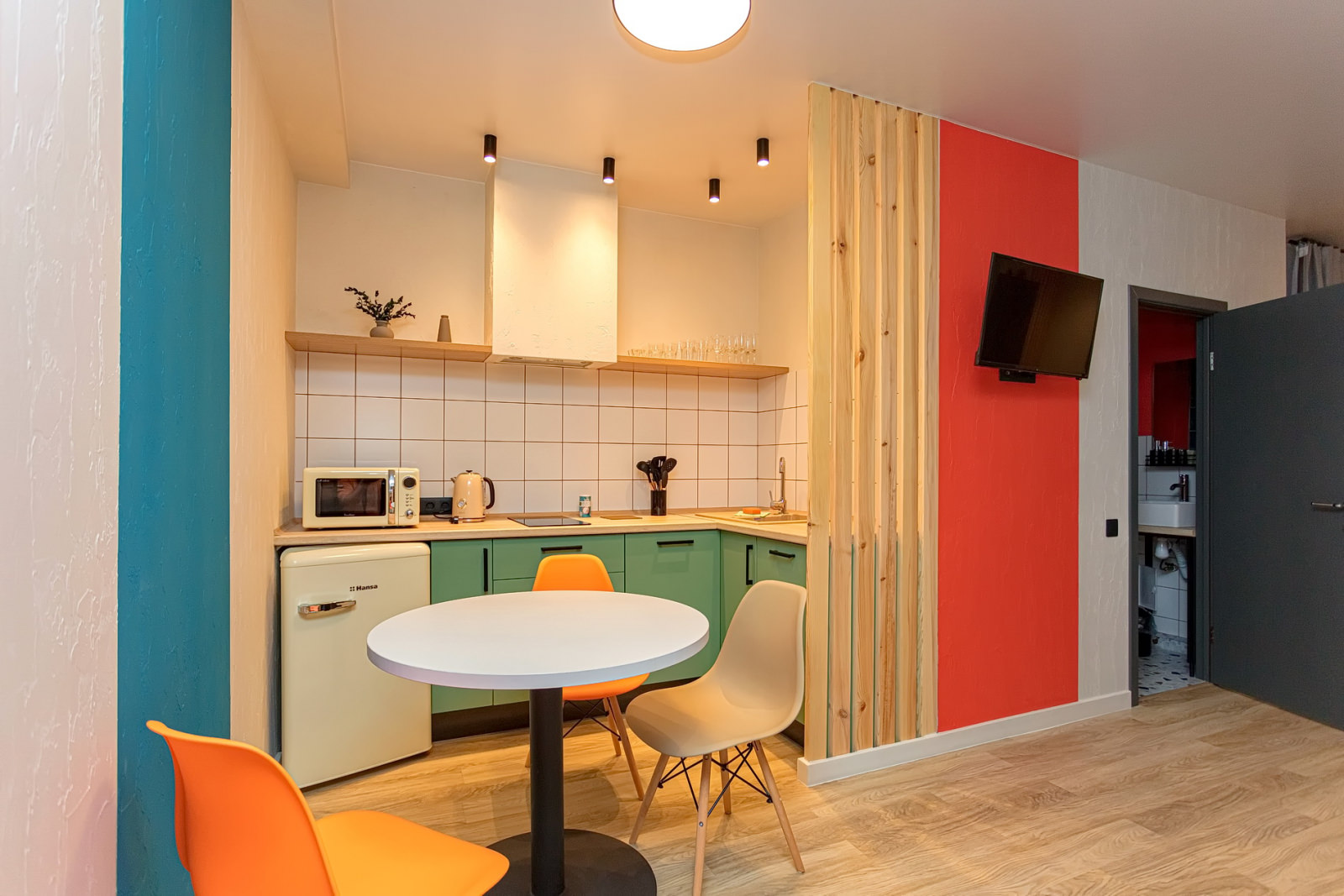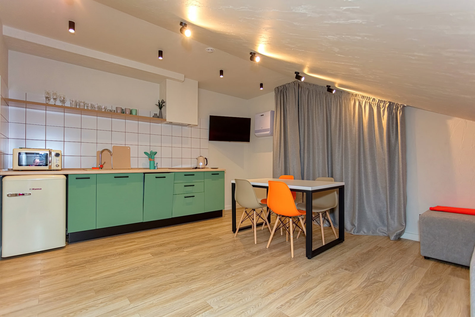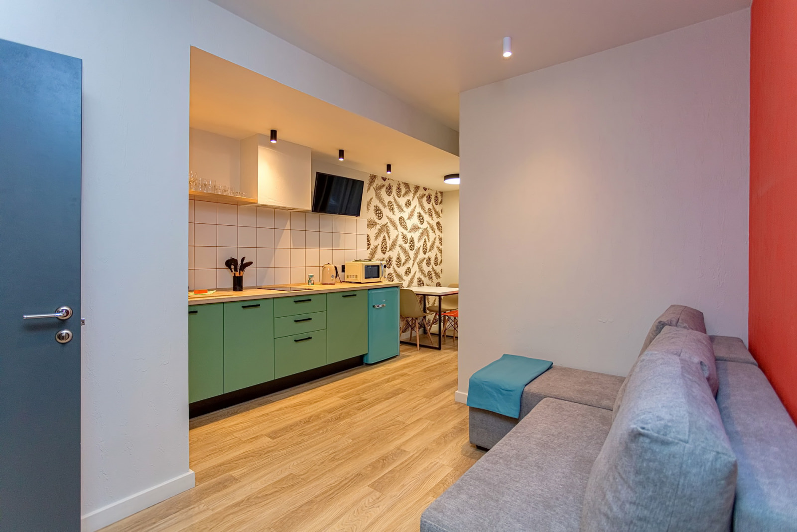 Площадь номера - 24 кв.м. 2 осн. места. 1 доп. место. Кухня. Мебель: кровати односпальные /одна двуспальная кровать, прикроватные тумбочки, стол (на кухне), стулья (на кухне), шкаф. Оборудование: микроволновая печь (на кухне), набор посуды (на кухне), плита электрическая (на кухне), телевизор, холодильник (на кухне), электрочайник. Санузел. Сервис: Wi-Fi бесплатно, смена полотенец, смена постельного белья, уборка номера.