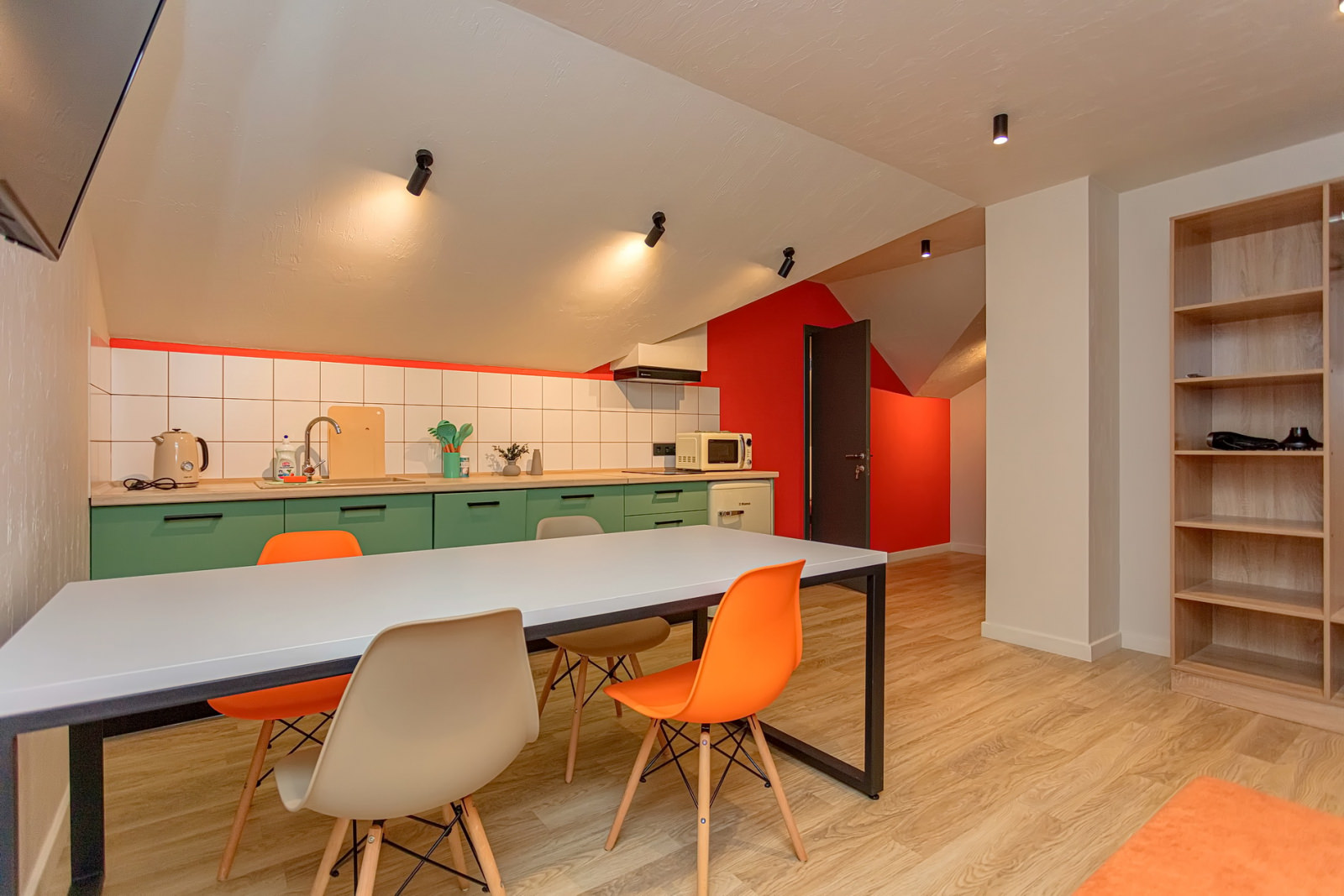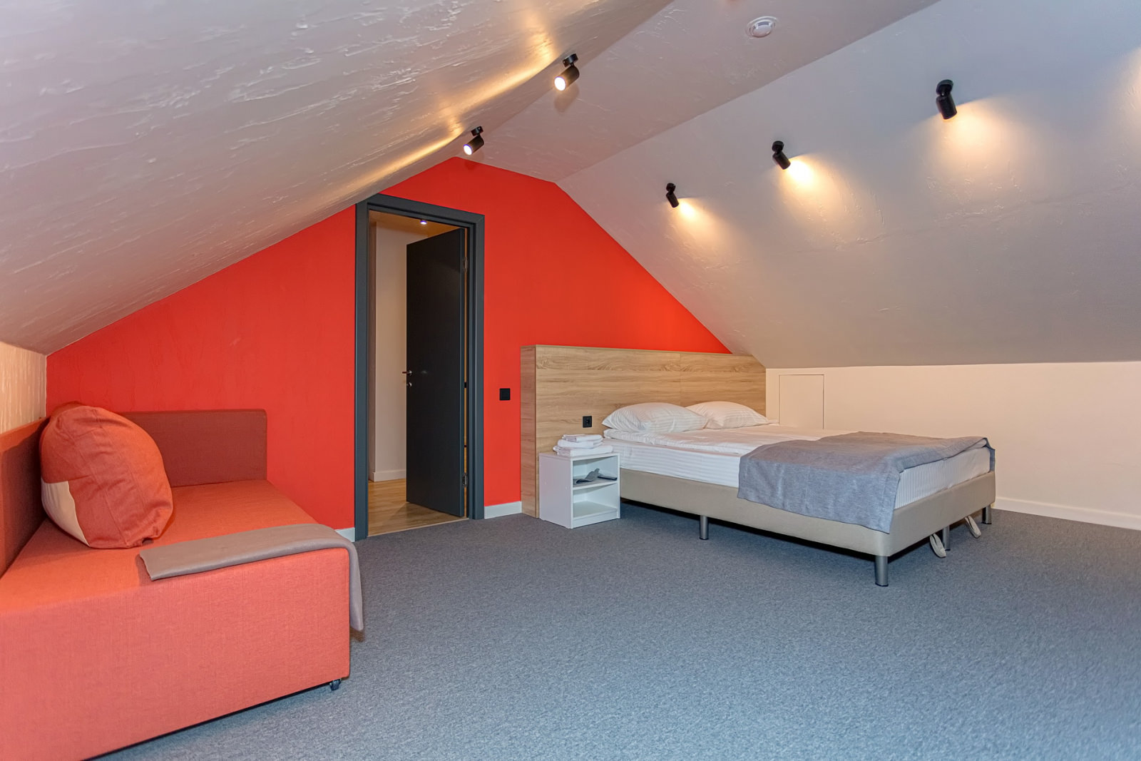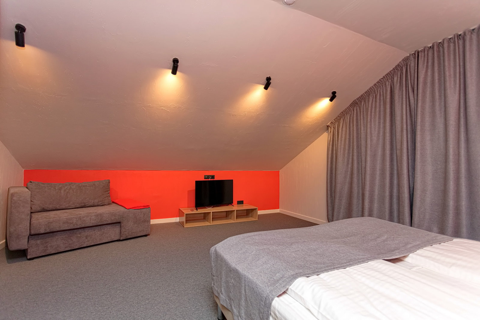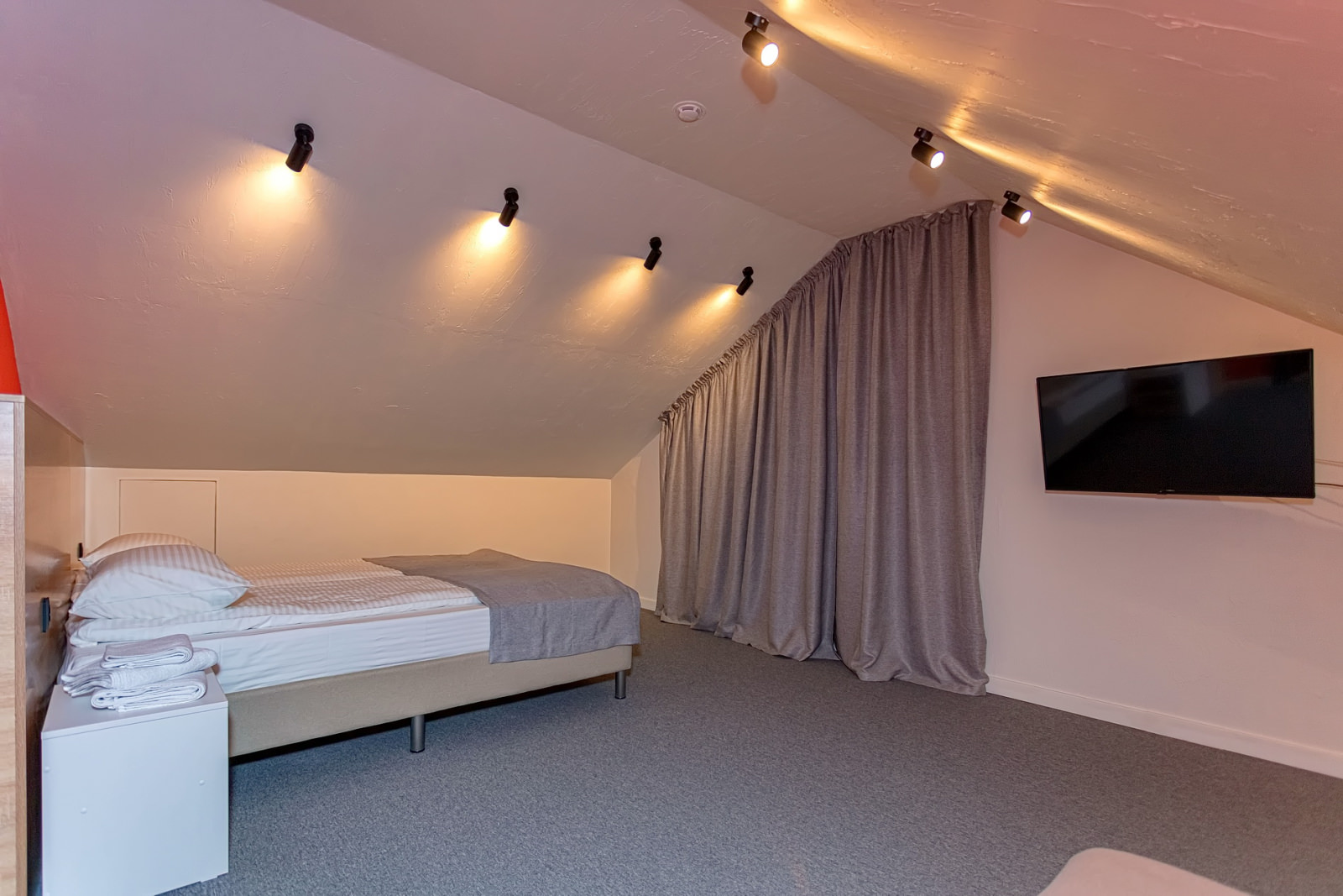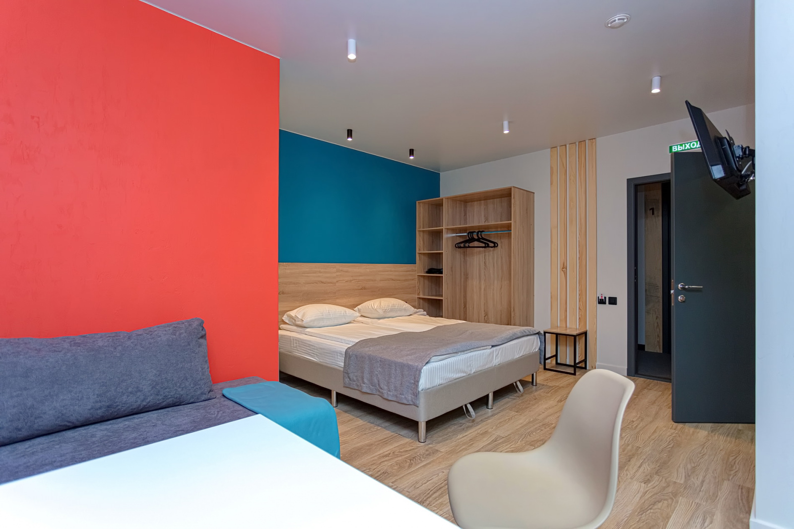 Площадь номера - 72 кв.м. 4 осн. места. 4 доп. места. Кухня. Мебель: диван раскладной (2 шт.), кровати односпальные /одна двуспальная кровать, кровать двуспальная, прикроватные тумбочки, стол (на кухне), стулья (на кухне), шкаф. Оборудование: микроволновая печь (на кухне), набор посуды (на кухне), плита электрическая (на кухне), телевизор, холодильник (на кухне), электрочайник (на кухне). Санузел. Сервис: Wi-Fi бесплатно, смена полотенец, смена постельного белья, уборка номера.
