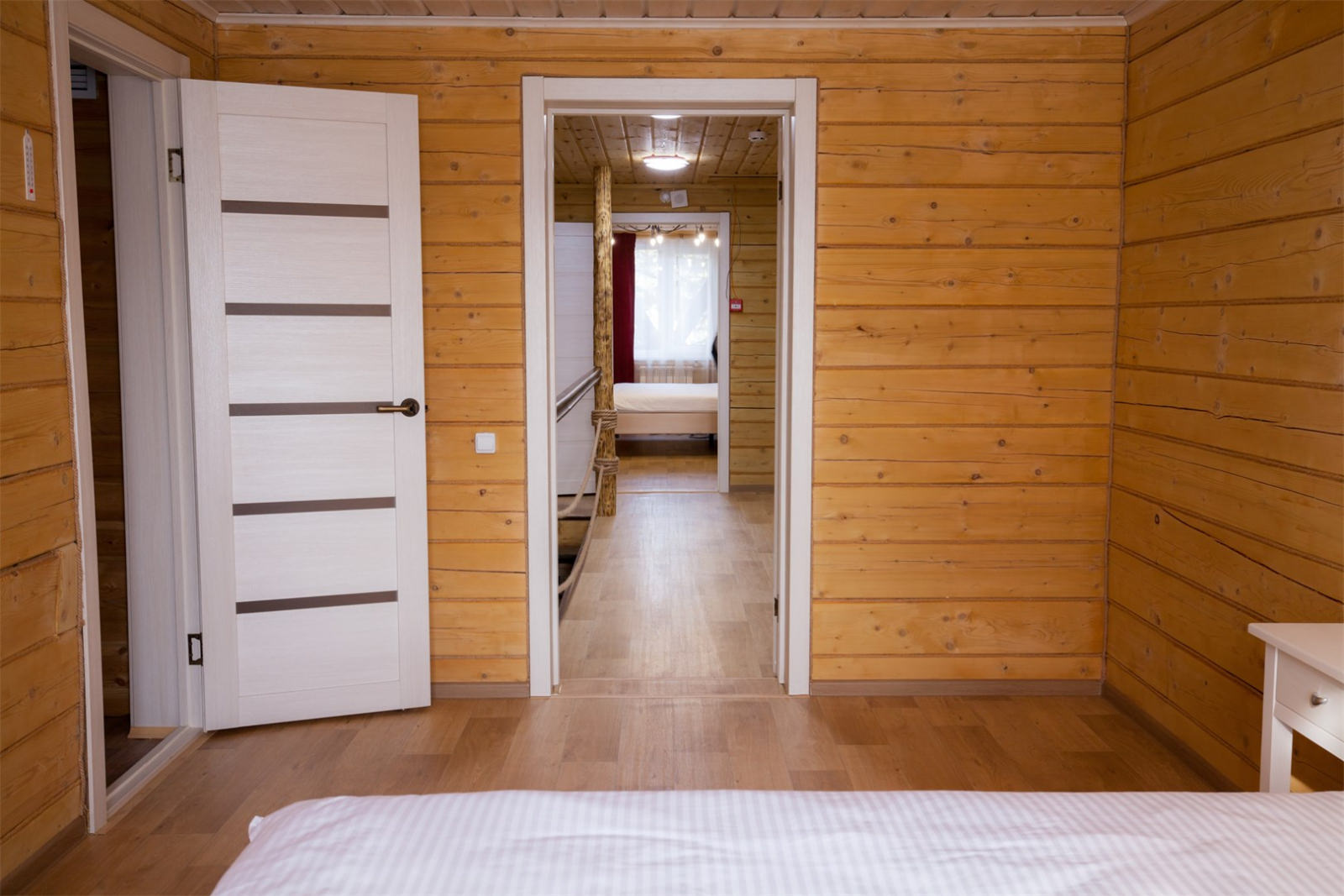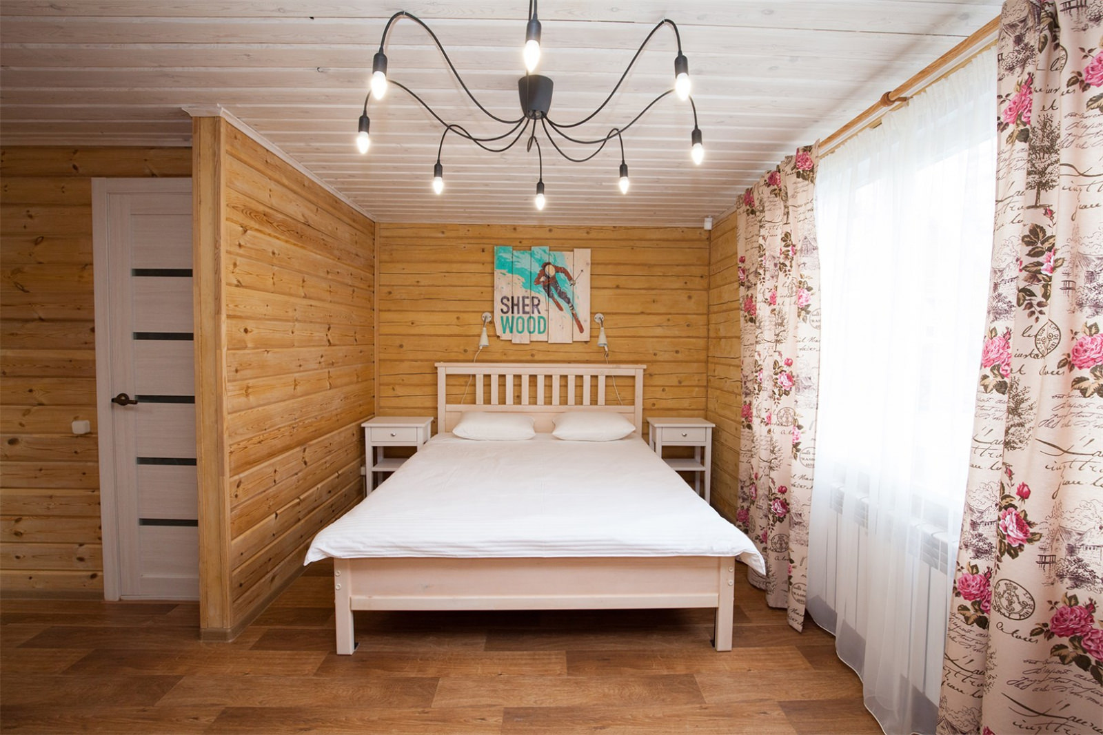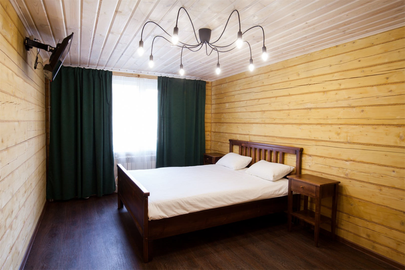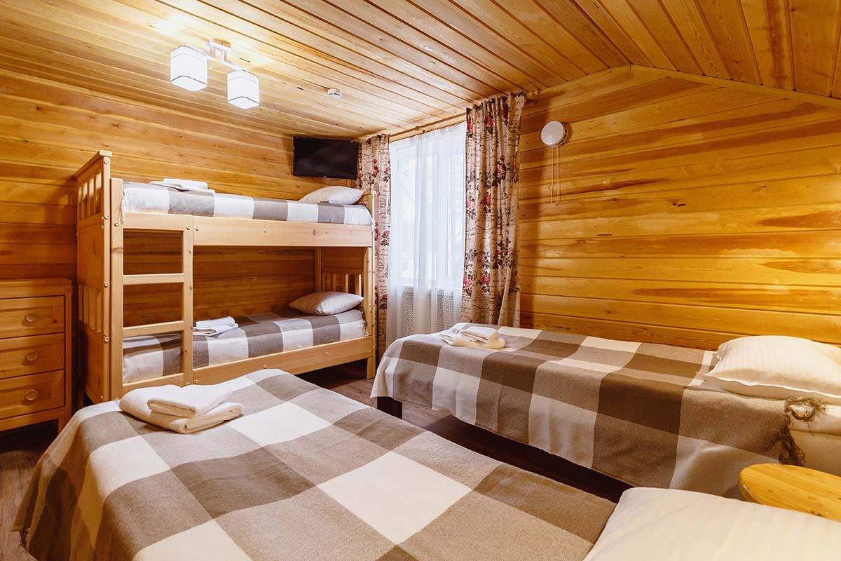 Площадь номера - 90 кв.м. 8 осн. мест. Кухня. Мебель: вешалка, диван раскладной (2 шт. (в гостиной и спальне)), комод, кровати односпальные (4 шт.), кровать двухъярусная, прикроватные тумбочки, стол, стулья. Оборудование: микроволновая печь, набор посуды, плита электрическая, телевизор, холодильник, электрочайник. Санузел: с душевой кабиной, тапочки, туалетные принадлежности, фен. Сервис: Wi-Fi бесплатно, смена полотенец, смена постельного белья, уборка номера.