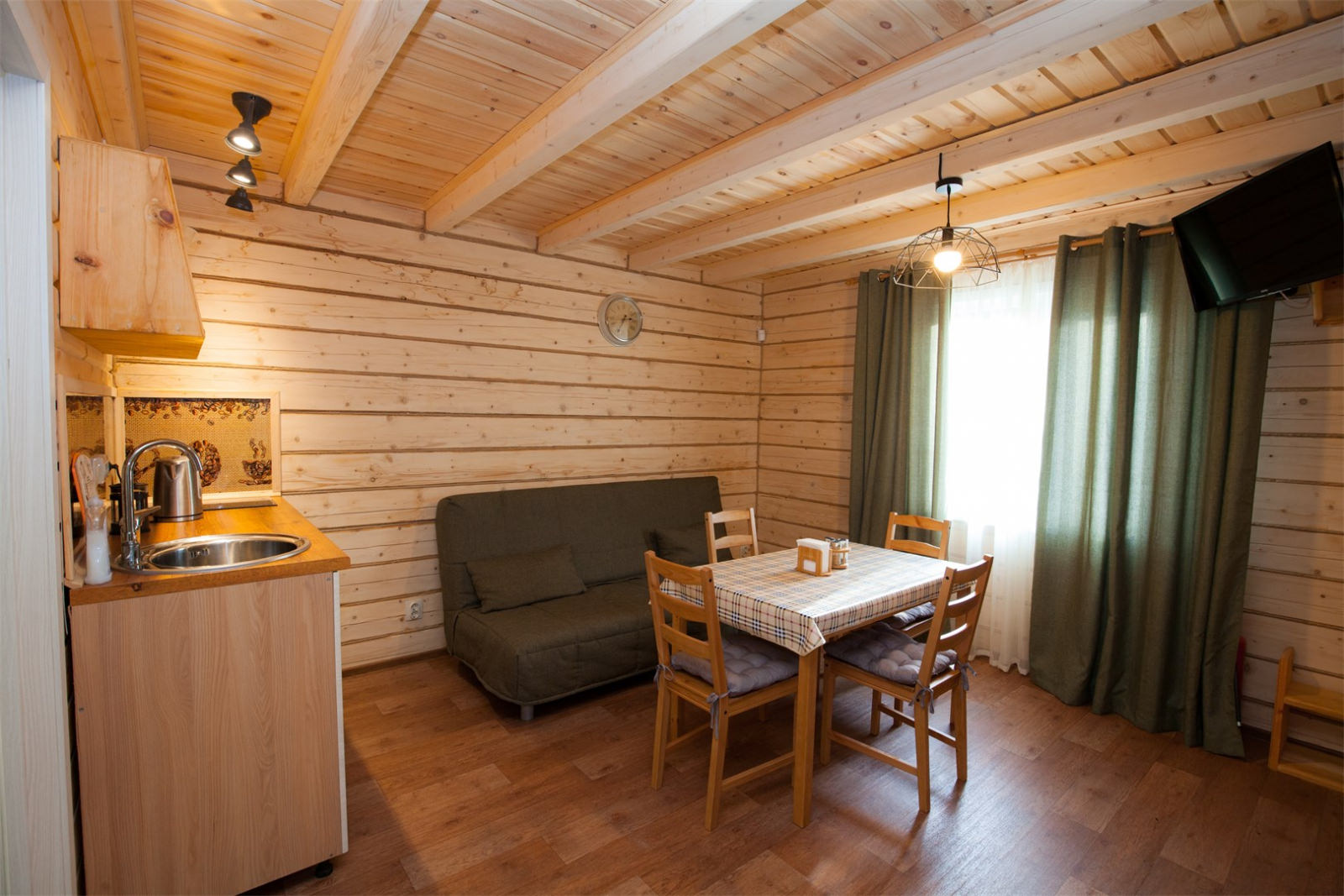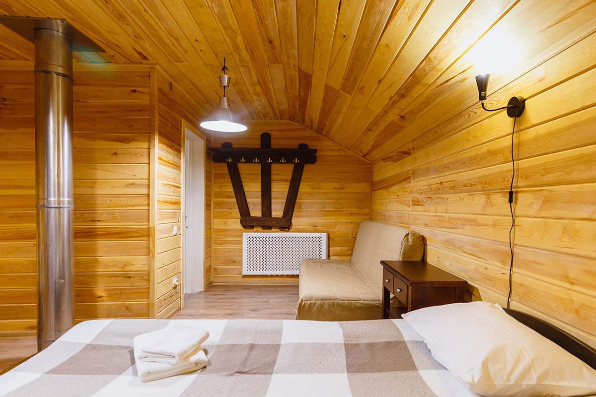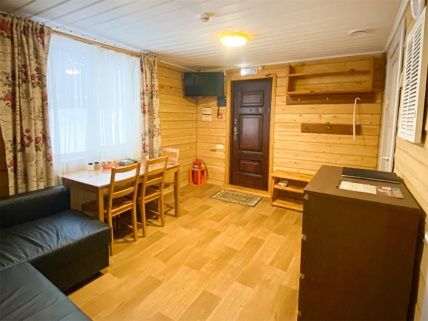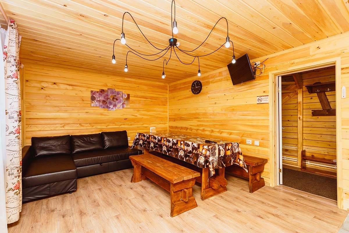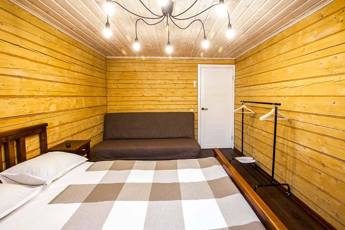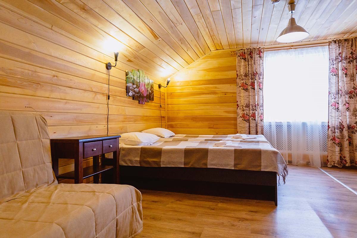 Площадь номера - 30 кв.м. 2 осн. места. 2 доп. места. Кухня. Мебель: вешалка, диван раскладной, комод, кровать двуспальная, прикроватные тумбочки, стол, стулья. Оборудование: микроволновая печь, набор посуды, плита электрическая, телевизор, холодильник, электрочайник. Санузел: сауна, с душевой кабиной, тапочки, туалетные принадлежности, фен. Сервис: Wi-Fi бесплатно, смена полотенец, смена постельного белья, уборка номера.