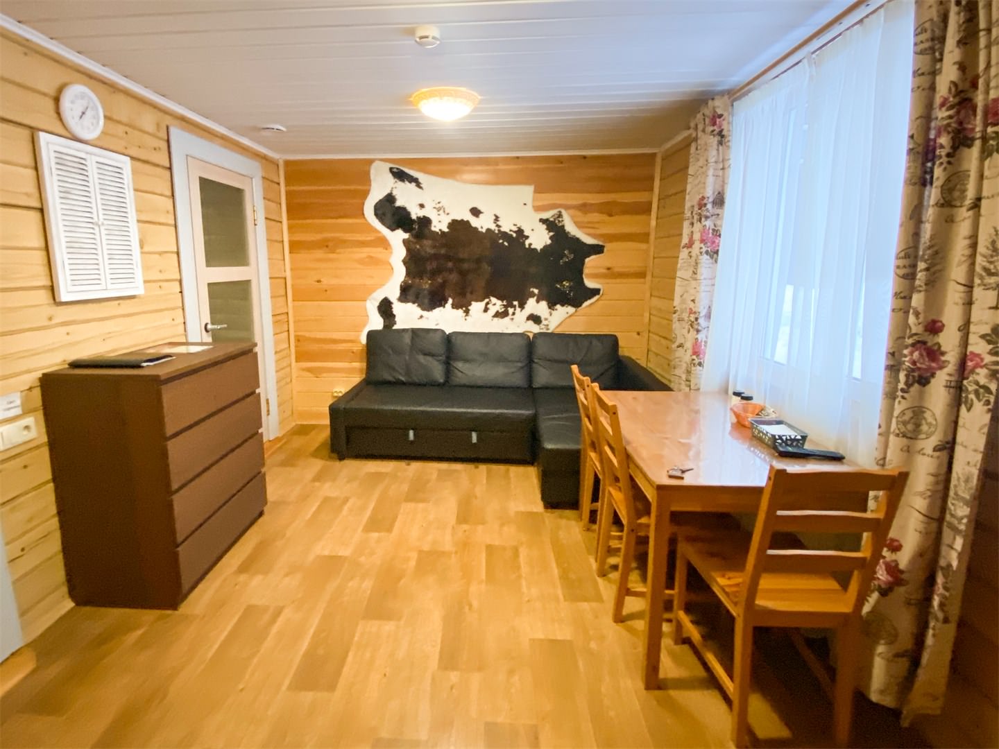 Площадь номера - 50 кв.м. 4 осн. места. 2 доп. места. Кухня. Мебель: вешалка, диван раскладной, комод, кровать двуспальная (2 шт.), прикроватные тумбочки, стол, стулья. Оборудование: микроволновая печь, набор посуды, плита электрическая, телевизор, холодильник, электрочайник. Санузел: с душевой кабиной, тапочки, туалетные принадлежности, фен. Сервис: Wi-Fi бесплатно, смена полотенец, смена постельного белья, уборка номера.