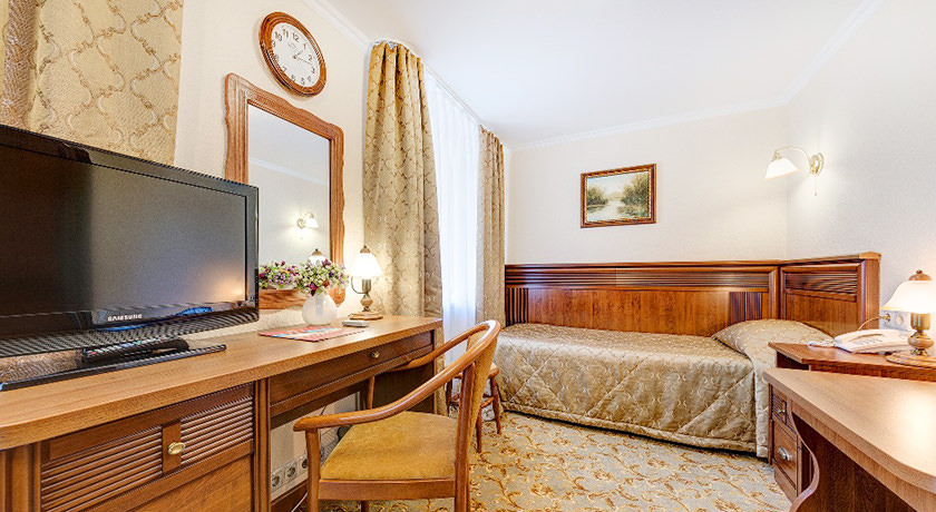 Мебель в номере: односпальная кровать, прикроватная тумба, шкаф, рабочий стол, журнальный стол, стул, мягкий табурет, зеркало.