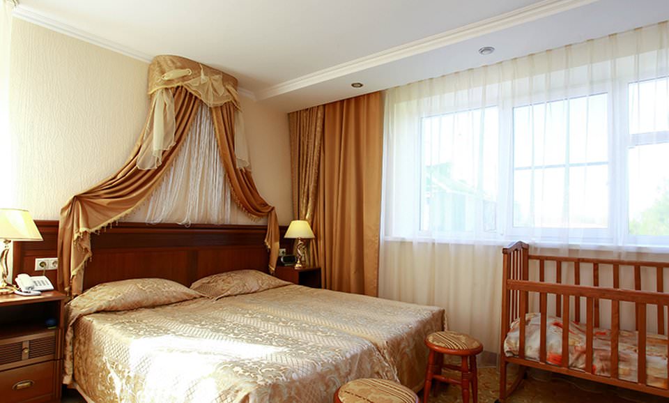 Мебель: две односпальные кровати или двуспальная кровать, раскладной диван, прикроватные тумбы, банкетки, шкаф, рабочий стол, журнальный стол, стулья, зеркало.
