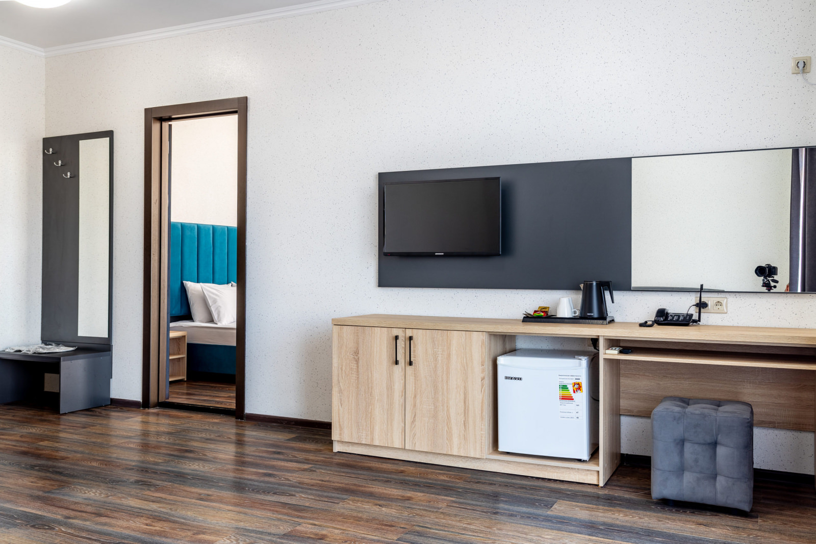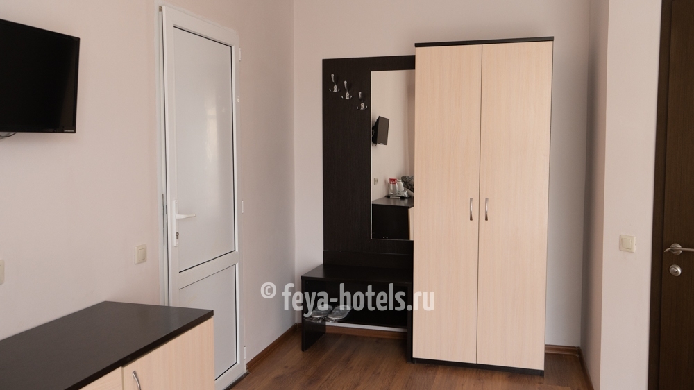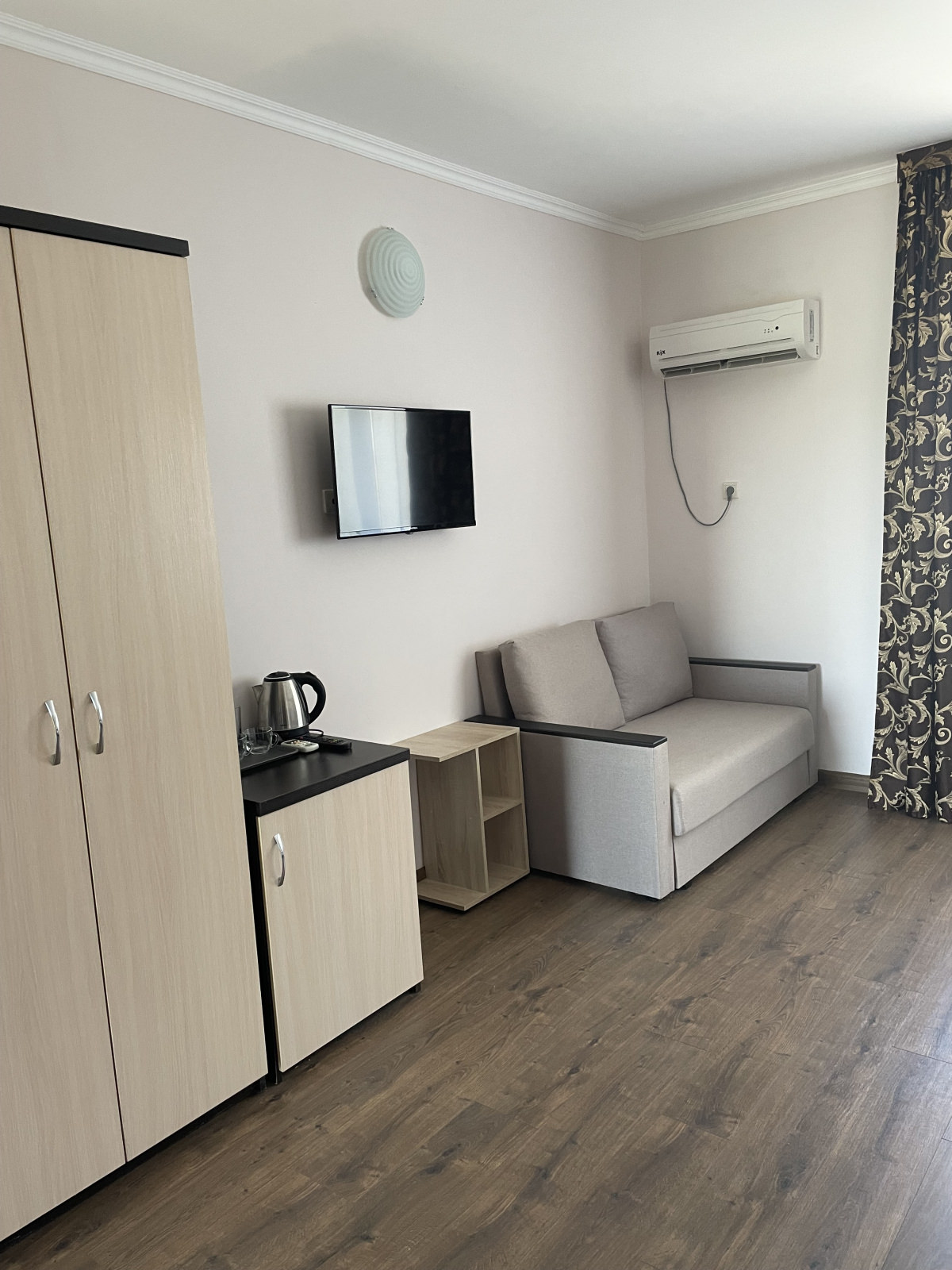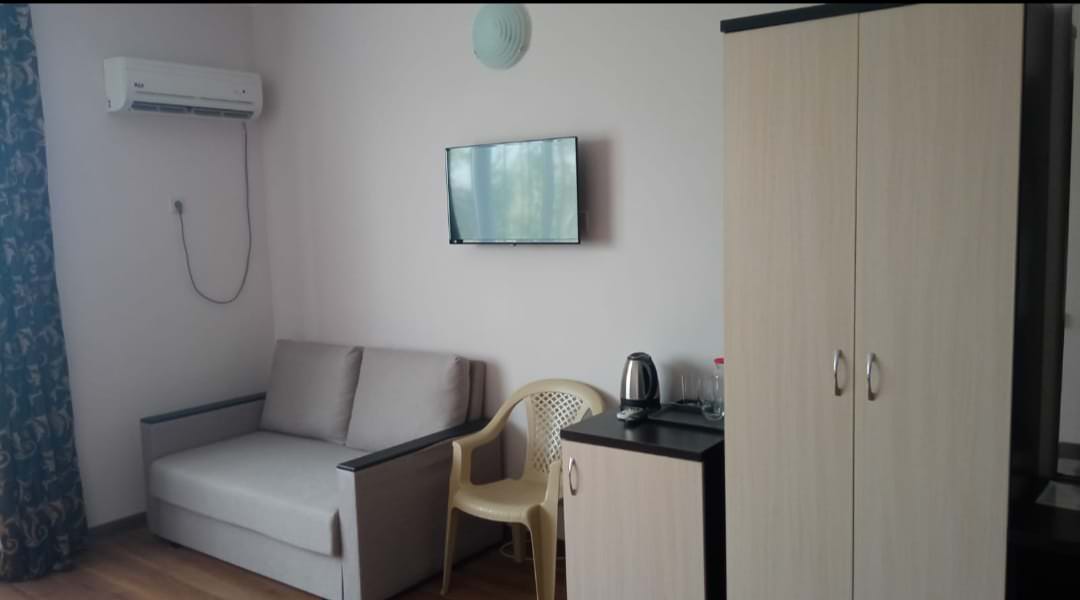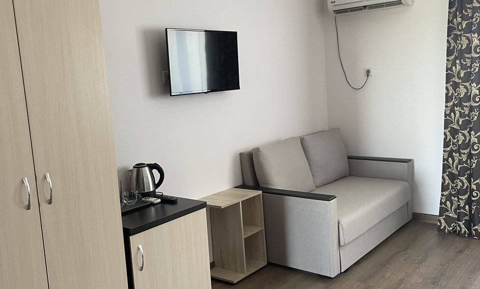 В номере: 2 раздельные кровати с возможностью сдвижения, прикроватные тумбочки, шкаф, столик, кондиционер, телевизор, холодильник, электрочайник.