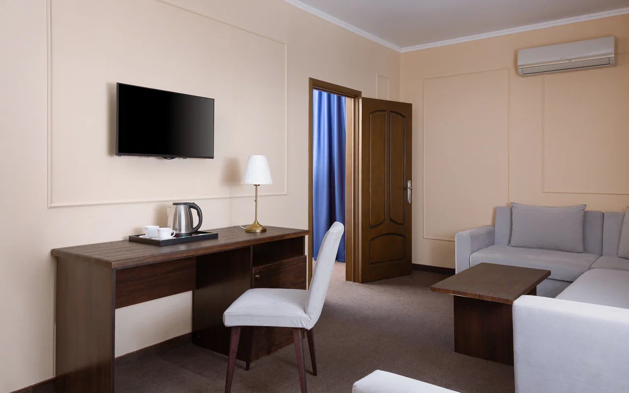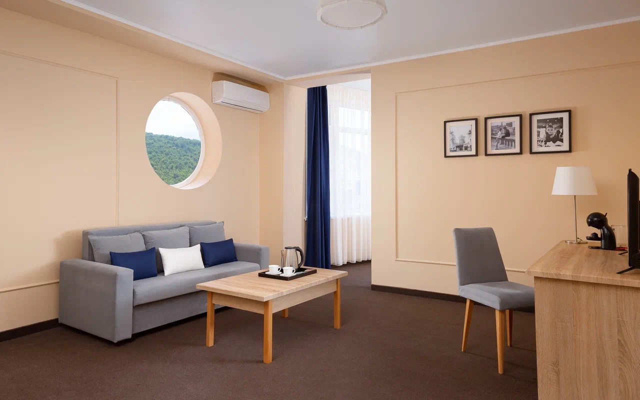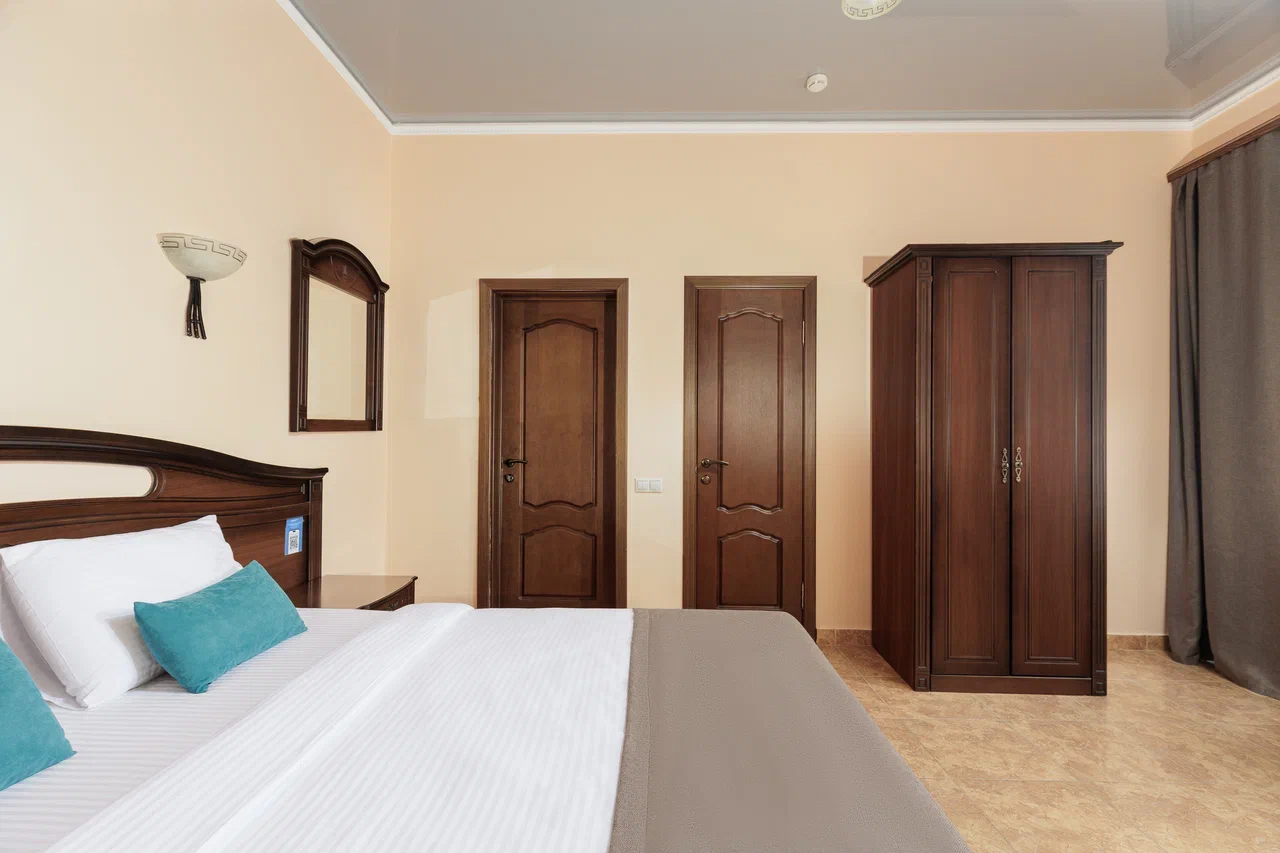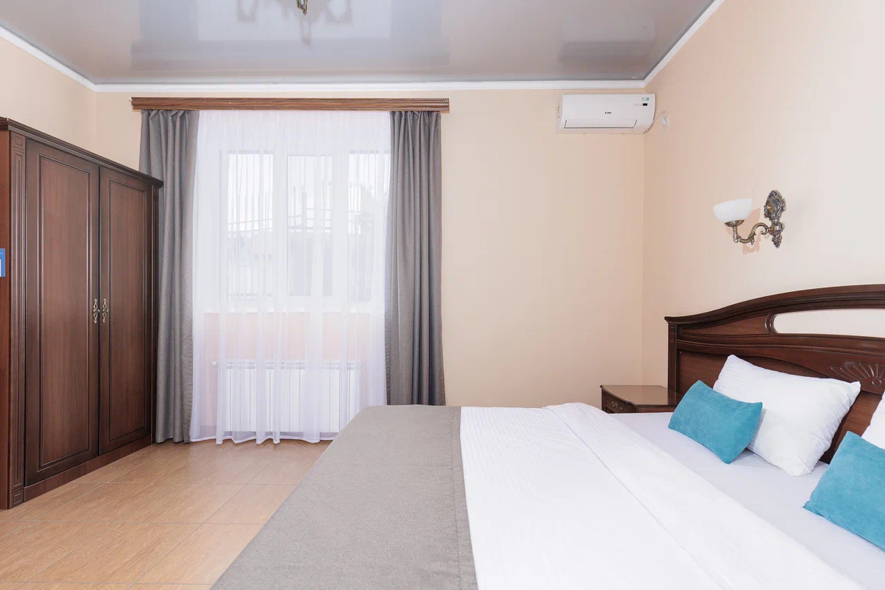 Площадь номера - 60 кв.м. 2 осн. места. 2 доп. места. Балкон. Мебель: вешалка, диван, зеркало, кровать двуспальная, прикроватные тумбочки, стол, стулья, шкаф. Мини-кухня. Оборудование: гладильная доска, микроволновая печь, мини-холодильник, набор посуды, сейф, сплит-система, телевизор ЖК, утюг, чайный набор посуды, электрочайник. Санузел: с душем, тапочки, туалетные принадлежности, фен, халат. Сервис: Wi-Fi бесплатно, смена полотенец (1 раз в 3 дня), смена постельного белья (1 раз в 3 дня), уборка номера (ежедневно).