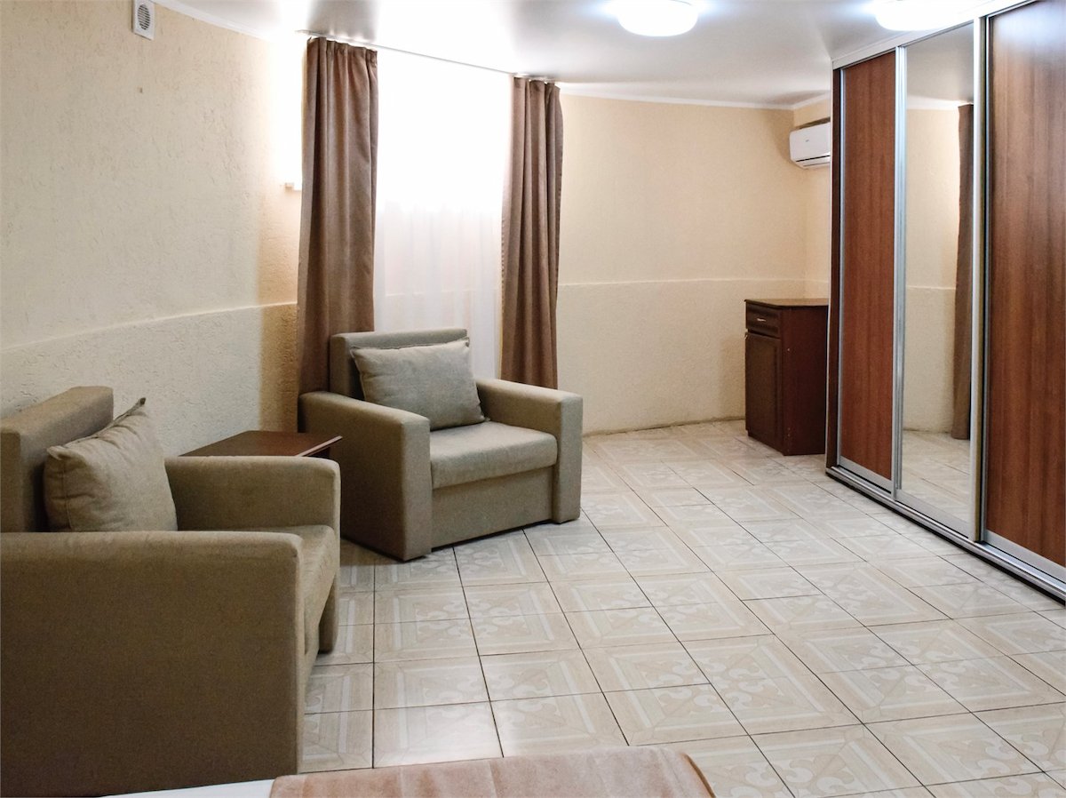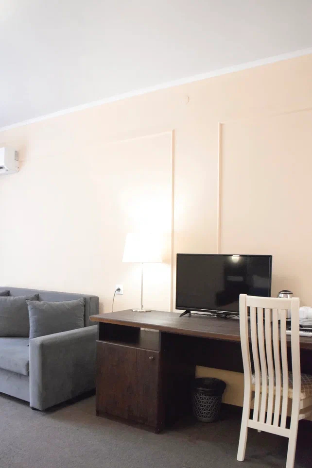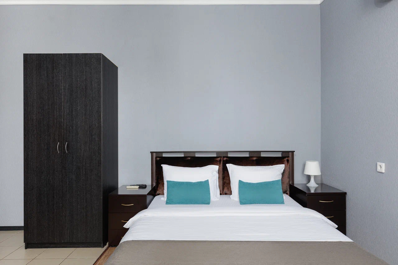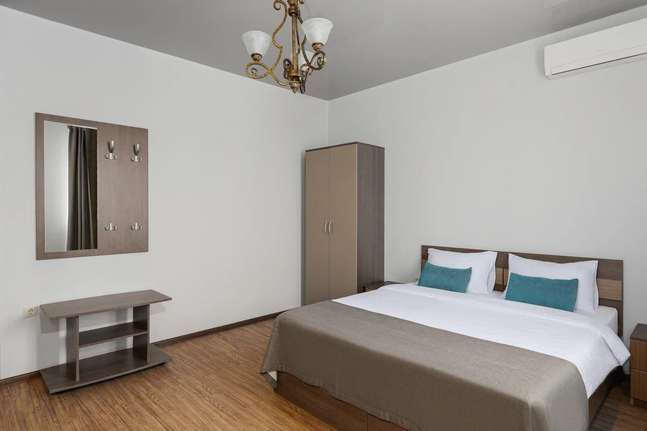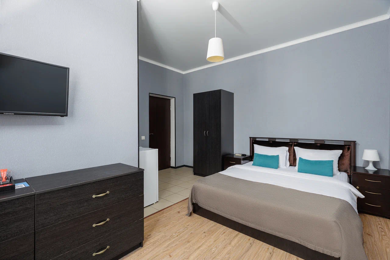 Площадь номера - 60 кв.м. 2 осн. места. 2 доп. места. Балкон. Мебель: вешалка, диван, зеркало, кровать двуспальная, прикроватные тумбочки, стол, стулья, шкаф. Мини-кухня. Оборудование: гладильная доска, микроволновая печь, мини-холодильник, набор посуды, сейф, сплит-система, телевизор ЖК, утюг, чайный набор посуды, электрочайник. Санузел: с душем, тапочки, туалетные принадлежности, фен, халат. Сервис: Wi-Fi бесплатно, смена полотенец (1 раз в 3 дня), смена постельного белья (1 раз в 3 дня), уборка номера (ежедневно).